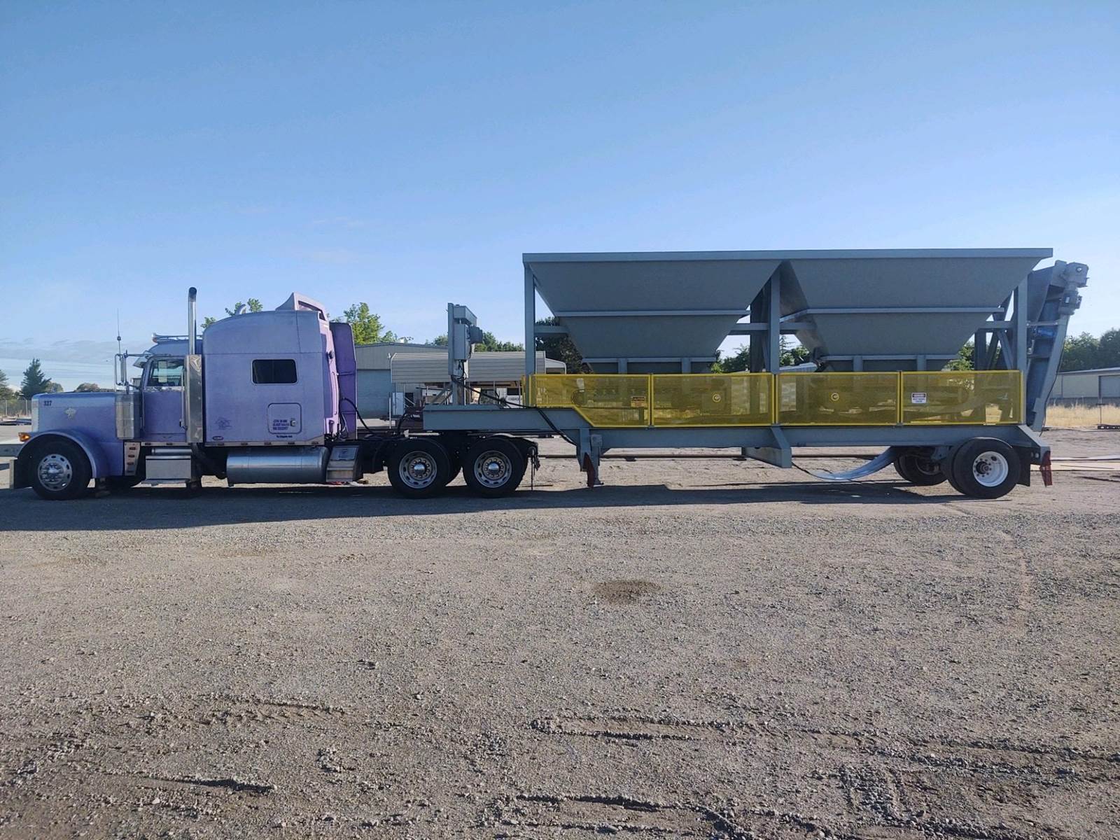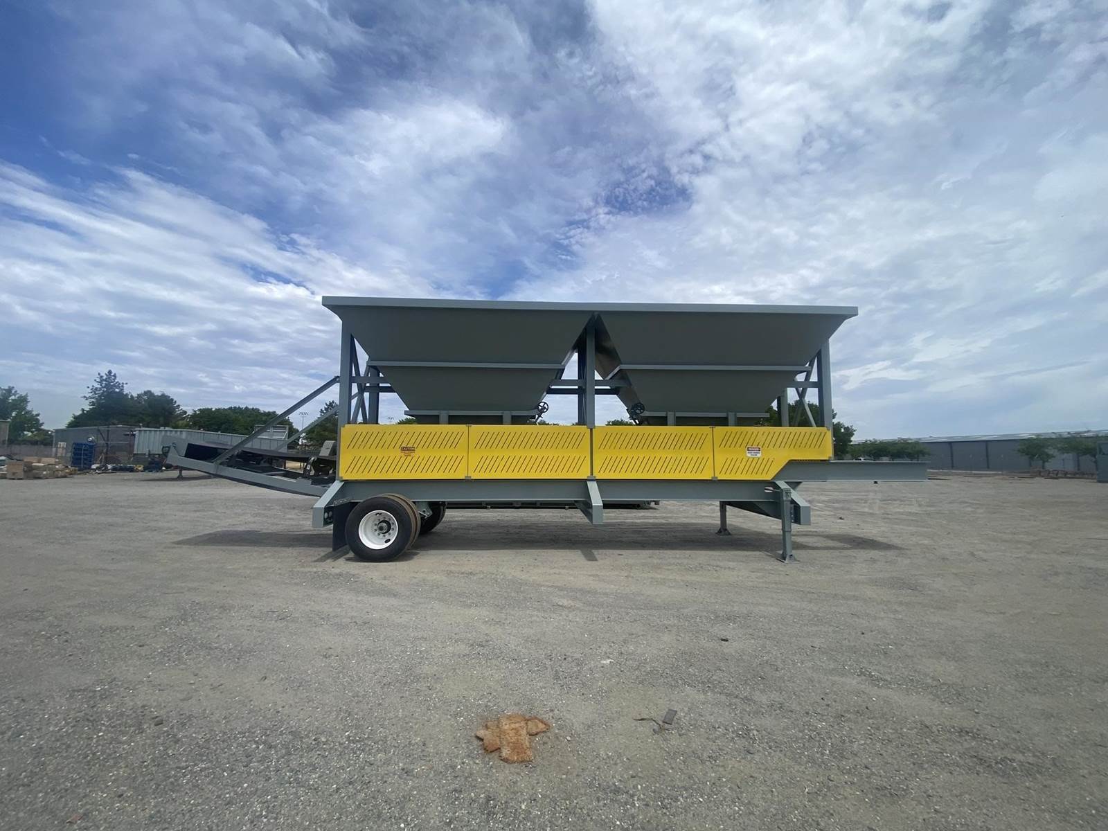 d. Portable trailer constructed of heavy duty wide flange beams which are braced for optimum rigidity; wide flange vertical beams and angle iron cross members tie all hoppers and trailer together; single axle chassis with dual 11 x 22.5 tires, air brakes, king pin, rear lighting, mud flaps and blocking pads. Includes one set of hand crank landing legs at the king pin.