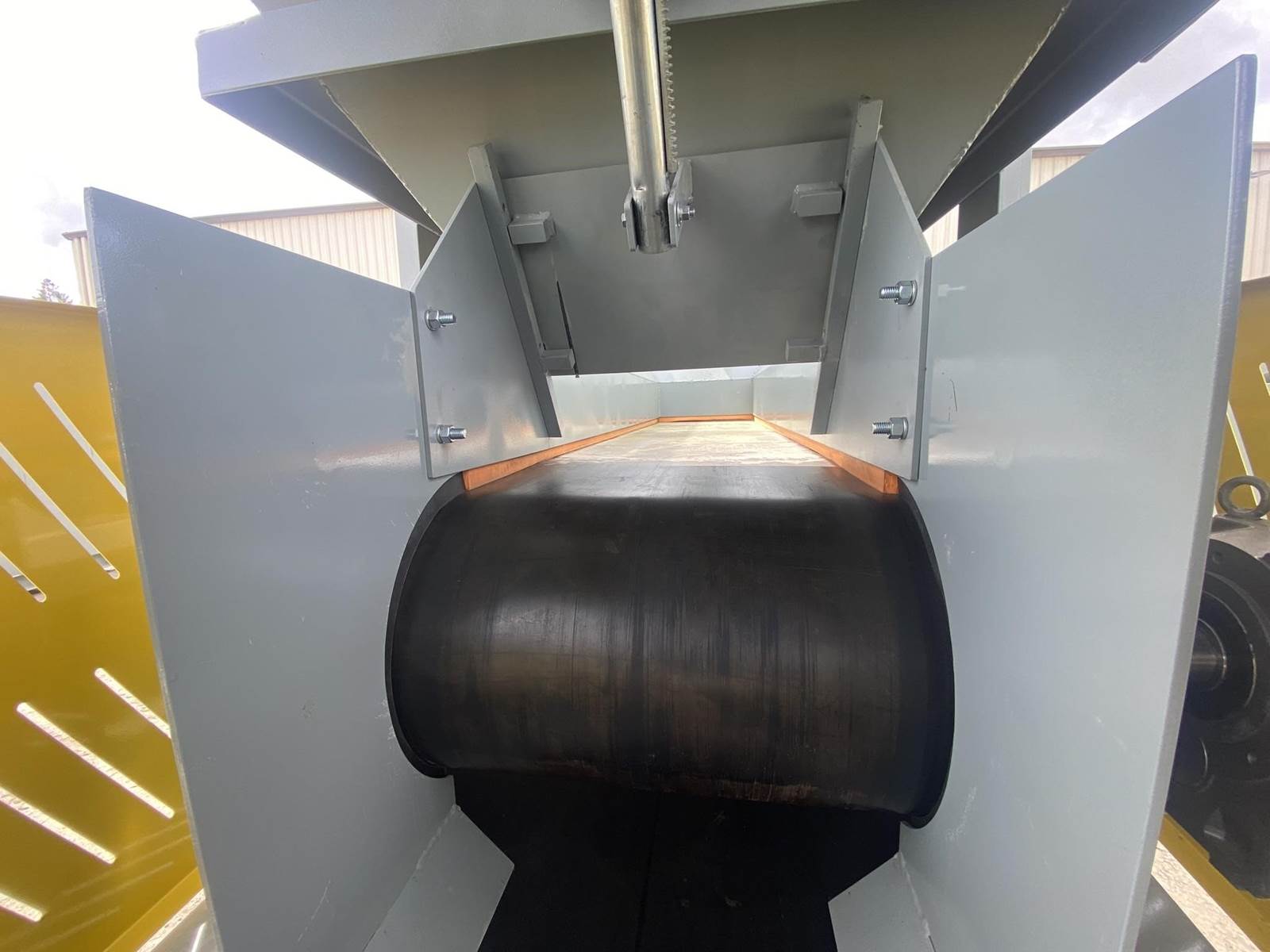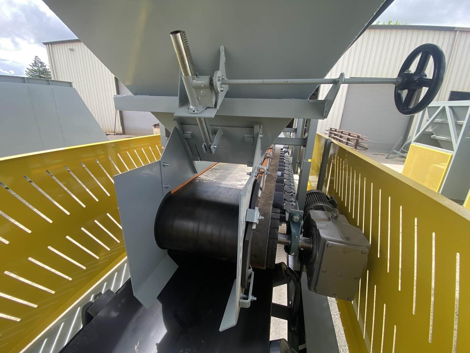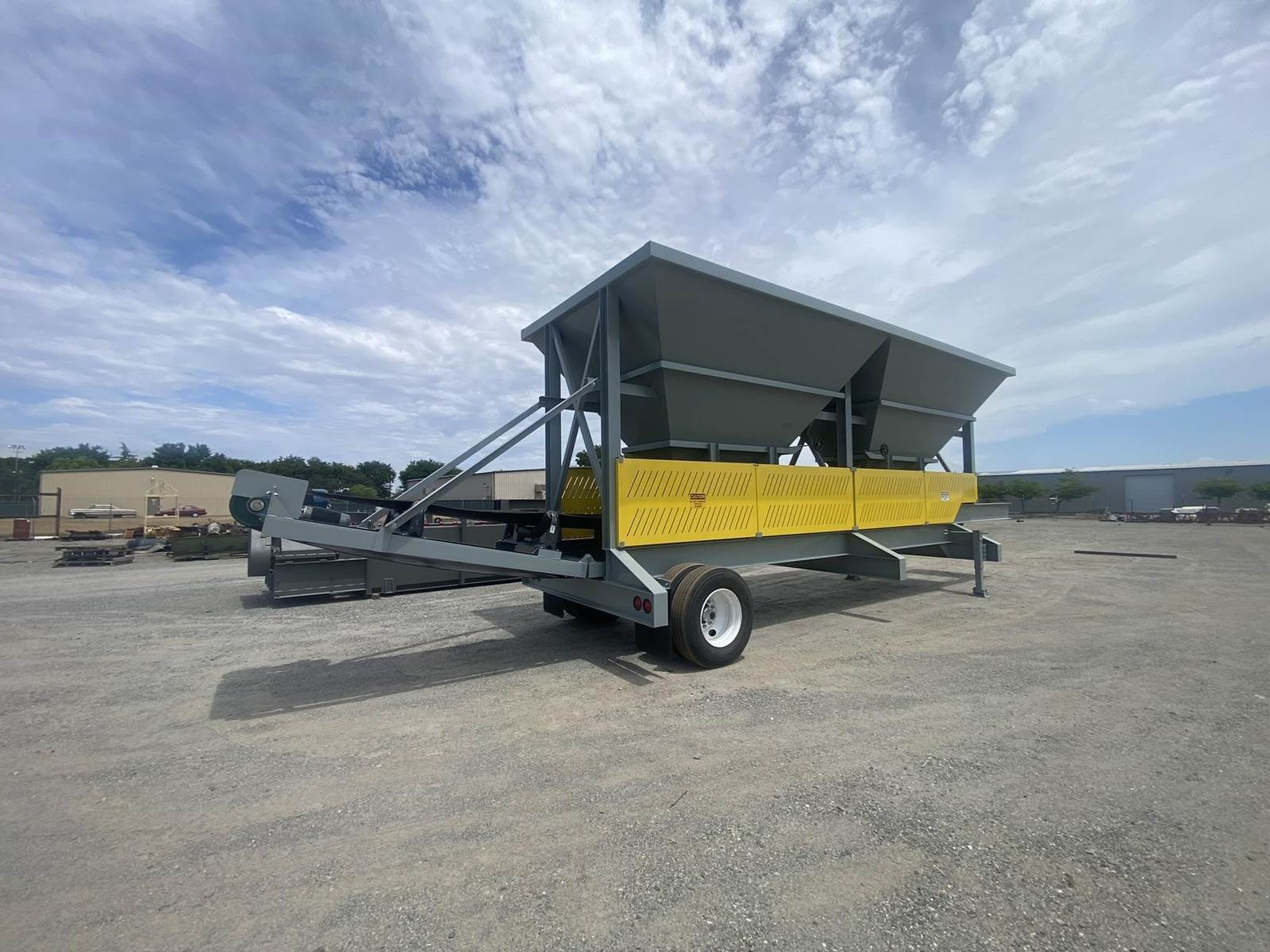a. Each hopper is 9’-6” wide x 14’ long with 20 tons storage capacity constructed from 1/4” thick steel plate with rectangle tube reinforcing at the hopper top and angle iron reinforcing at the hopper mid-section and bottom section; self-relieving tapered hopper bottom opening to minimize bridging; full length skirtboards with 3/4” x 6” adjustable rubber flashing to prevent leakage between hopper bottom and belt feeder; adjustable discharge gate with hand crank to control material flow from each hopper.