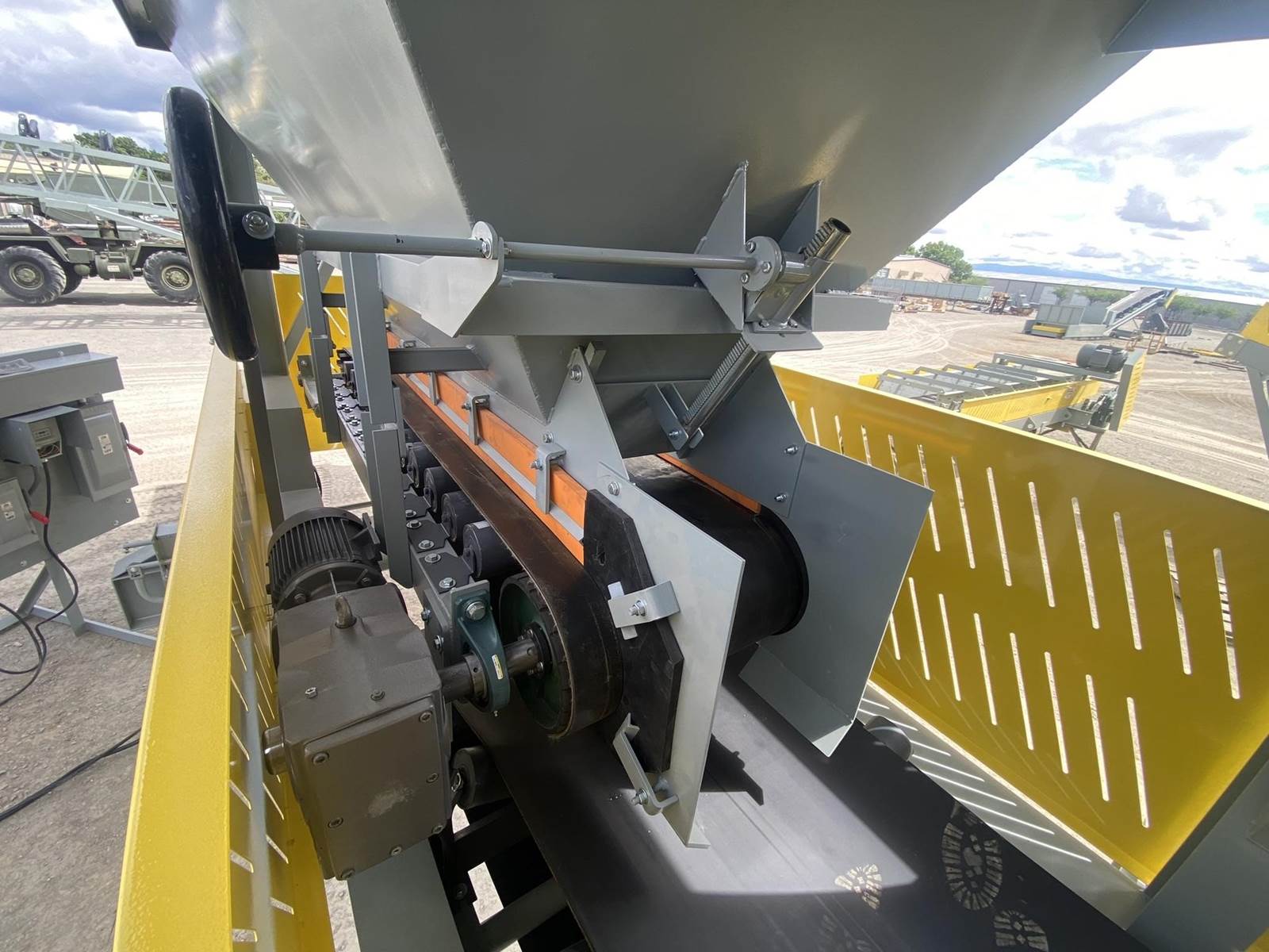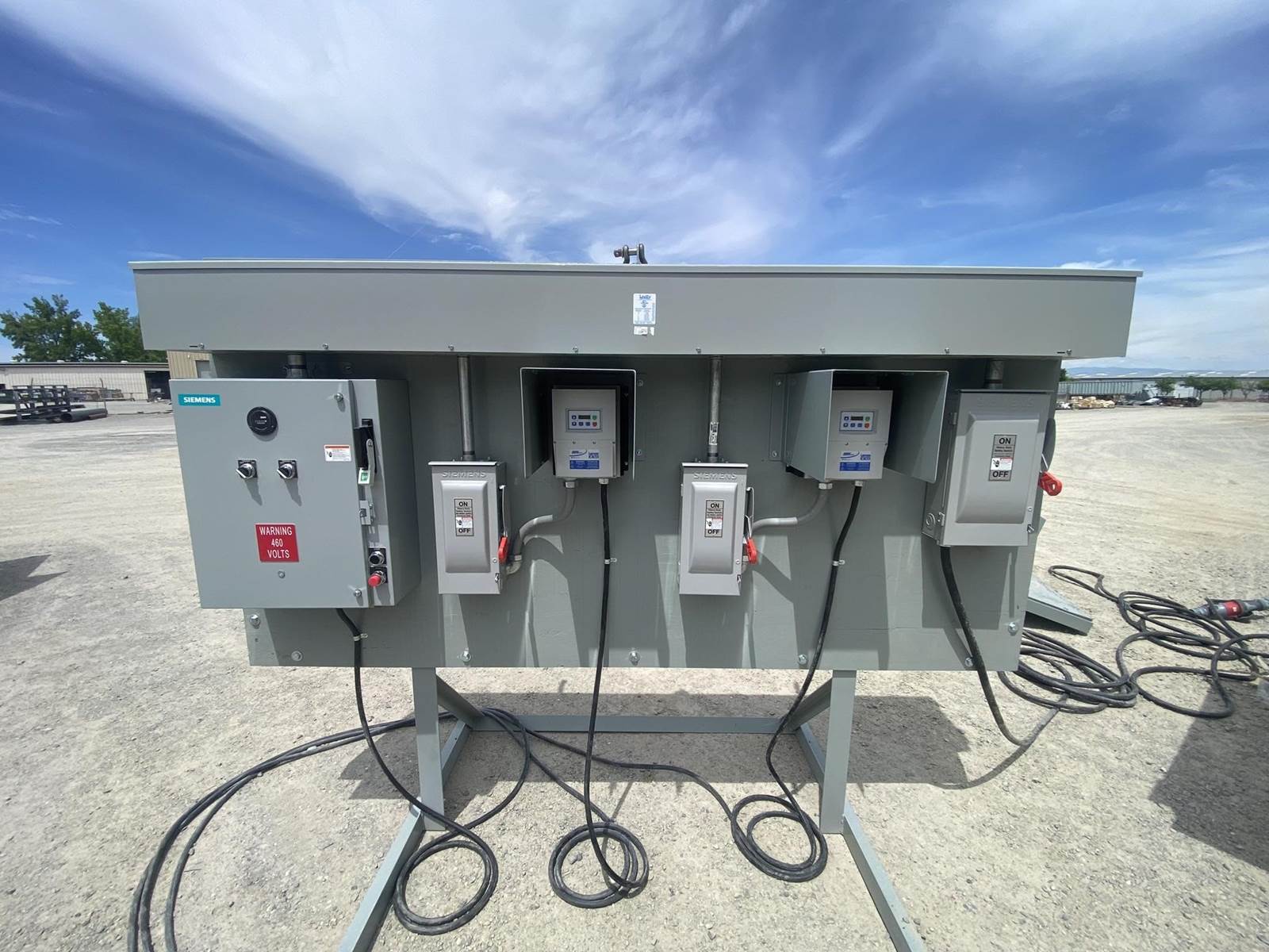 f. Electric motor control panel with main disconnect, AC Tech SMV variable speed drives for the belt feeders, branch circuit protection, fixed speed starter for the collecting conveyor, all mounted on a skid support structure bolted to the trailer frame and wired into the electric motors. All motors and electrical controls are 3 phase/460 volts/60 hertz.