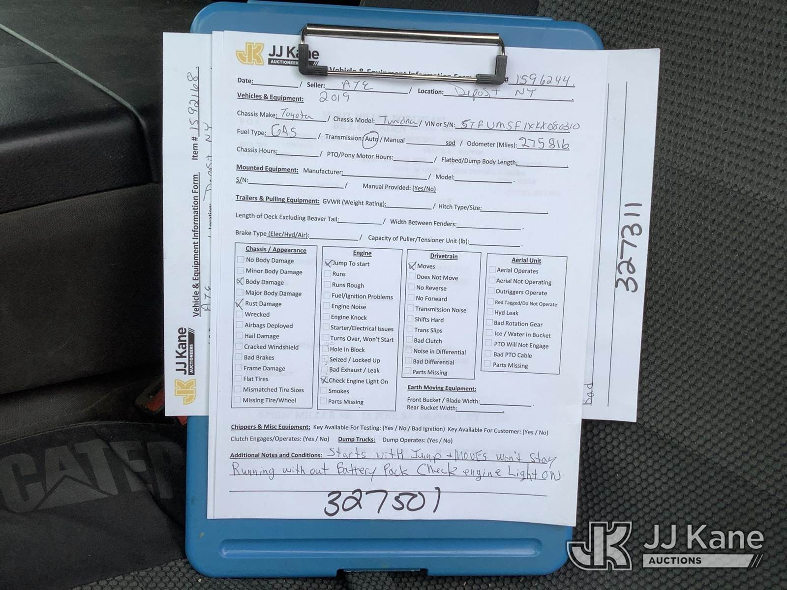 2019 Toyota Tundra 4x4 Extended-Cab Pickup Truck, 4.6L V8 DOHC 32V Gas, Auto, A/C, (275,816 miles) (Runs & Moves) (Jump To Start, Won't Stay Running, Condition Unknown, Check Engine Light On, Body Damage) (Seller States: Transmission Issues) This is a Titled Item NOTE: This unit is being sold AS IS/WHERE IS via Timed Auction and is located in Deposit, NY. Inspection & preview days for this unit are by appointment only; please contact us at contact@jjkane.com or 84-Go-JJKane for more details. (Buyer is responsible for removal. Assistance by consignor or JJ Kane Auctions is not assured.)