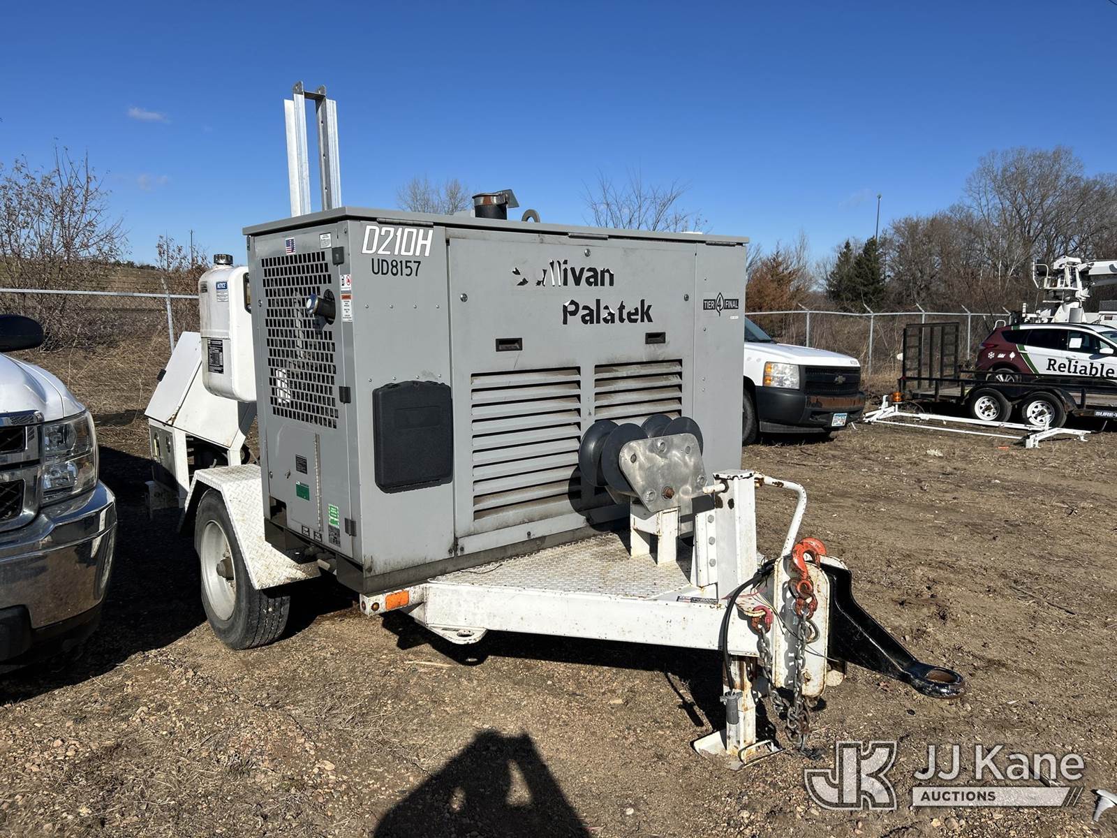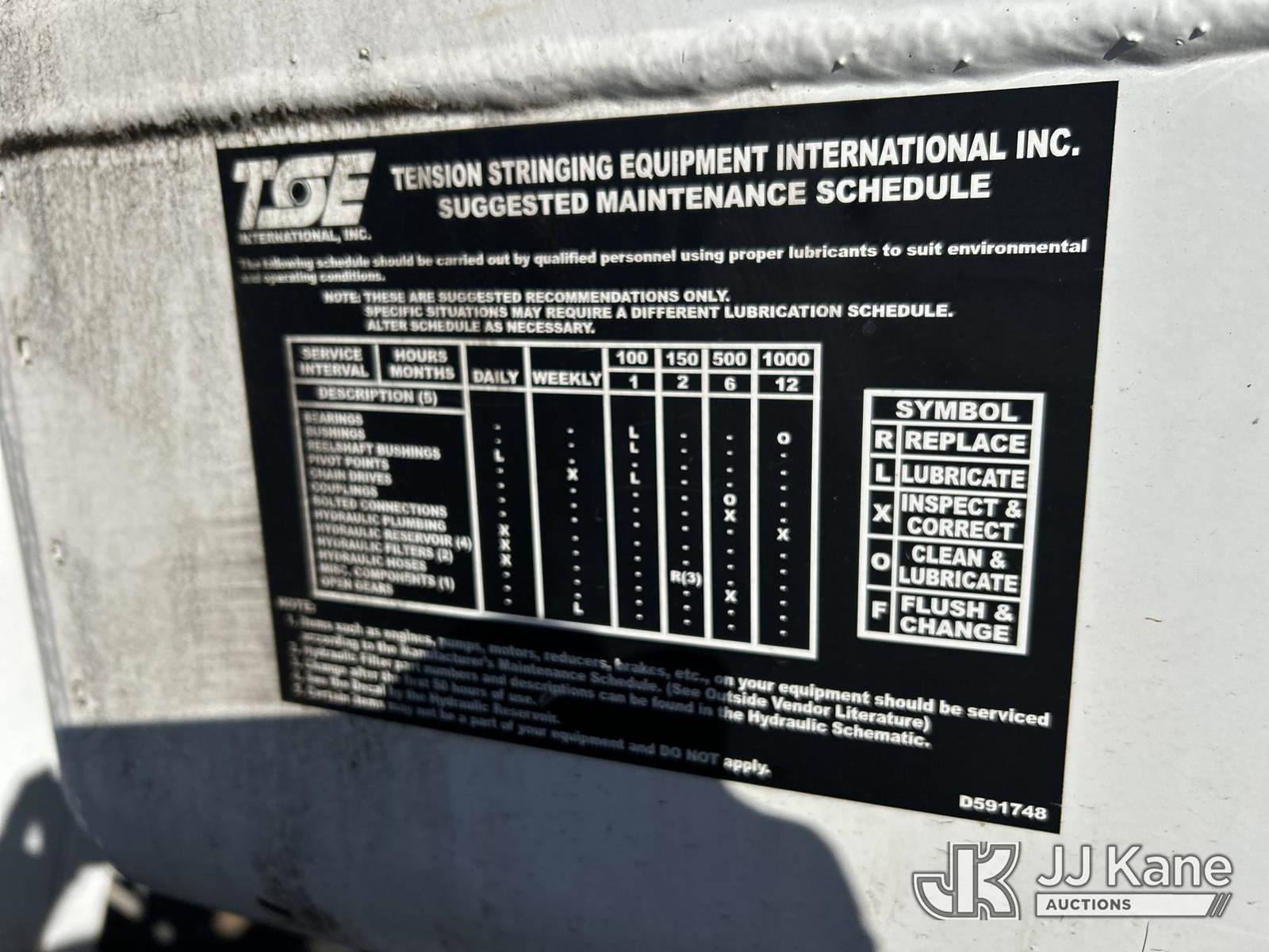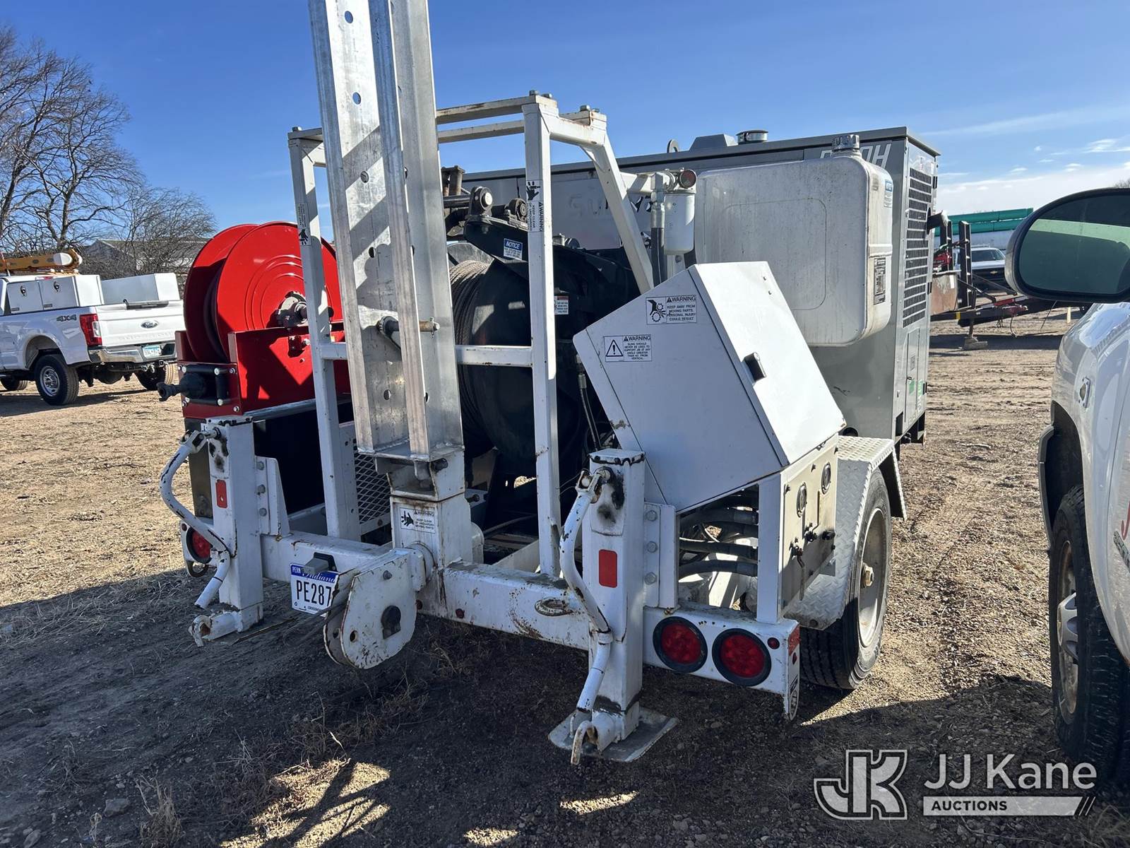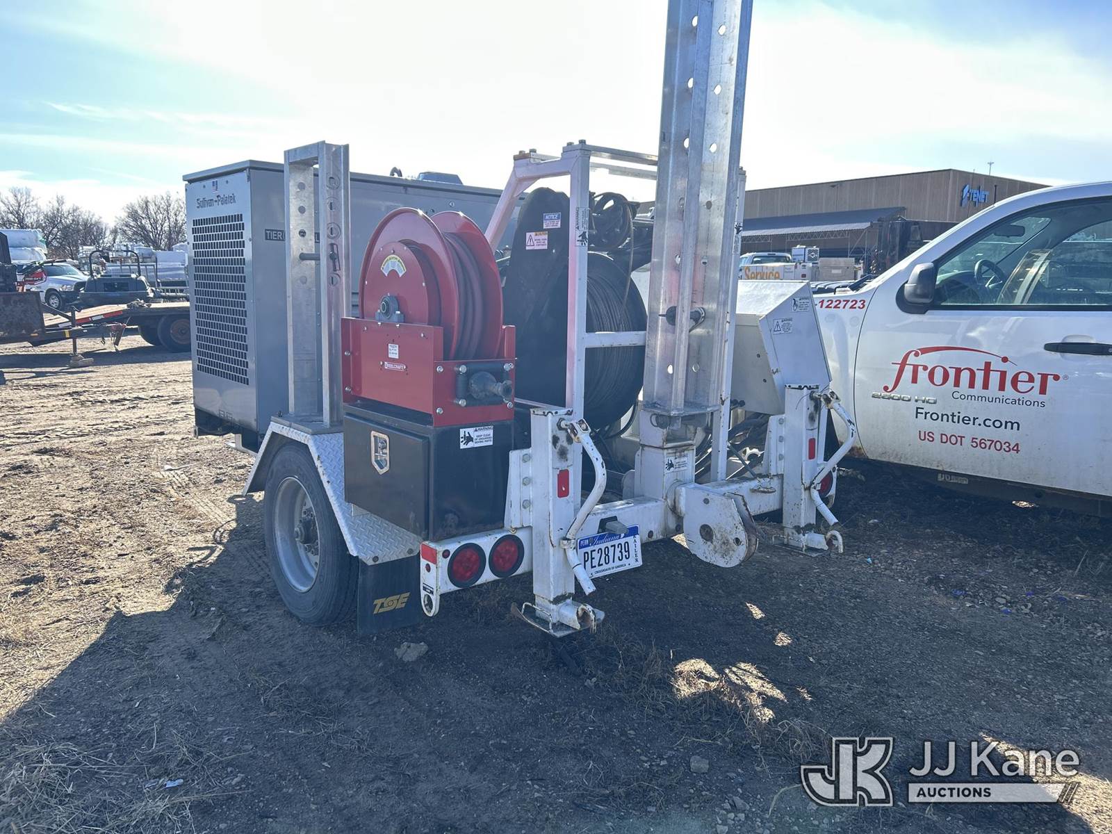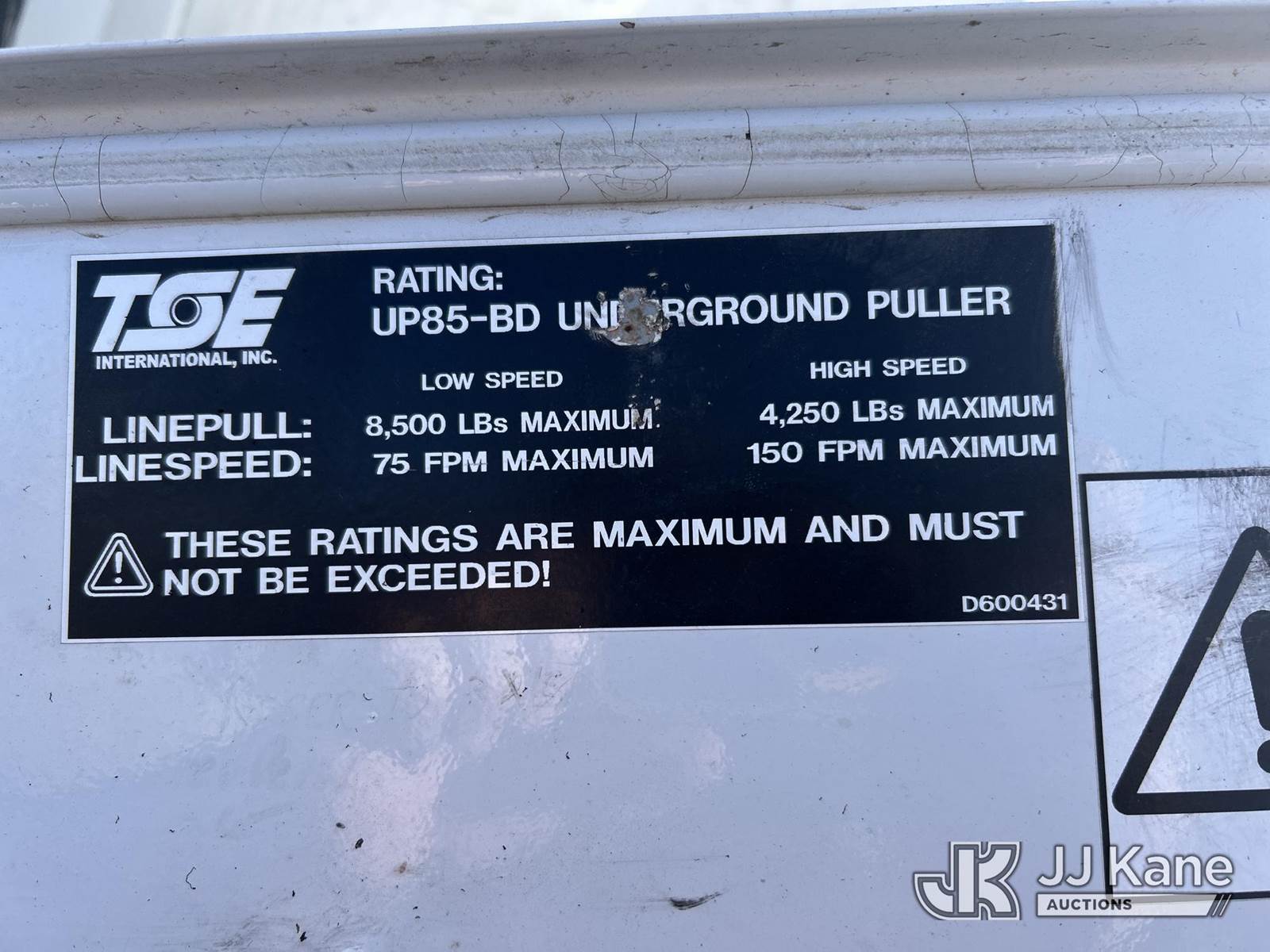 2019 TSE UP85BD Underground Cable Puller, diesel, with Air Compressor, Trailer mtd, STANDARD FEATURES • 8,500 lb. maximum linepull • 0-150 fpm maximum linespeed range • 8” bullwheels with 5 grooves • Reel capacity of 2,300 ft. of 7/16” wire rope • Rope payout on demand • Automatic leadscrew levelwind • Swivelling rear fairlead • Remote emergency stop button • Overload cut-off • Pivoting rear jib with multi-positional roller • Tool box • 49 hp diesel engine and 210 cfm air compressor combination OPTIONAL EQUIPMENT • 2,300 ft. of 7/16” galvanized steel pulling rope • Spring driven reel for air hose storage and automatic retrieval, includes 50’ of hose • Three head roller assembly for a larger bending radius. • Air adapter kit consisting of 2, 3, 4, 5, & 6 inch blowing adapters, rope adapters and projectiles • Hold down roller assembly with 4”, 5” & 6” conduit adapters to prevent pulling the duct out of the ground • Chart recorder kit • Electronic display with data logging This is a Titled Item NOTE: This unit is being sold AS IS/WHERE IS via Timed Auction and is located in Shakopee, MN. Inspection & preview days for this unit are the 2 business days prior to the first day of items closing for this auction, item is located at 1109 Stagecoach Rd Shakopee, MN 55379 and hours of operations are 8a-3p. For pre-sale questions, please contact Matt Koopman @ (651) 421-3305. (Buyer is responsible for removal. Assistance by consignor or JJ Kane Auctions is not assured.)