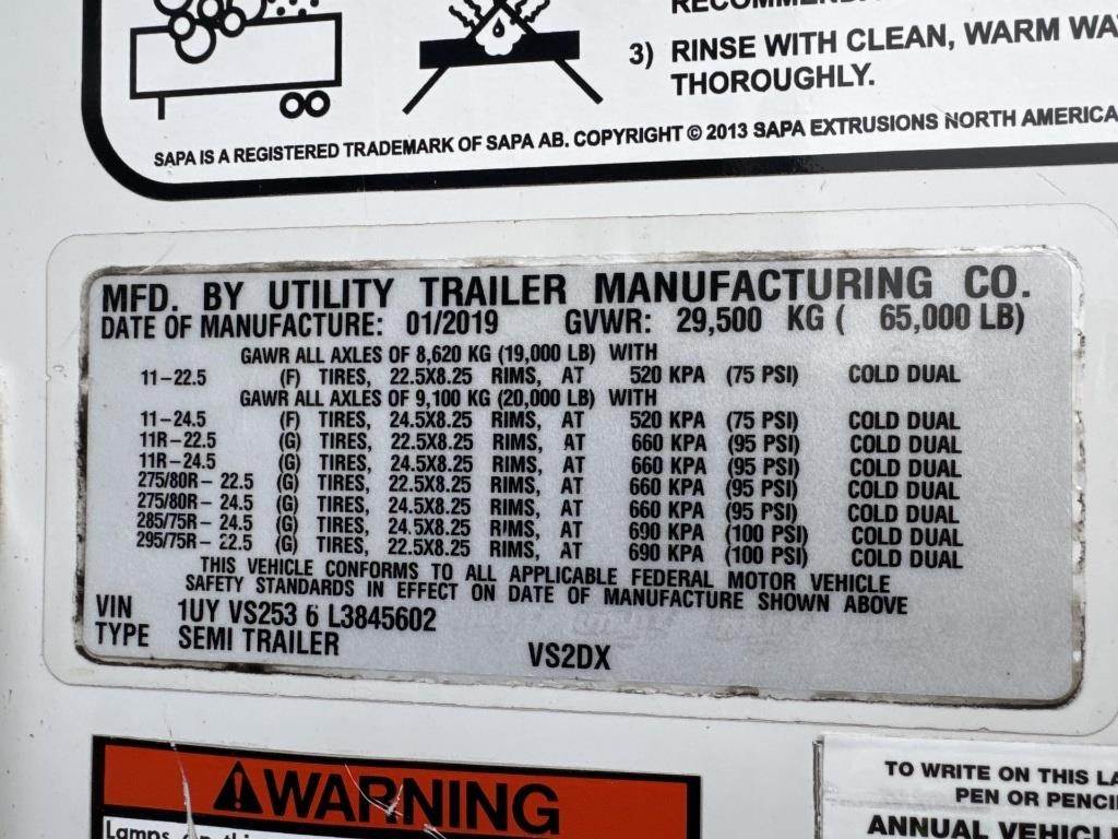 Location: Kaukauna, WI Approx 53' Length, 102" Width, 65000LB GVWR, Air Ride, Sliding Axles, 2 Speed Landing Gear, Rear Swing Doors, 275/80R22.5 Tires, Spare Tire VIN: 1UYVS2536L3845602