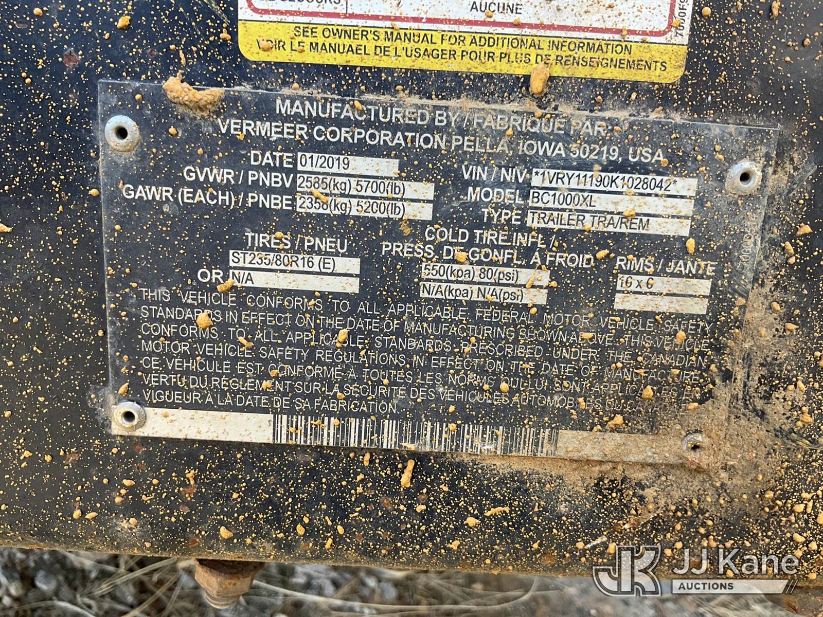 2019 Vermeer BC1000XL Chipper (12in Drum), 4-cyl gas, trailer mtd. (Runs & Operates) (Reads 1,142 hours) This is a Titled Item NOTE: This unit is being sold AS IS/WHERE IS via Timed Auction and is located in West Monroe, LA. Contact: Geoff Eneman 318-789-8568. License # LA AB-154 (Buyer is responsible for removal. Assistance by consignor or JJ Kane Auctioneers is not assured.)