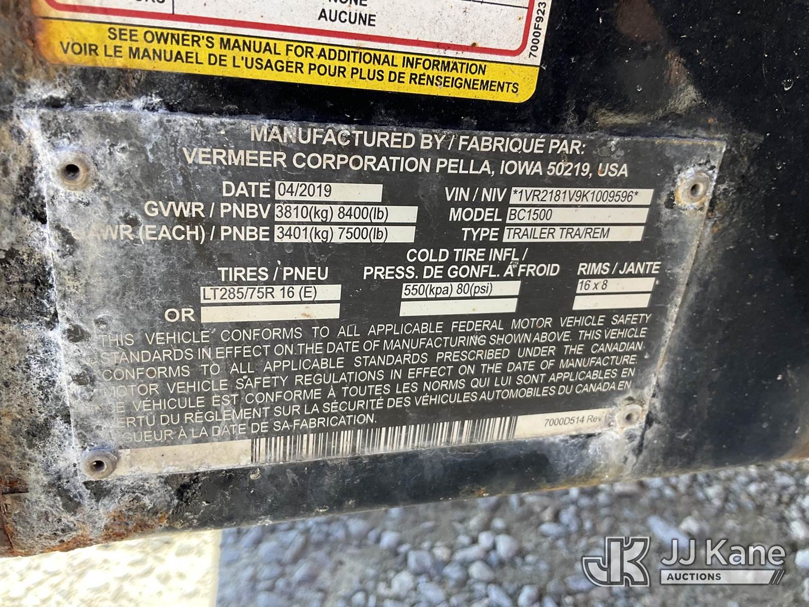 2019 Vermeer BC1500 Chipper (15in Drum), P.S.I. Gas, (Not Running, No Crank, No Power To LCD Screen, Seller States: Engine Issues) This is a Titled Item NOTE: This unit is being sold AS IS/WHERE IS via Timed Auction and is located in Shrewsbury, MA. Inspection & preview days for this unit are the 2 business days prior to the first day of items closing for this auction, item is located at 11 Fortune Blvd Shrewsbury, MA 01545 and hours of operations are 8a-4p. For pre-sale questions, please contact Rob Gifford @ (508) 864-4126. (Buyer is responsible for removal. Assistance by consignor or JJ Kane Auctions is not assured.)
