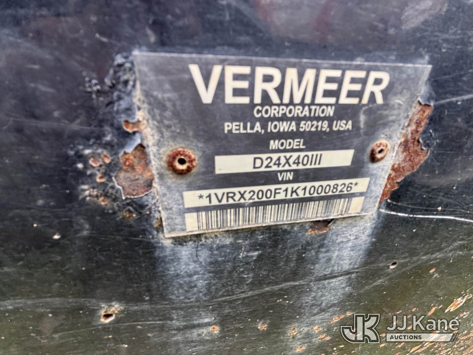 2019 Vermeer D24x40 Series III Directional Boring Machine, s/n 1VRX200F1K1000826, John Deere 4045 diesel, with (24) 10 ft. sections of 2.375 in. drill rod steel crawler tracks with rubber pads, hyd hold downs, riding console & rear controls, (Batteries need replacing, does not hold a charge), (Per seller: Runs, Moves & Operates) (Tracks Need New Rubber) (Reads 3,424 hours) NOTE: This unit is being sold AS IS/WHERE IS via Timed Auction and is located in Merced, CA. For more information & removal arrangements please contact Charlie de Kanter @ (281) 910-7147. (Buyer is responsible for removal. Assistance by consignor or JJ Kane Auctions is not assured.)