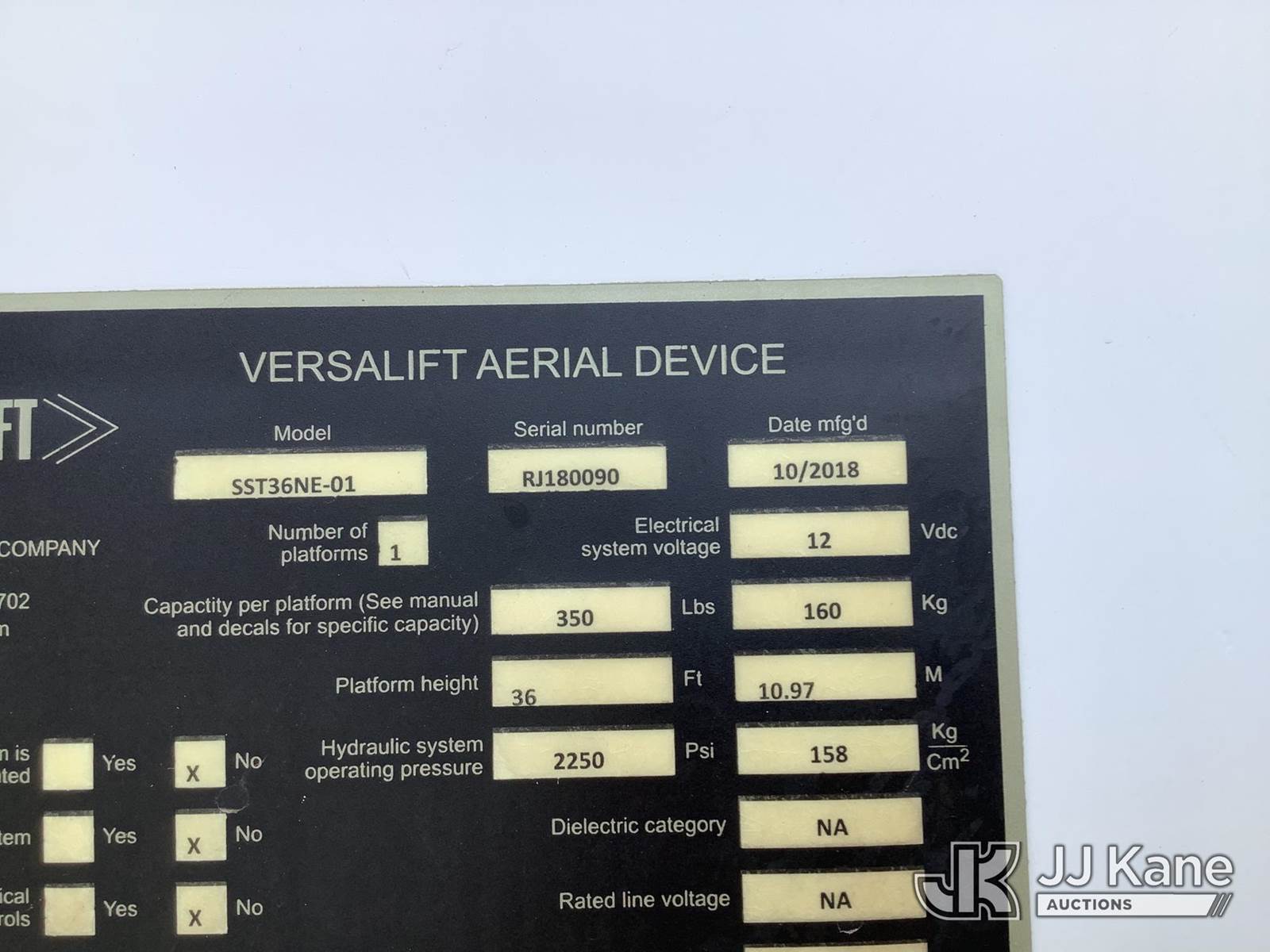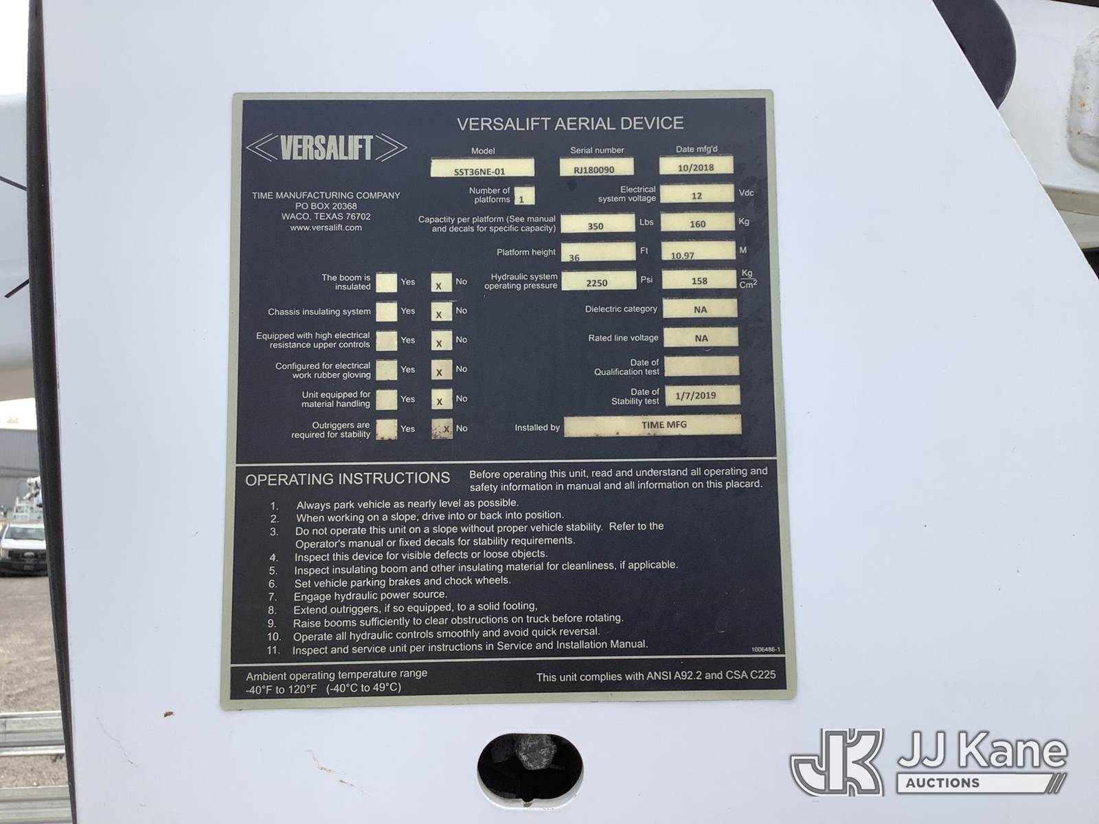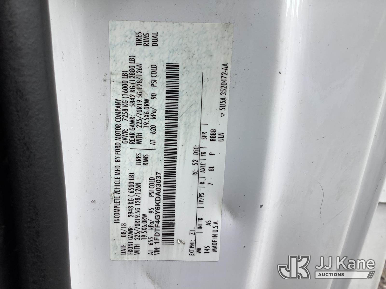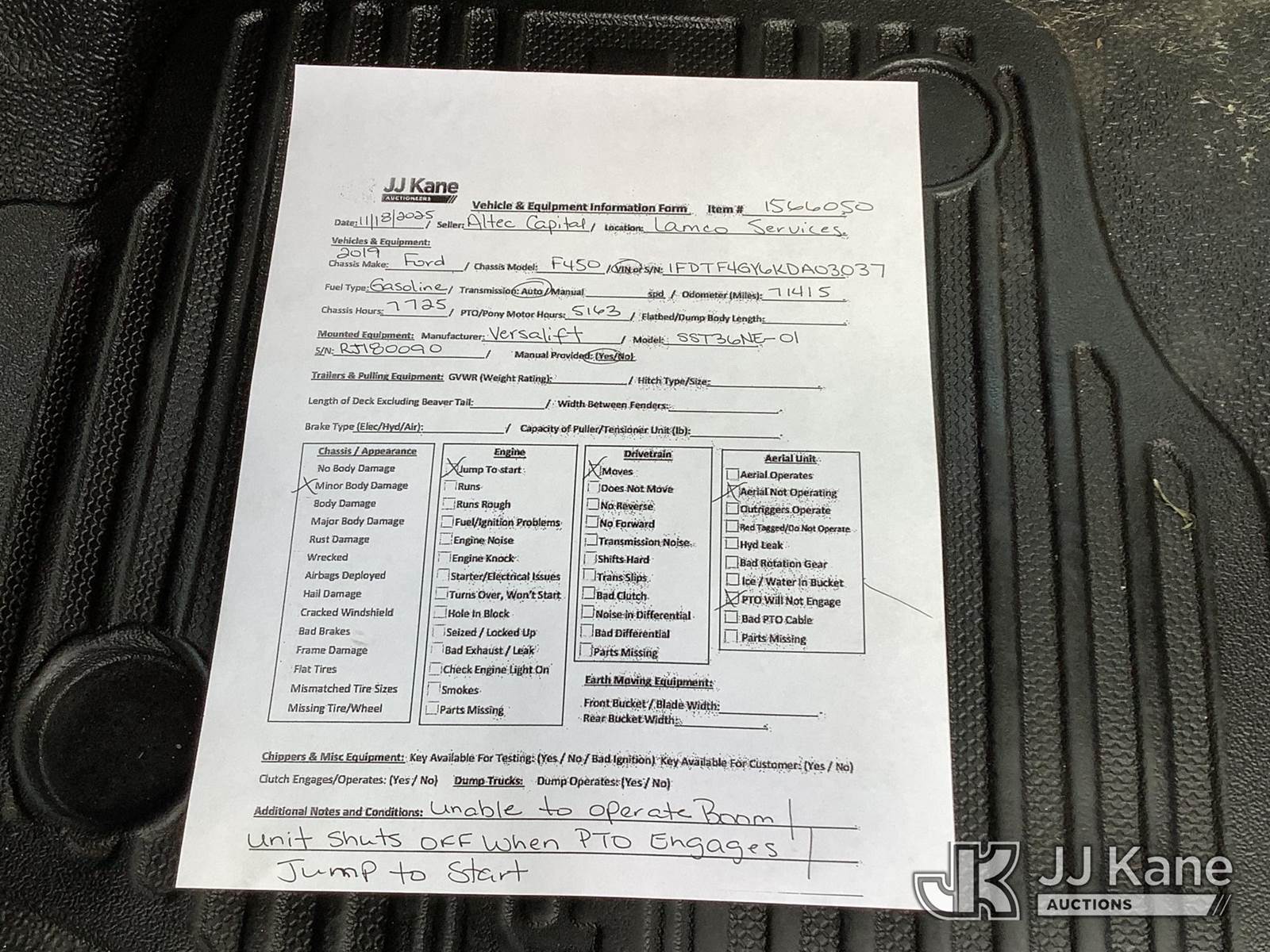 Versalift SST36NE-01, 41 ft, Articulating & Telescopic Non-Insulated Bucket Truck s/n RJ180090, with single-man bucket, mounted behind cab on 2019 Ford F-450 SD Service Truck, 10-cyl gas, Auto, RWD, A/C, (71,415 miles) (Runs, Jump To Start, Moves, Upper Not Operating, PTO Issues, Condition Unknown) This is a Titled Item NOTE: This unit is being sold AS IS/WHERE IS via Timed Auction and is located in Graysville, AL. For more information & removal arrangements please contact Jarrod.Bains@JJKane.com. Alabama Auctioneer Michael Whitebread - License # 5592 (Missing manuals, See Auction Company for Manufacturers Information to obtain manuals) (Buyer is responsible for removal. Assistance by consignor or JJ Kane Auctioneers is not assured.)