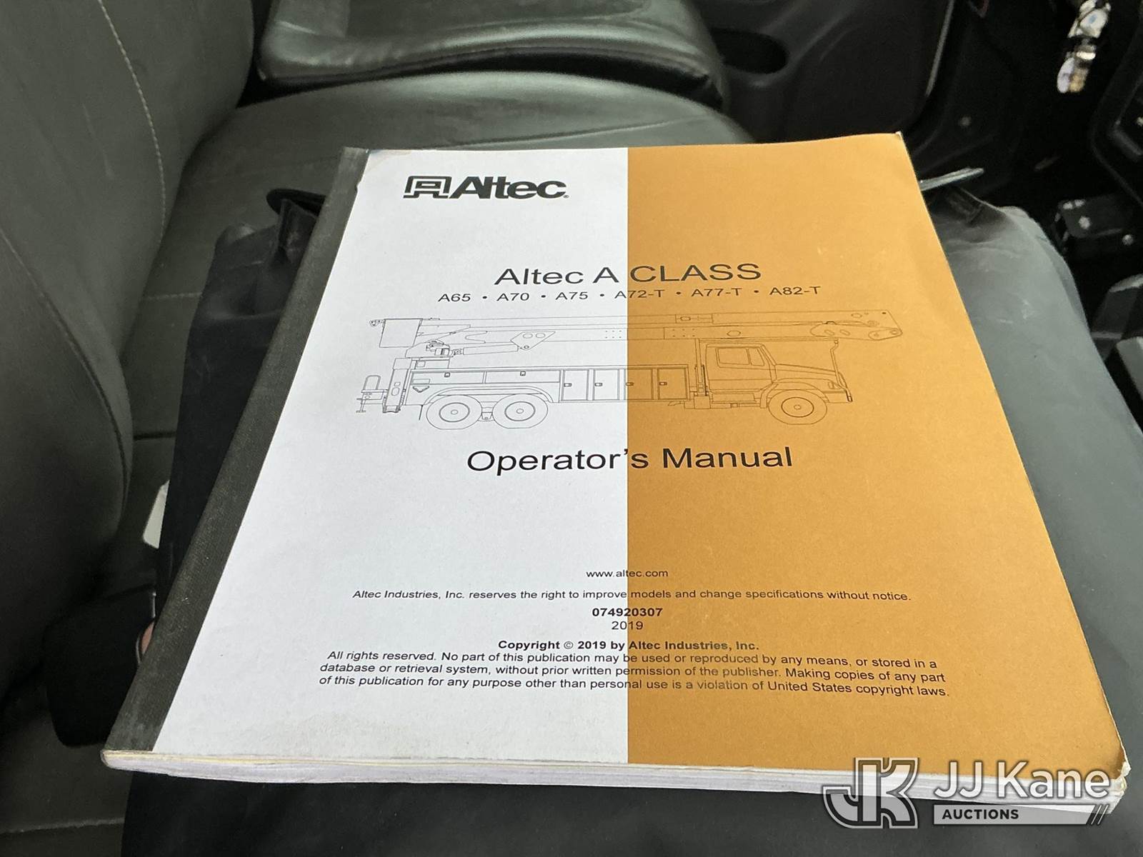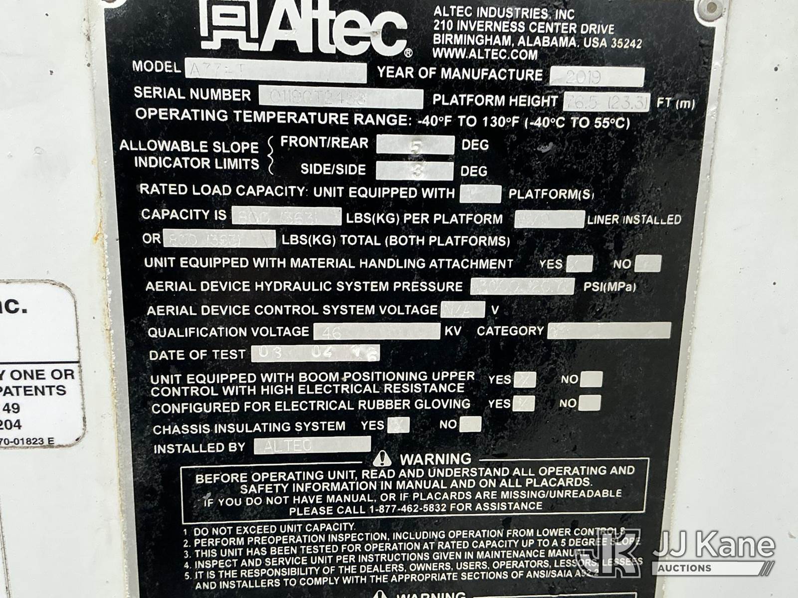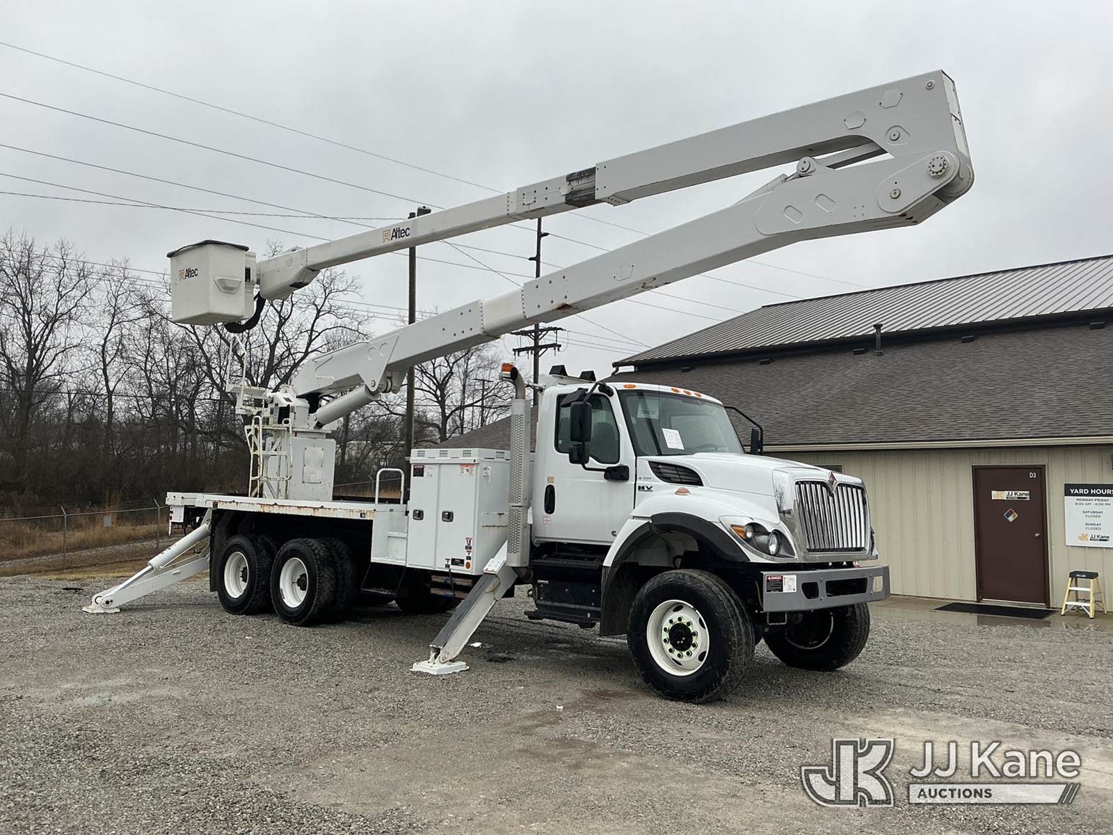 Altec A77-T, 82 ft, Articulating Material Handling Bucket Truck s/n 0119CT2458, with two-man bucket & 4 hyd outriggers, rear mounted on 2020 International HV607 T/A Flatbed/Utility Truck, Cummins L9 diesel, Auto, A/C, (27,605 miles) (Runs, Moves & Upper Operates) (Reads 3,772 hours) This is a Titled Item NOTE: This unit is being sold AS IS/WHERE IS via Timed Auction and is located in Fort Wayne, IN. For more information & removal arrangements please contact Office Staff @ (260) 450-9822. Load out by appointment only, Buyer/Hauler must present copy of paid invoice upon arrival. Purchaser acknowledges ALL lots must be removed within (10) business days of Auction, or a storage fee may be incurred. For load out and pick up information, please reference the hauler sheet sent out after purchase. (Manuals provided in cab) (Buyer is responsible for removal. Assistance by consignor or JJ Kane Auctions is not assured.)