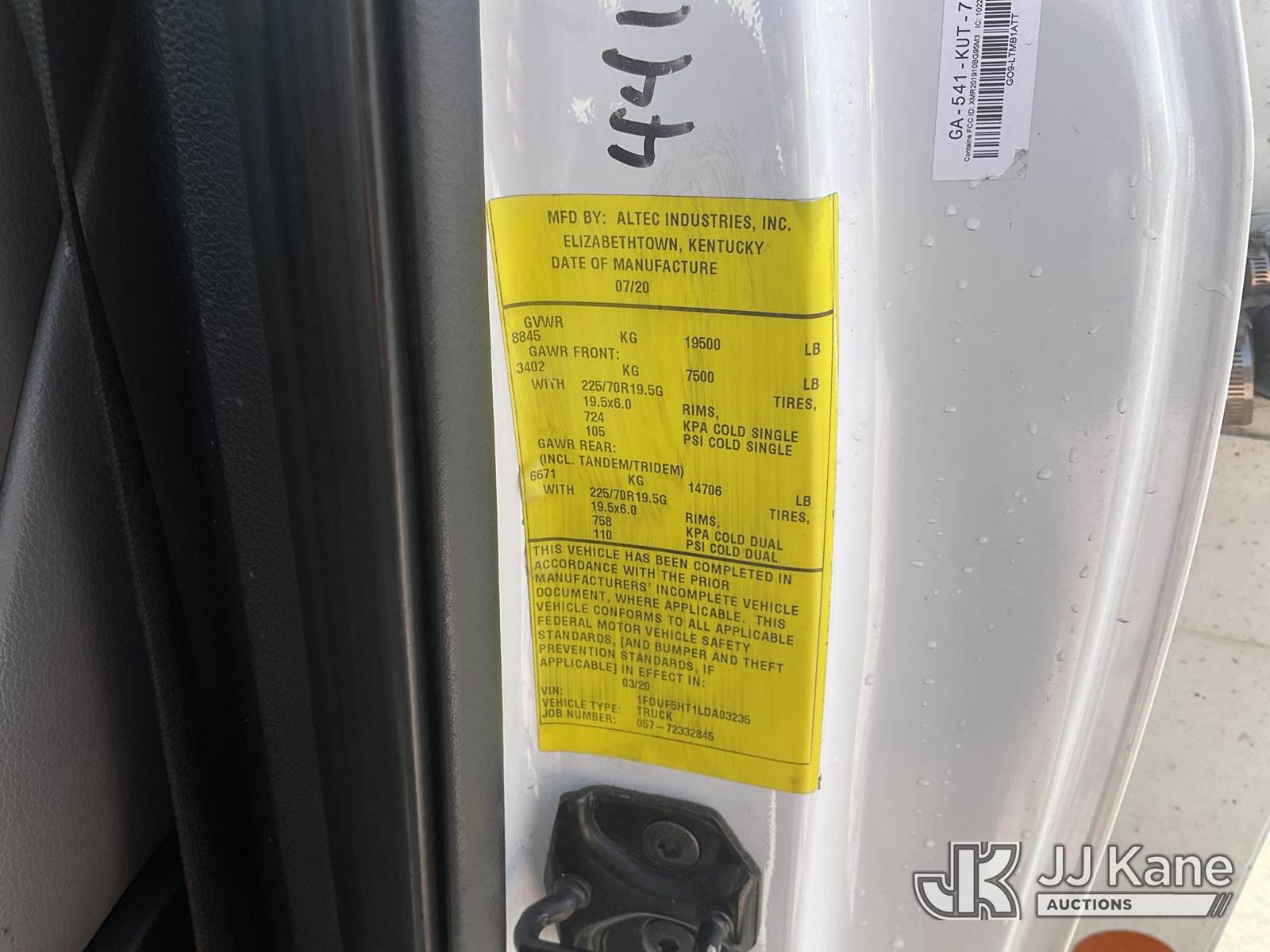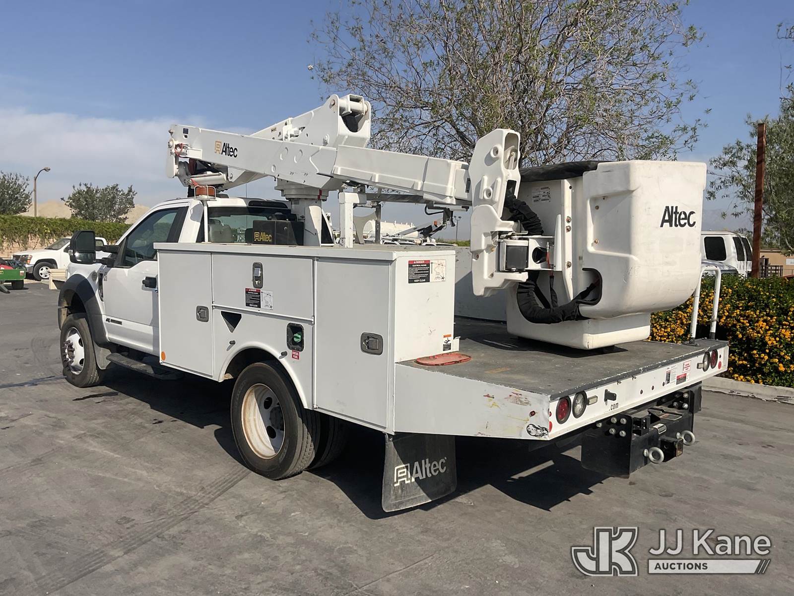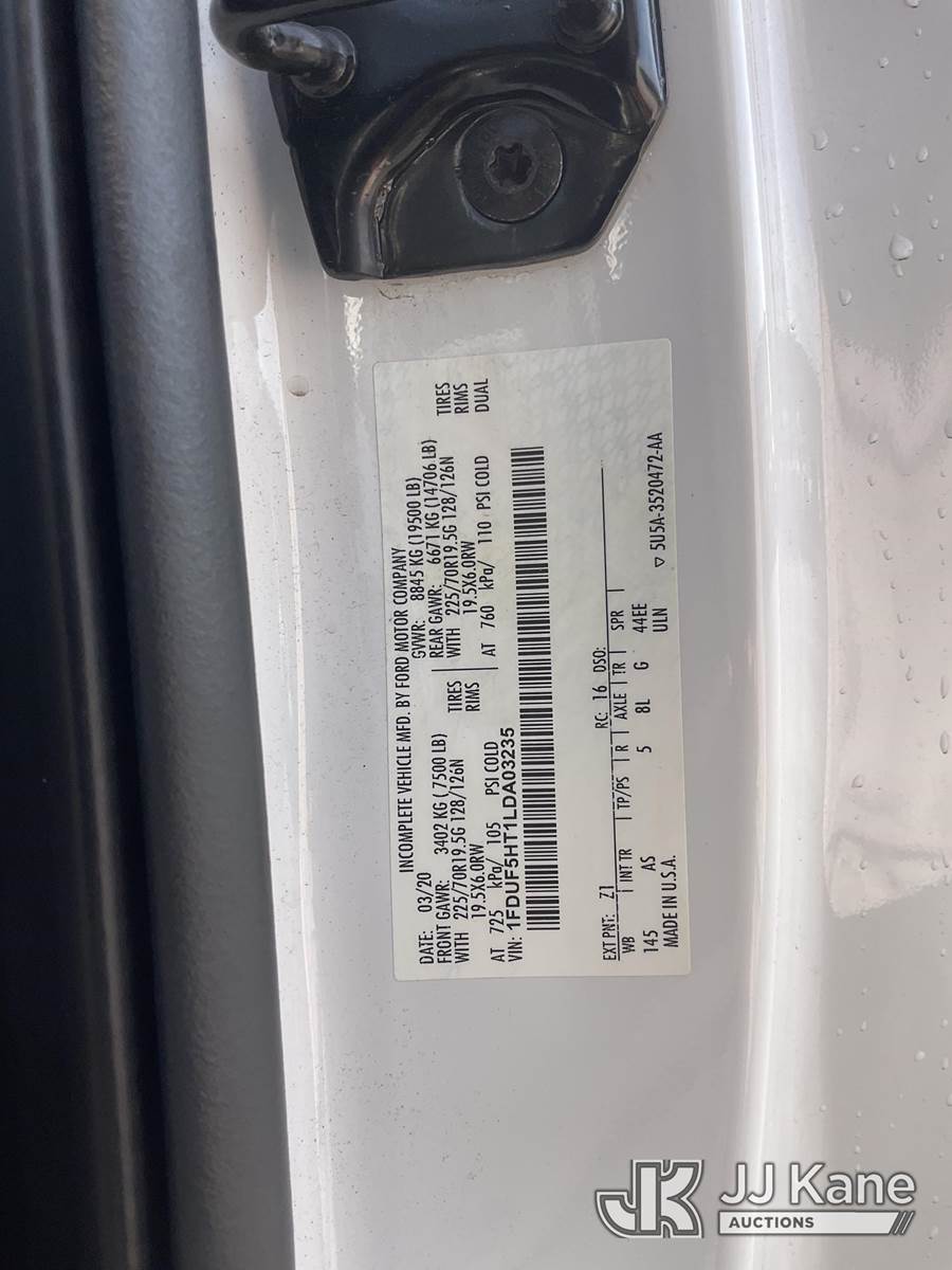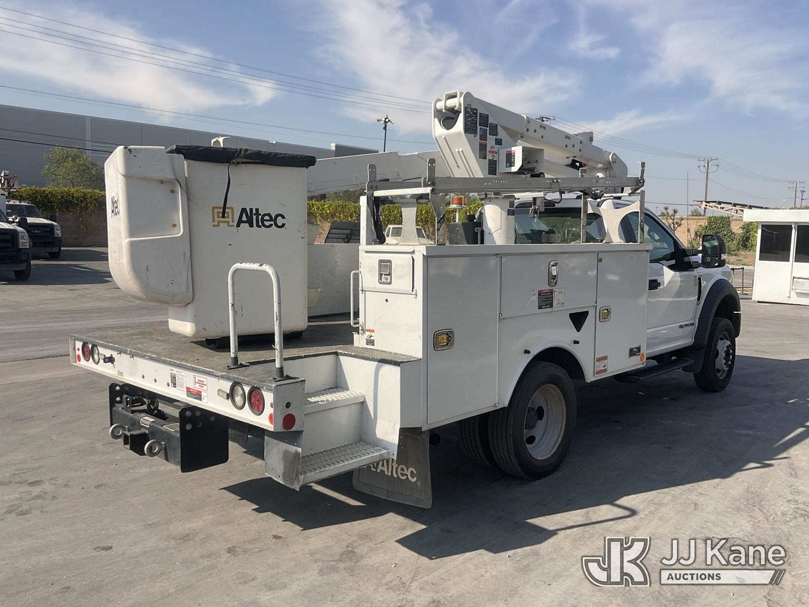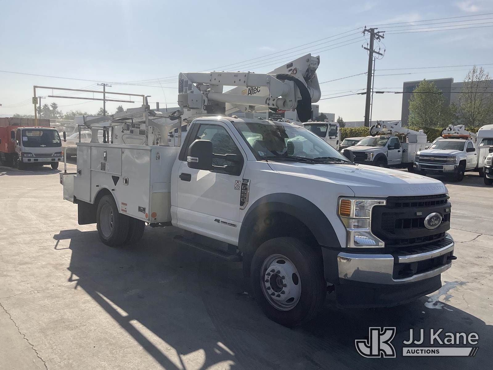 Altec AT37G, 42 ft, Articulating & Telescopic Bucket s/n 0620DE23121, with single-man bucket, mounted behind cab on 2020 Ford F-550 Regular Cab DRW 4WD Utility Truck, s/n 1FDUF5HT1LDA03235, 6.7L V8 OHV 16V DIESEL, Auto, A/C, with Tow Package, (127,947 miles) (Runs, Moves & Upper Operates, Open Recall With Remedy Not Yet Available) (Bidding Restricted to Licensed Vehicle Dealers Only), May be subject to ARB Regulations This is a Titled Item NOTE: This unit is being sold AS IS/WHERE IS via Timed Auction and is located in Jurupa Valley, CA. Inspection & preview days for this unit are the 2 business days prior to the first day of items closing for this auction, item is located at 4510 Muth Way Jurupa Valley, CA 92509 and hours of operations are 8a-4p. For pre-sale questions, please contact please contact Office Staff @ (310) 353-7140. Dealer License Number 45696. (Manuals provided in cab) (Buyer is responsible for removal. Assistance by consignor or JJ Kane Auctions is not assured.)