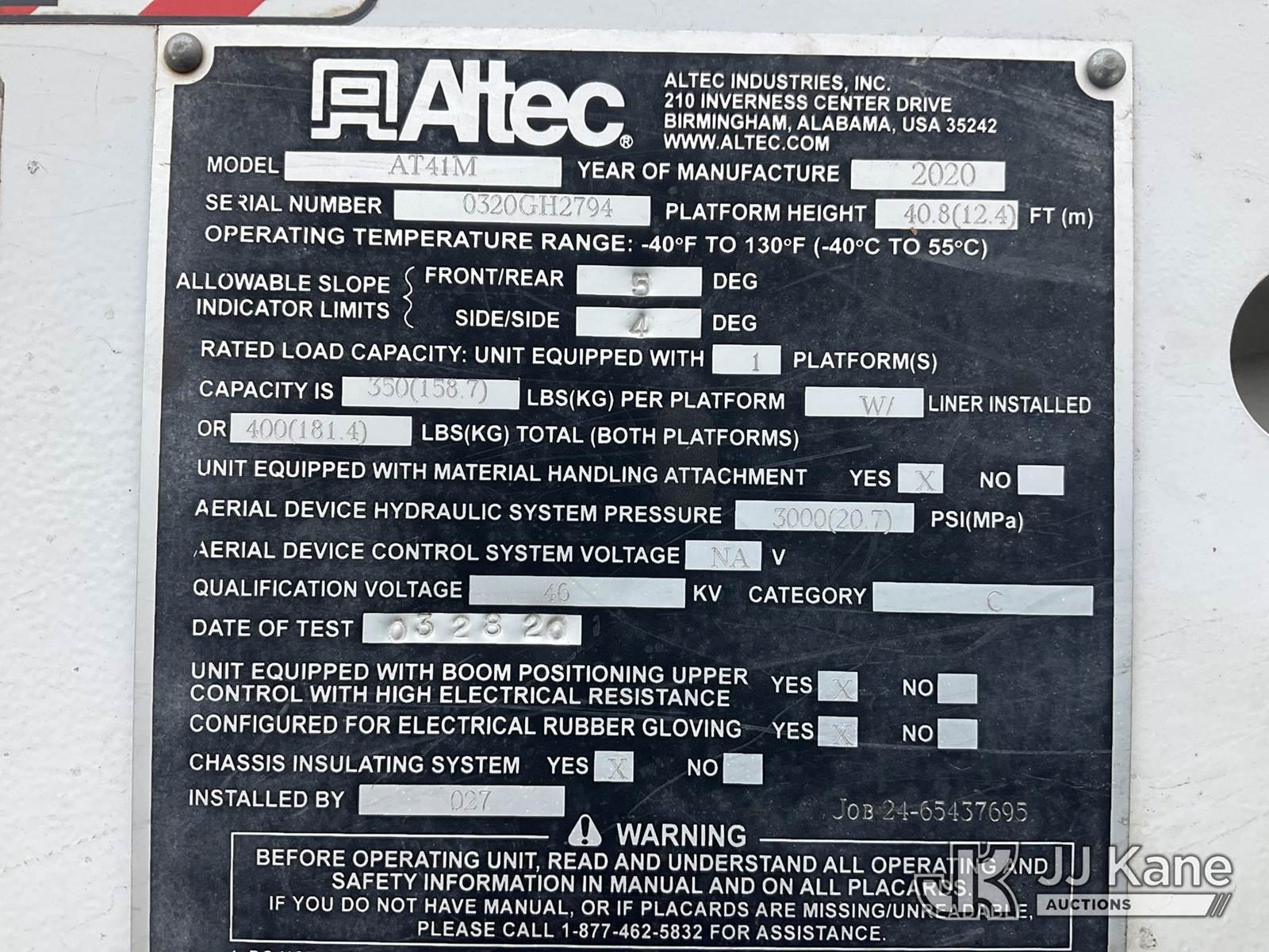 Altec AT41MH, 46 ft, Articulating & Telescopic Material Handling Bucket Truck s/n 0320GH2794, with single man bucket & 2 hyd outriggers, mounted behind cab on 2020 Ford F550 4X4 Extended-Cab Service Truck, 6.7L diesel, Auto, A/C, (164,927 miles) (Runs, Moves & Upper Operates) (Check Engine Light On) (The manufacturer has notified JJ Kane that this equipment is subject to an open recall. CSN 855 Fuel Line and Brake Line Inspection The equipment should not be operated until this is addressed. Buyer is responsible for reviewing the recall notice and contacting the manufacturer to schedule the recommended corrective actions. Associated costs may be covered by the manufacturer in some cases.) This is a Titled Item NOTE: This unit is being sold AS IS/WHERE IS via Timed Auction and is located in China Grove, NC. Inspection & preview days for this unit are the 2 business days prior to the first day of items closing for this auction, item is located at 820 E NC Hwy 152 China Grove, NC 28023 and hours of operations are 8a-4p. For pre-sale questions, please contact Office Staff @ (704) 674-1113. (Manuals provided in cab) (Buyer is responsible for removal. Assistance by consignor or JJ Kane Auctions is not assured.)