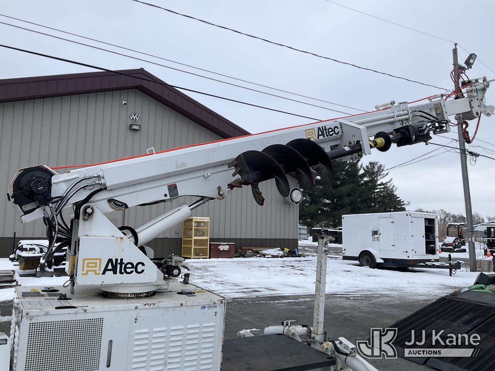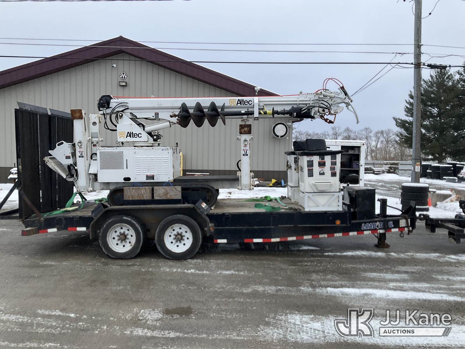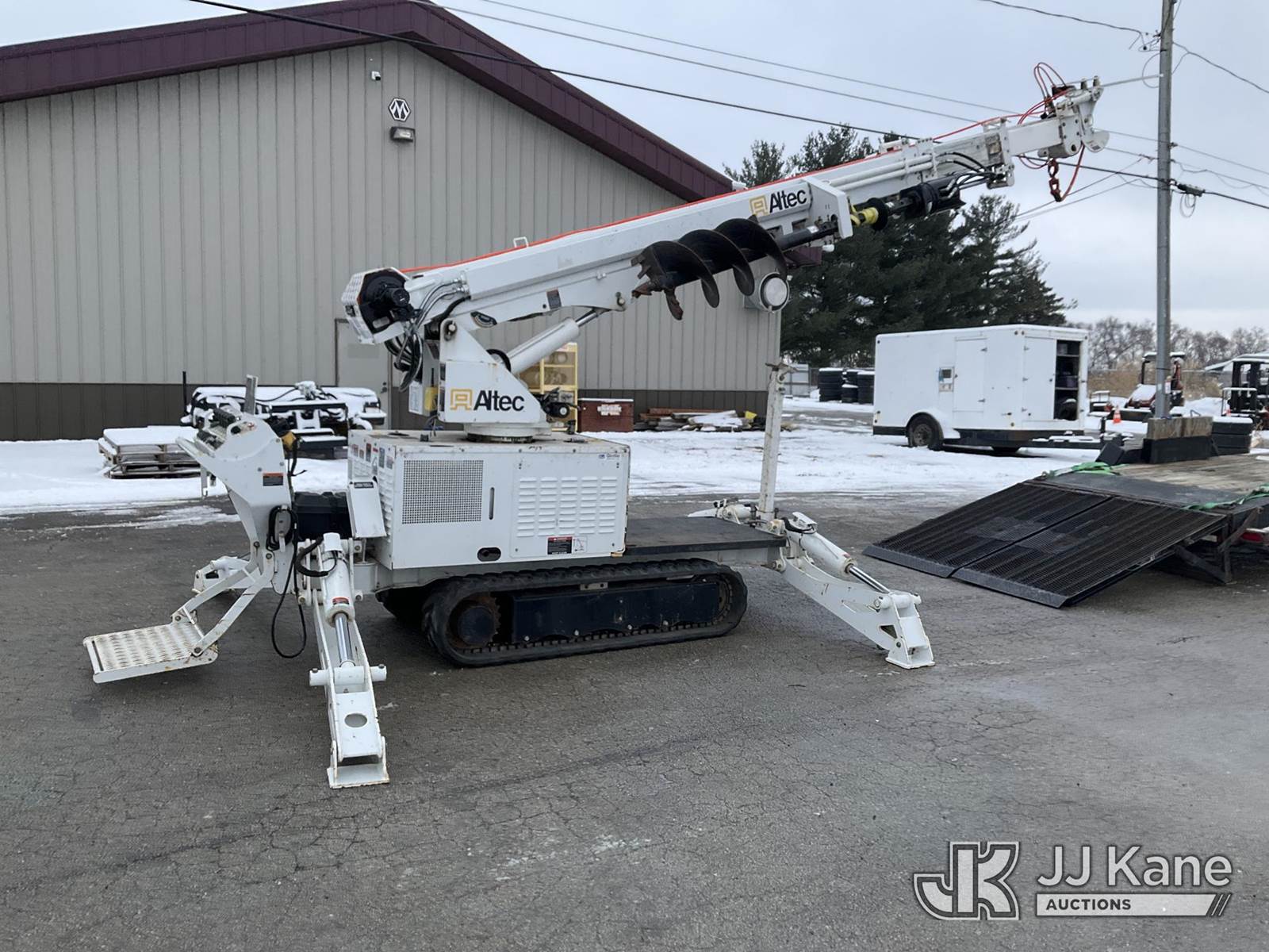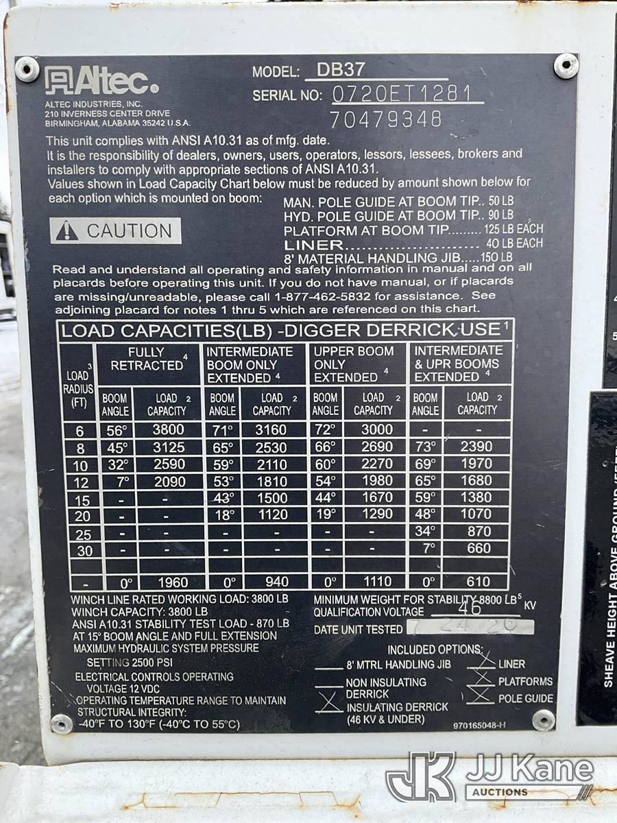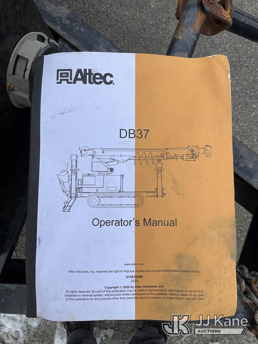 Altec DB37, 3,800 Lb Digger Derrick s/n 0720ET1281, with 37 ft. sheave height, 3 section hyd boom, 1 section pull out, boom winch, pole guides, 2-pin on buckets, wireless remote, drive remote & 4 hyd outriggers, mounted on 2020 Tracked Backyard Carrier, s/n 0720ET1281, Kubota diesel, Hydrostatic, with Load Trail support trailer, VIN: 4ZECH1825L1208032, Selling with 1591414. (Equipment and trailer price will be split out on invoice to reflect 80/20, equipment to trailer price ratio for tax purposes.) (Runs, Moves & Operates, **Dealer Only** This item has been removed from service due to the listed safety repairs that were not completed. The safety items below must be completed by an approved OEM facility before the unit can return to service: TRAILER RAMP LATCH/BREAKAWAY CABLE REQUIRE DIAGNOSIS/REPAIR; RADIO REMOTE REQUIRES DIAGNOSIS/REPAIR; CAT-TRACK HYDRAULIC HOSE ASSEMBLY REQURES REPLACEMENT; RF OUTRIGGER CYLINDER REQUIRES REPLACEMENT; POLE GUIDE ARM AND CYLINDER REQUIRE REPLACEMENT; EXTENSION CYLINDER REQUIRES REPLACEMENT; ROTATION GEARBOX REQUIRES REPLACEMENT; COMPLETE ANSI INSPECTION AND DIELCTRIC TESTING; COMPLETE ANY REQUIRED TESTING AND REPAIRS AFTER INSPECTIONS ARE COMPLETED) (Reads 631 hours) (Bidding Restricted to Licensed Vehicle Dealers Only), NOTE: This unit is being sold AS IS/WHERE IS via Timed Auction and is located in Charlotte, MI. Inspection & preview days for this unit are the 2 business days prior to the first day of items closing for this auction, item is located at 750 Island Hwy Charlotte, MI 48813 and hours of operations are 8a-4p. For pre-sale questions, please contact Corey Cook at (517) 983-0796 or corey.cook@jjkane.com (Manuals provided in cab) (Buyer is responsible for removal. Assistance by consignor or JJ Kane Auctions is not assured.)