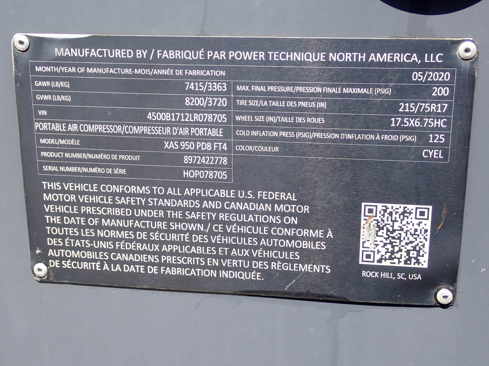 2020 Atlas Copco XAS950 PD8 FT4 air compressor, CAT C7.1/Perkins 1206F turbo diesel engine, 490 hours, trailer mounted, towable, standard and aftercooled/instrument quality air circuits, 4 air outlets, selectable pressure settings, RENTAL FLEET MAINTAINED, FULLY OPERATIONAL AND IN EXCELLENT RUNNING CONDITION. COMPRESSOR IS RATED 950 CFM AT 100 PSI, 900 CFM AT 150 PSI AND 750 CFM AT 200 PSI -- EXTREMELY VERSATILE UNIT AT ANY PRESSURE SETTING YOU NEED! EXTREMELY NICE COMPRESSOR HERE -- WILL DO ANY JOB YOU NEED -- TIER 4 COMPLIANT FOR THOSE JOBS THAT REQUIRE IT, SLICK PACKAGE, SINGLE AXLE TRAILER FOR EASY TOWING -- DON'T MISS THIS ONE !!