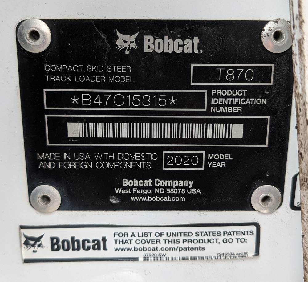 2020 Bobcat T870 Skid Steer Track Loader; Runs, Drives and Operates as Intended, Full cab, Heat, A/C, Radio, 1,167 Hours, Includes Bobcat Bucket and Pallet Forks.