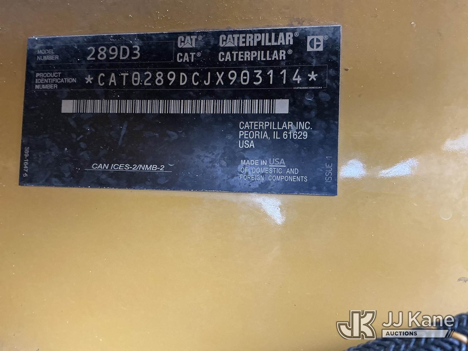2020 Cat 289D3 Skid Steer Loader, s/n JX903114, Cat C3.3 Hydrostatic, diesel, A/C, with aux hydraulics, rear counterweights, rubber tracks, EROPS w/ AC, (Runs, Moves & Operates) (Shows Needing 500 Hr. oil Change & 1000 Hydraulic Oil Change, No Bucket) (Reads 4,596 hours) NOTE: This unit is being sold AS IS/WHERE IS via Timed Auction and is located in Kansas City, MO. For more information & removal arrangements please contact Ricky McPherson @ 816-610-2250. (Buyer is responsible for removal. Assistance by consignor or JJ Kane Auctions is not assured.)