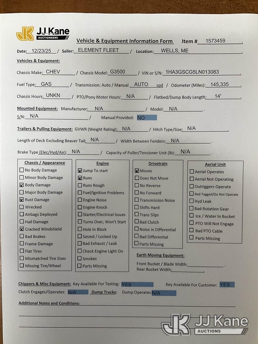 2020 Chevrolet Express G3500 Cutaway Van Body Truck, 8-cyl gas, Auto, A/C, (145,335 miles) (Runs & Moves, Jump To Start, Cracked Windshield) (Removal is by Appointment Only, Buyer MUST make a appointment prior to picking up, Buyer/Transporter Must have PAID IN FULL RELEASE. No onsite assistance available, Please Come prepared.) This is a Titled Item NOTE: This unit is being sold AS IS/WHERE IS via Timed Auction and is located in Wells, ME. Inspection & preview days for this unit are by appointment only; please contact us at contact@jjkane.com or 84-Go-JJKane for more details. (Buyer is responsible for removal. Assistance by consignor or JJ Kane Auctions is not assured.)