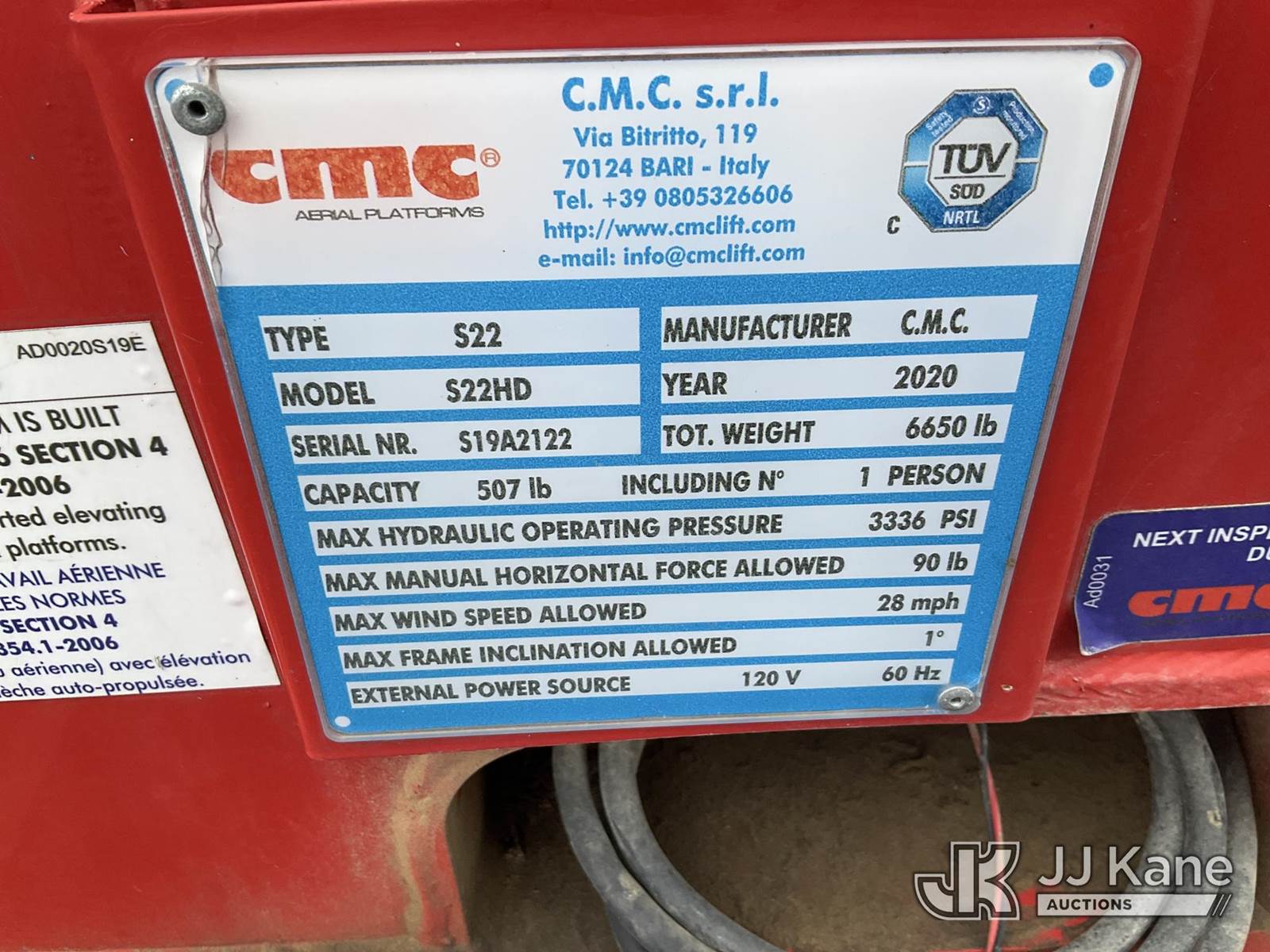 2020 CMC S22HD Tracked Aerial Platform, s/n S19A2122, diesel, (Not Running, Condition Unknown) (Reads 3,826 hours) NOTE: This unit is being sold AS IS/WHERE IS via Timed Auction and is located in Salt Lake City, UT. Inspection & preview days for this unit are the 2 business days prior to the first day of items closing for this auction, item is located at 2353 N Redwood Rd Salt Lake City, UT 84116 and hours of operations are 8a-4p. Titles executed exactly as bidder registered. Ensure your name and/or business name and address in JJ Kane and/or ProxiBid is correct before bidding. For pre-sale questions, please contact Office Staff @ (801) 519-0123. (Buyer is responsible for removal. Assistance by consignor or JJ Kane Auctions is not assured.)