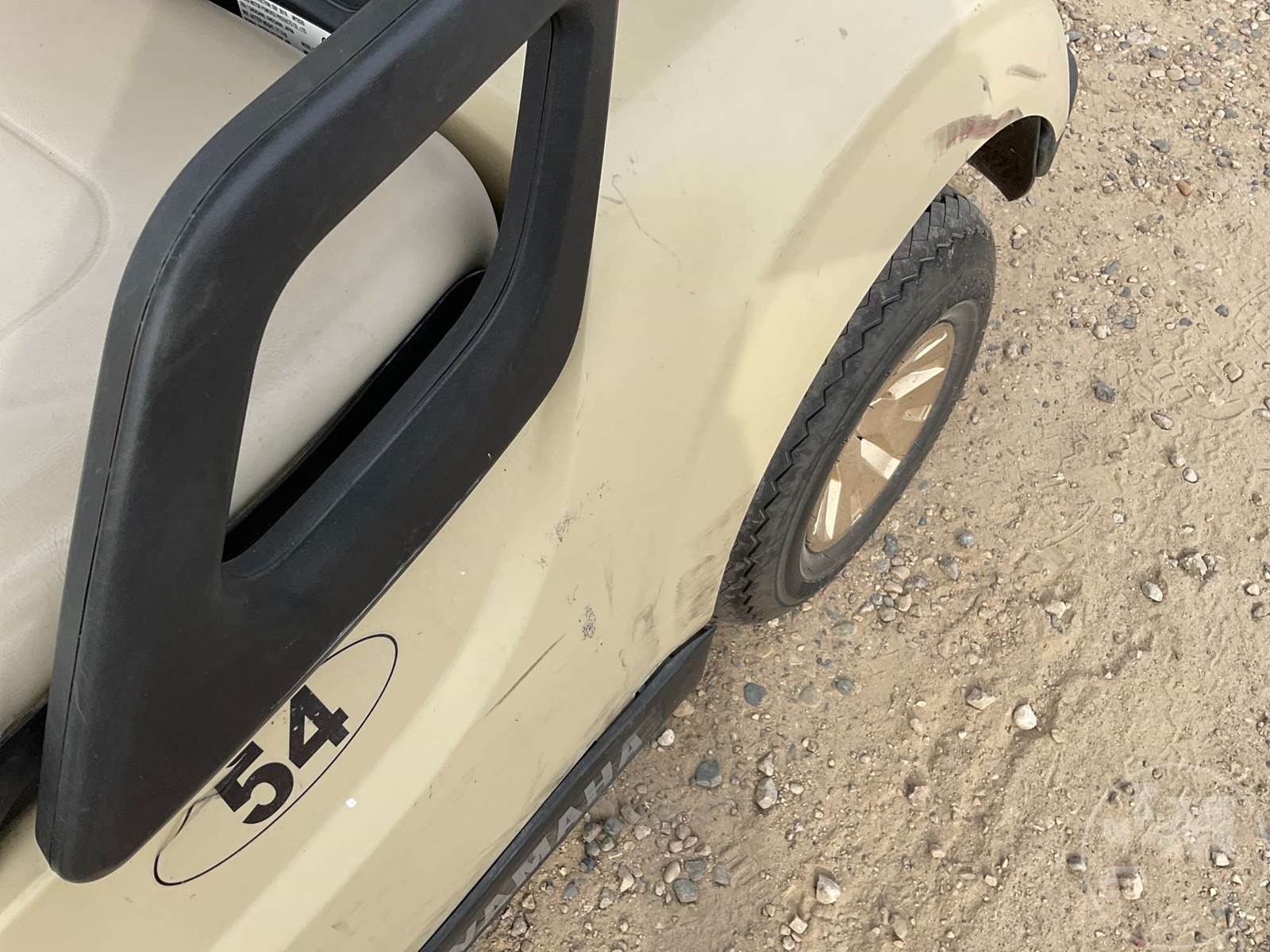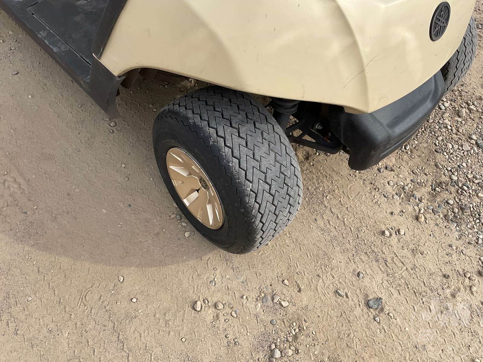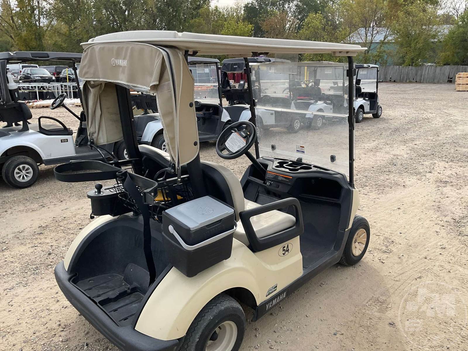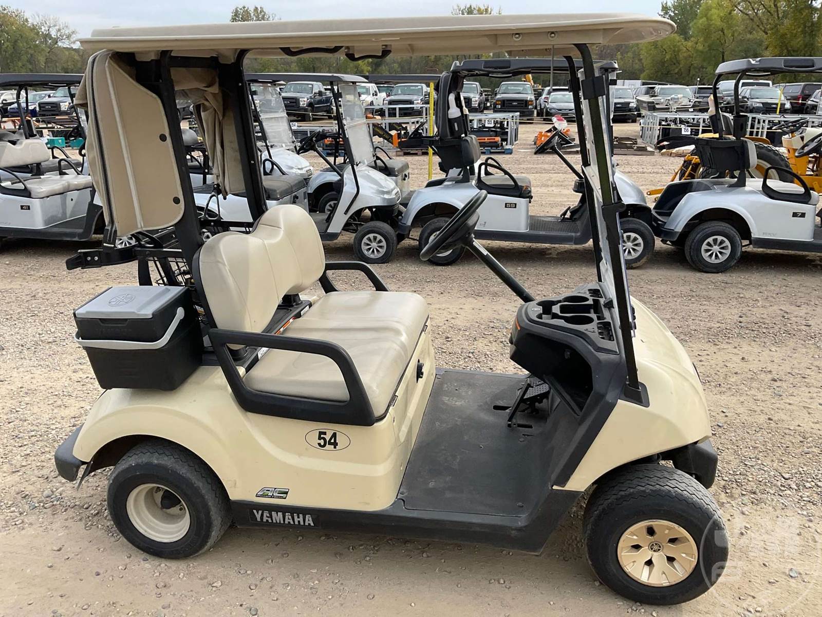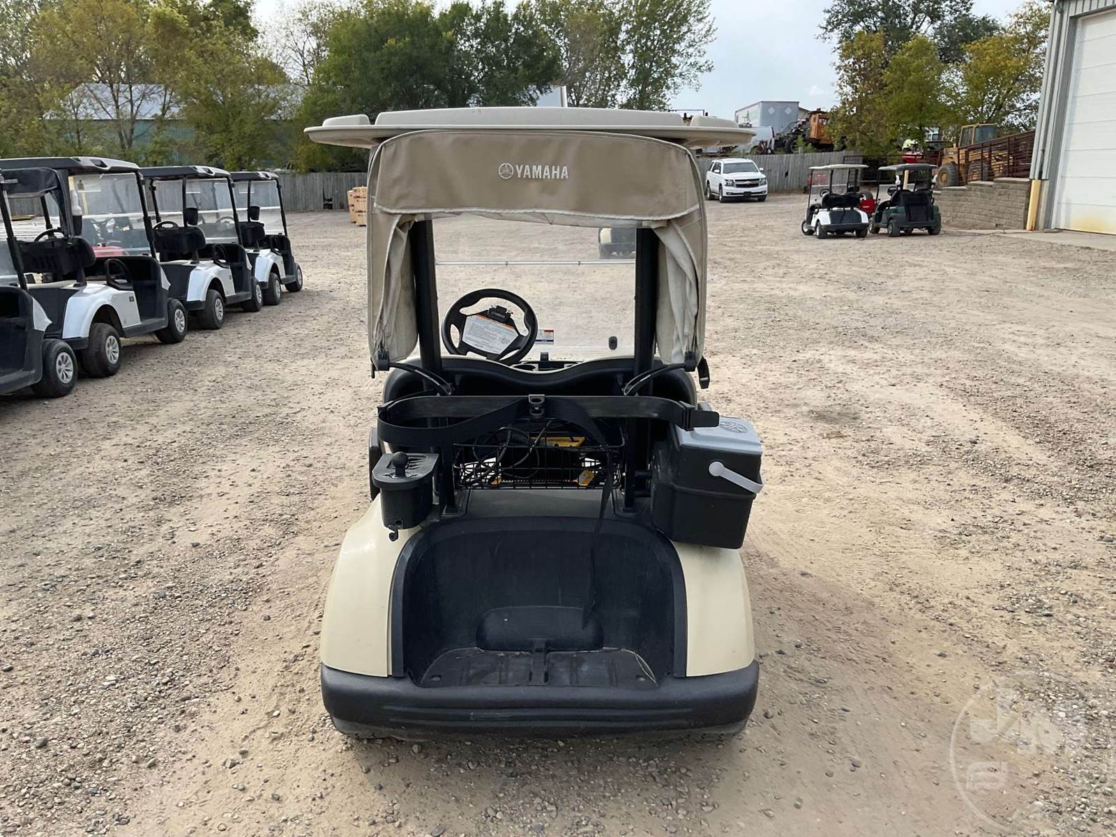 YAMAHA GOLF CART, ELECTRIC, TAN, 2 SEAT, CANOPY, RAIN CURTAIN, WINDSHIELD, COOLER, BALL WASHER, PLUG IN CHARGER ****NO TITLE, BILL OF SALE ONLY****
