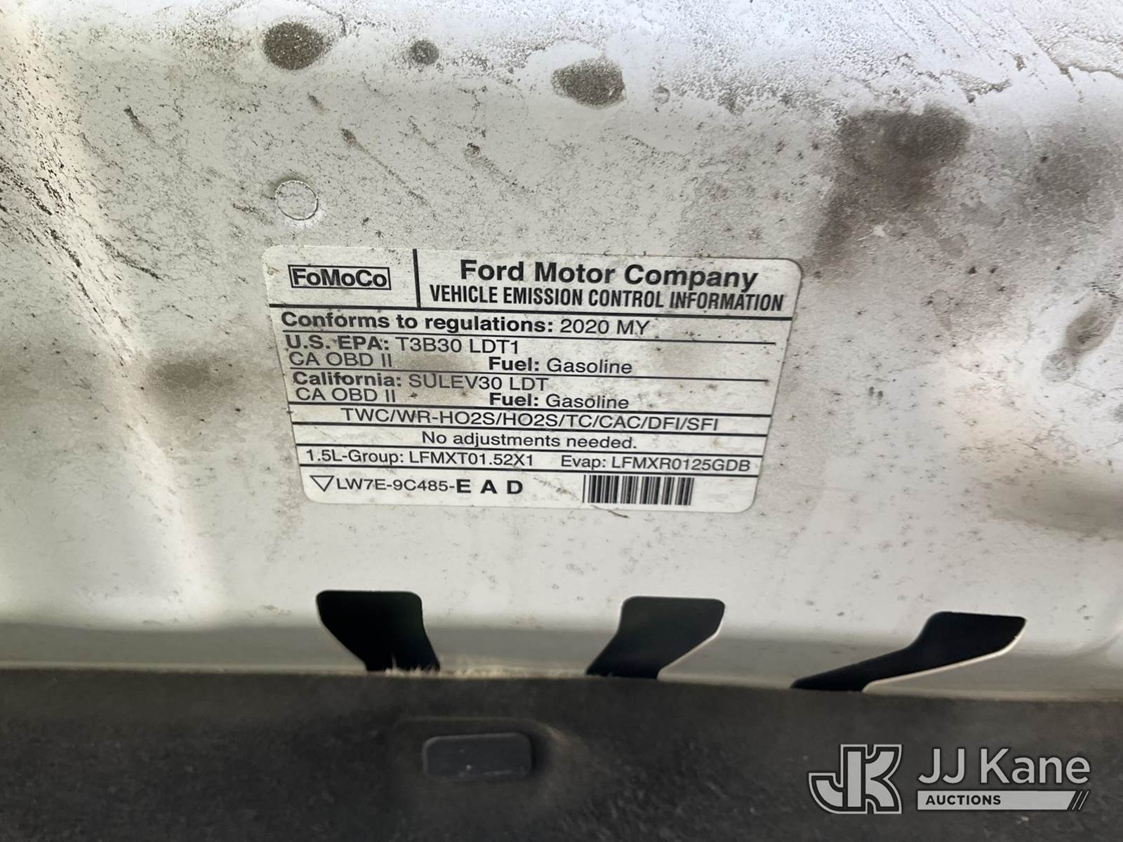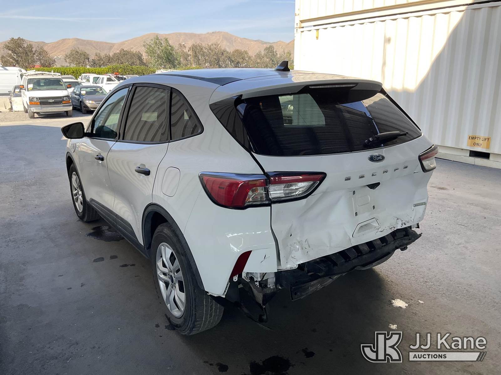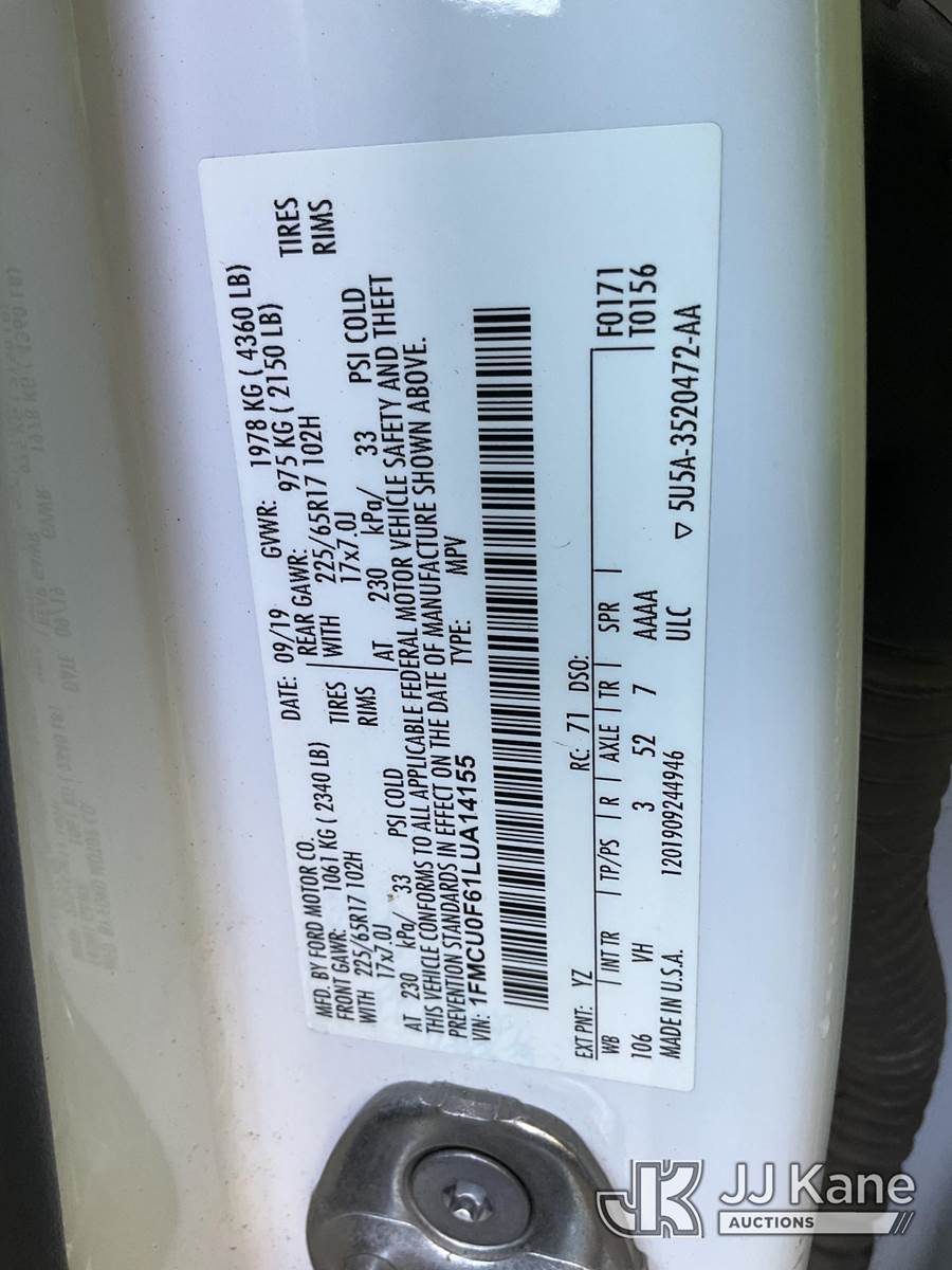 2020 Ford Escape S 4-Door Sport Utility Vehicle, s/n 1FMCU0F61LUA14155, 1.5L L3 FWD, GAS, 8-Speed Automatic, A/C, (75,013 miles) Open (Runs & Moves, Damaged Exhaust, Undercarriage Damaged, Rear Body Damage, Airbag Light On, Driver Seat Loose, Open Recall, Remedy Not Yet Available, Vehicle is subject to an open NHTSA safety recall related to LIQUID FUEL ANDOR FUEL VAPOR THAT ACCUMULATES NEAR A HOT SURFACE, SUCH AS HOT ENGINE OR EXHAUST COMPONENTS MAY IGNITE RESULTING IN AN UNDER-HOOD FIRE, INCREASING THE RISK OF INJURY., but a remedy for this recall does not appear to be available. Dealer is not authorized to perform the recall repair. Periodically contact the manufacturer or check the VIN on the NHTSA website at www.safercar.govivin to determine whether a remedy for the recall is available. As soon as a remedy is available, arrange to have the recall remedied with a dealer from that make of car to make such repair.) (Bidding Restricted to Licensed Vehicle Dealers Only), This is a Titled Item NOTE: This unit is being sold AS IS/WHERE IS via Timed Auction and is located in Jurupa Valley, CA. Inspection & preview days for this unit are the 2 business days prior to the first day of items closing for this auction, item is located at 4510 Muth Way Jurupa Valley, CA 92509 and hours of operations are 8a-4p. For pre-sale questions, please contact please contact Office Staff @ (310) 353-7140. Dealer License Number 45696. (Buyer is responsible for removal. Assistance by consignor or JJ Kane Auctions is not assured.)