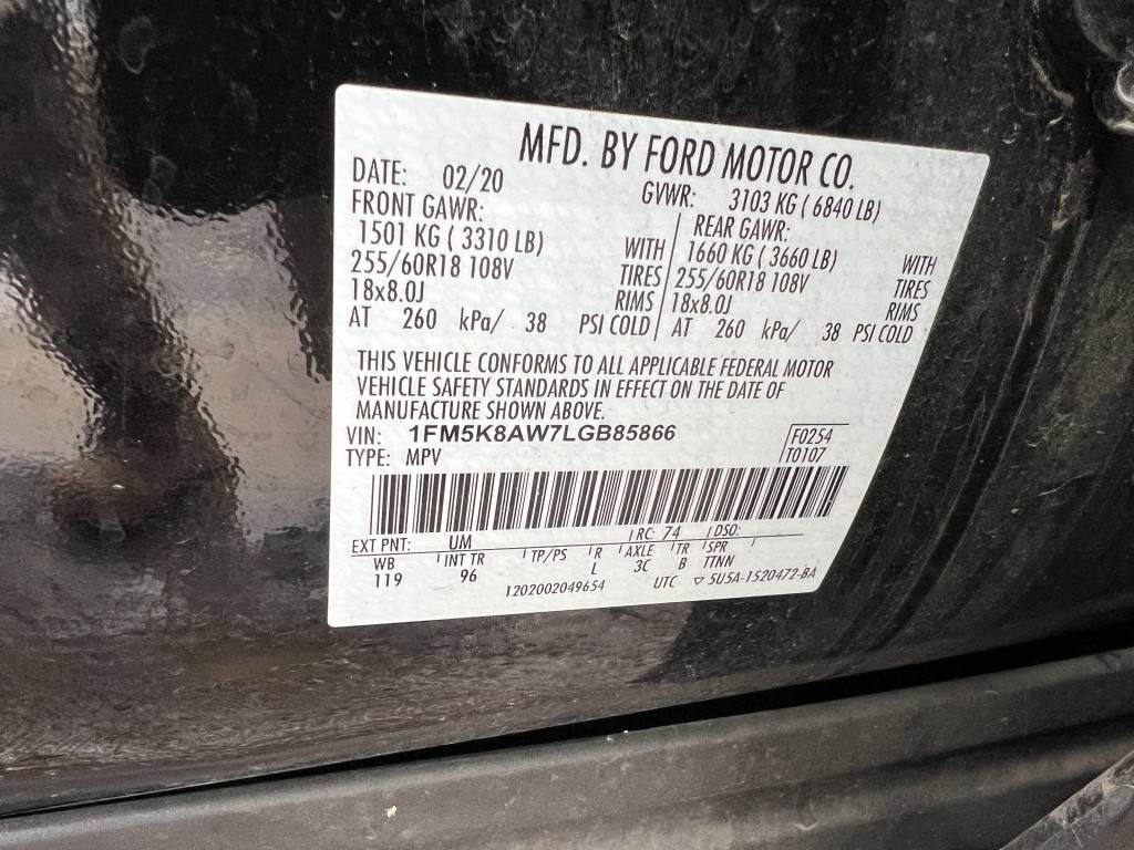 Location: Washougal WA ***City Government Surplus*** VIN: 1FM5K8AW7LGB85866 Engine: 3.3L 6cyl Hybrid Transmission: Automatic *No center console, no rear seats, no rear cargo floor* Spotlights, tow package, rearview camera, power windows, power mirrors, power locks, cruise control, 1,114 idle hours, 2,968 total engine hours, A/C, AM/FM/Bluetooth, 255/60R18 tires. Miles: 76,924