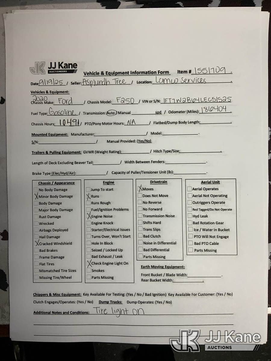 2020 Ford F-250 4x4 Crew-Cab Pickup Truck, 8-cyl gas, Auto, A/C, (Runs & Moves) (Check Engine Light On, Engine Noise, Cracked Windshield, Body Damage, Tire Light On) (Reads 186,404 hours) This is a Titled Item NOTE: This unit is being sold AS IS/WHERE IS via Timed Auction and is located in Graysville, AL. Inspection & preview days for this unit are by appointment only; please contact us at contact@jjkane.com or 84-Go-JJKane for more details. Alabama Auctioneer Michael Whitebread - License # 5592 (Buyer is responsible for removal. Assistance by consignor or JJ Kane Auctioneers is not assured.)
