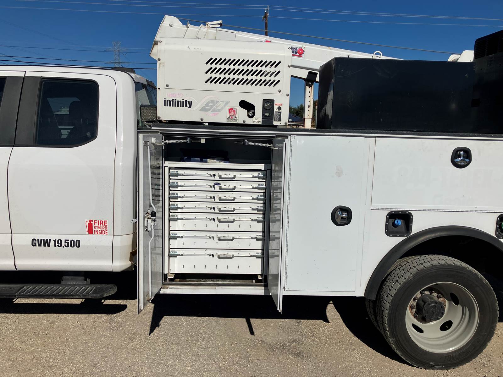 2020 F550 Extended Cab Mechanics Truck, 4WD, 6.7L Powerstroke, 144,264 miles, Venturo HT45 KX 7500lb crane, Infinity 80 Hydraulic Air Compressor, Miller 325 Trailblazer welder.