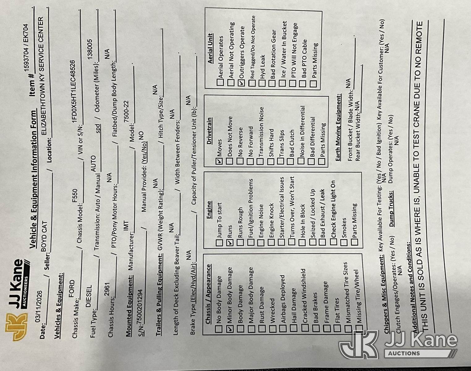 2020 Ford F-550 Mechanics Service Truck, 6.7L Diesel 4WD, Auto, A/C, with IMT 7500 Service Crane, IMT CAS40P-AW, (138,005 miles) (Runs & Moves) (Crane Condition Unknown, Missing Remote, Seller Note: Crane Operated with Remote) This is a Titled Item NOTE: This unit is being sold AS IS/WHERE IS via Timed Auction and is located in Elizabethtown, KY. Inspection & preview days for this unit are by appointment only; please contact us at contact@jjkane.com or 84-Go-JJKane for more details. Kentucky Auctioneer Michael Whitebread - License # 256617 (Buyer is responsible for removal. Assistance by consignor or JJ Kane Auctions is not assured.)