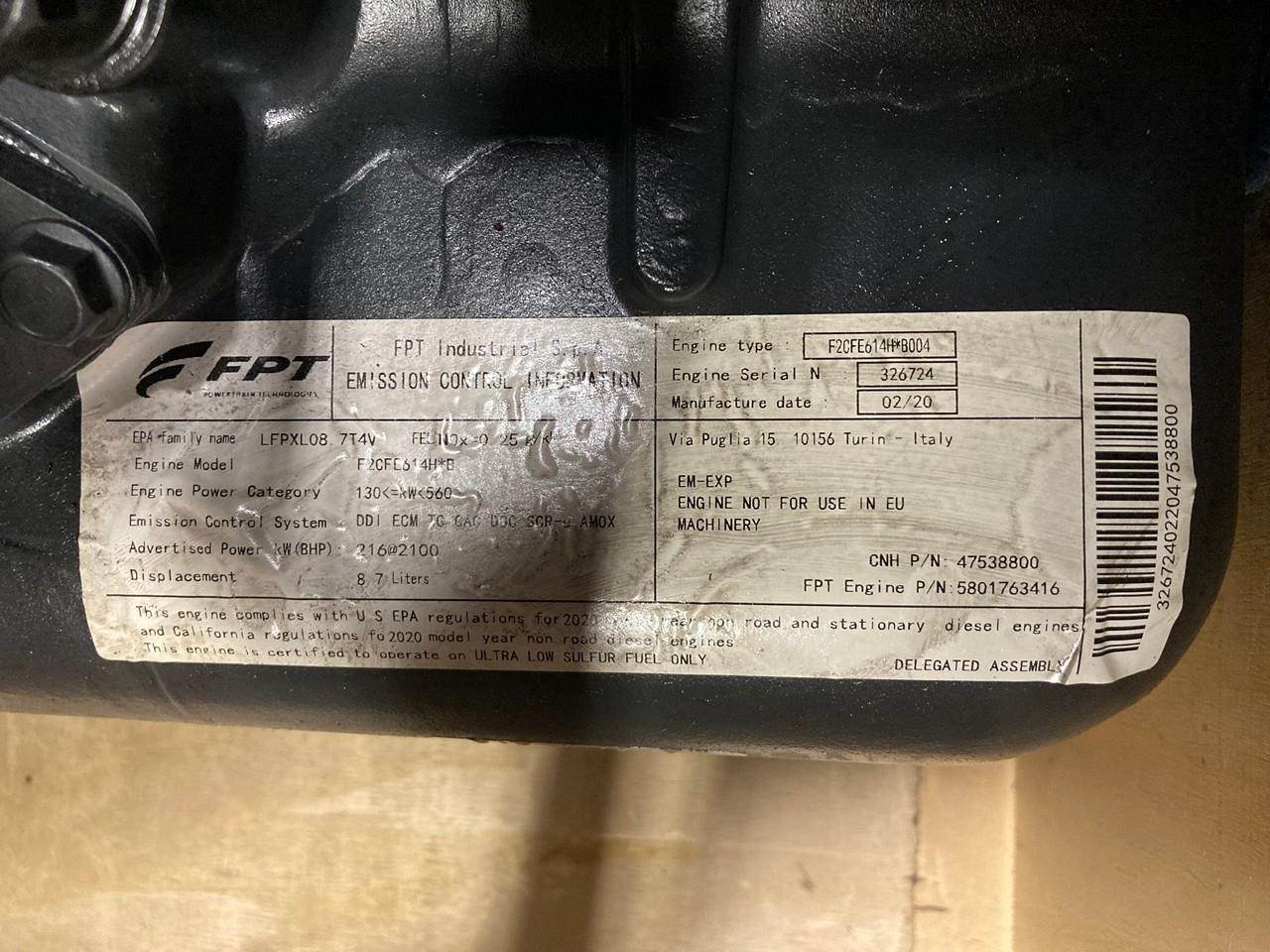 NEW 2020 FPT F2CFE614H 290 HP CURSOR 9 DIESEL ENGINE FOR SALE at ADELMAN’S TRUCK PARTS in CANTON, OHIO. COMPLETE (MINUS STARTER & ALTERNATOR), w/ECM, FLYWHEEL, & HOUSING, MODEL F2CFE614H*B004, 290 HP @ 2100 RPM, 8.7 LITERS, TIER 4 FINAL, LFPXL08.7T4X FAMILY #, with DDI, ECM, TC, CAC, DOC, SCR-U, & AMOX EMISSIONS CONTROL SYSTEMS. CNH PART #: 47538800, FPT PART #: 5801763416