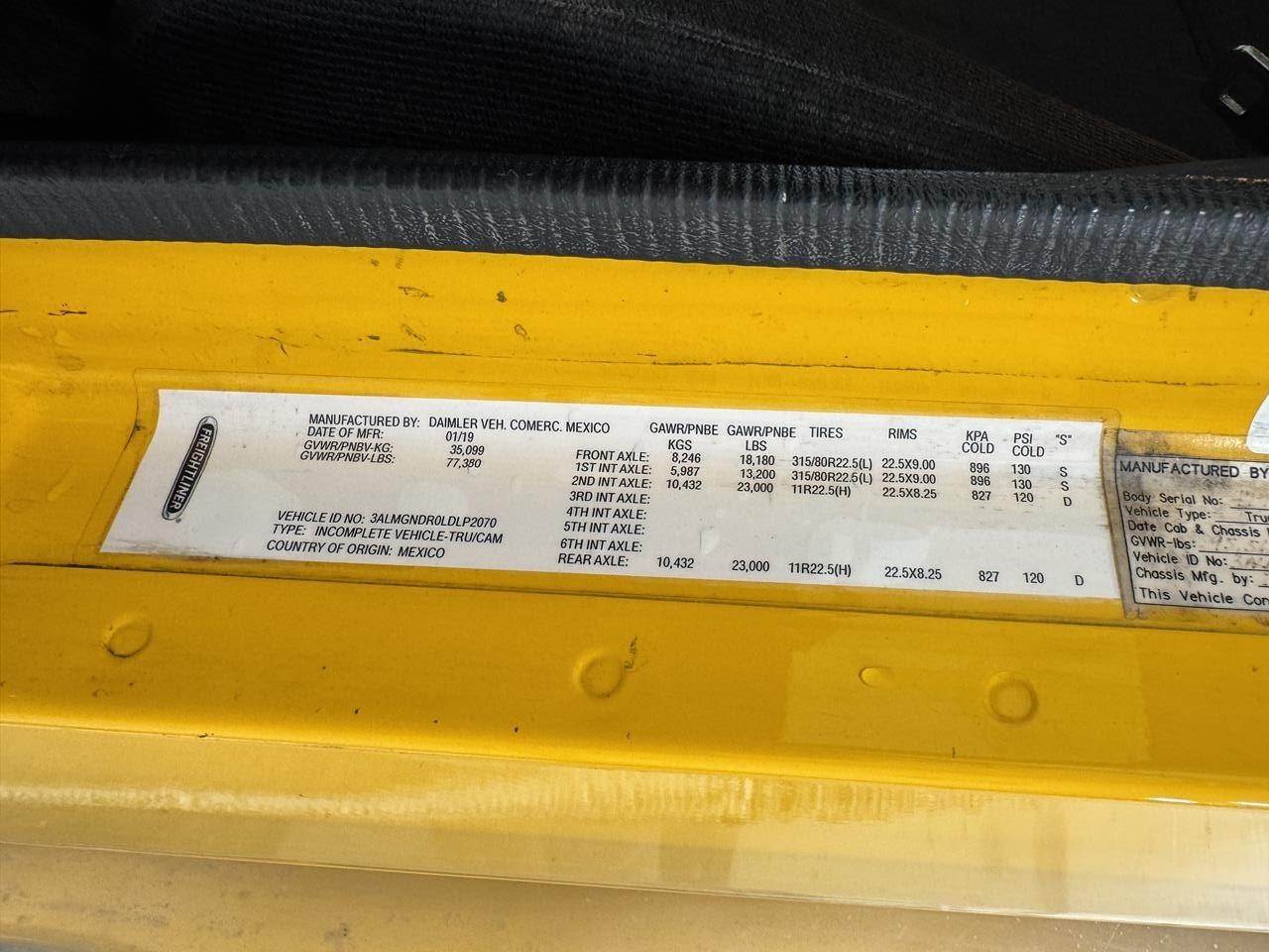 2020 FREIGHTLINER 122SD, DD15 ENGINE 505 HP, ALLISON AUTOMATIC 6 SPD TRANSMISSION, MID AND REAR LIFT AXLES, 20 FT ALUMINUM BED, 18,180 LBS FRONT, 13,200LBS INT 46K REARS, 18,180 REAR AXLE WEIGHT, ELECTRIC TARP, CLEAN INTERIOR, WOODGRAIN TRIM, COLD A/C, NO ENGINE LIGHTS PRESENT!!