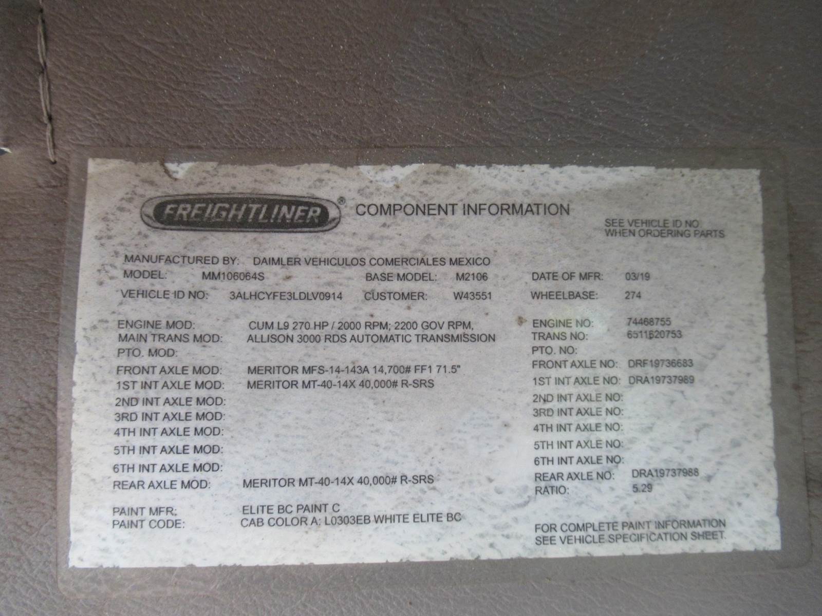 2020 FREIGHTLINER M2106 WITH 275,822 MILES, CUMMINS L9 DIESEL ENGINE, 24 FT FLATBED WITH PRINCETON KIT, ADJUSTABLE WHEEL STOPS, 270 HP, AUTOMATIC ALLISON 3000RDS TRANSMISSION, 274" WHEELBASE, 5.29 RATIO, AIR BRAKES, AIR RIDE, DIFF LOCK, A/C, 54,600 GVW! STOCK #8123