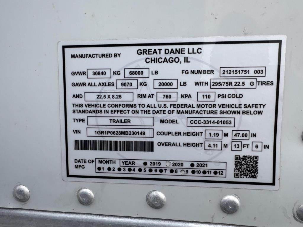 Location: Kaukauna, WI Approx 53' Length, 102" Width, 68000LB GVWR, Air Ride, Sliding Axles, 2 Speed Landing Gear, Rear Swing Doors, 295/75R22.5 Tires, Spare Tire VIN: 1GR1P0628MB230149