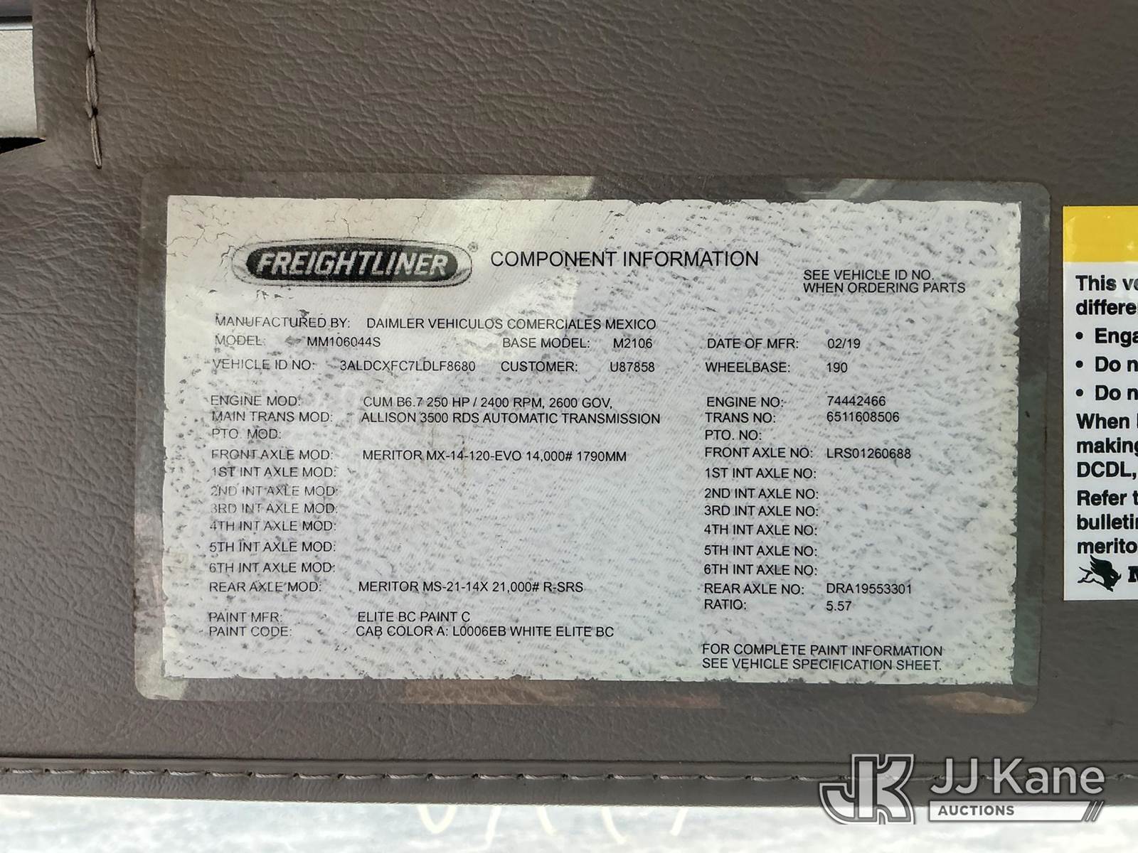 HiRanger TC55-MH, 60 ft, Material Handling Bucket Truck s/n 2190566693, with two-man bucket, rear mounted on 2020 Freightliner M2 106 Utility Truck, Cummins ISB-250 6.7L diesel, Auto, A/C, (64,499 miles) (Runs & Moves) (Upper Condition Unknown, PTO Does Not Display, Missing Jib Head) This is a Titled Item NOTE: This unit is being sold AS IS/WHERE IS via Timed Auction and is located in China Grove, NC. Inspection & preview days for this unit are the 2 business days prior to the first day of items closing for this auction, item is located at 820 E NC Hwy 152 China Grove, NC 28023 and hours of operations are 8a-4p. For pre-sale questions, please contact Office Staff @ (704) 674-1113. (Manuals provided in cab) (Buyer is responsible for removal. Assistance by consignor or JJ Kane Auctioneers is not assured.)