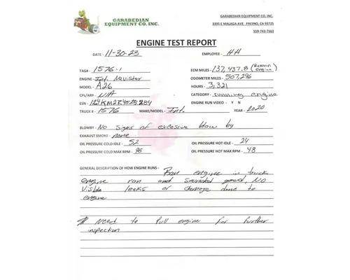 A26 Remanufactured Engine, P/N 5011733R91, S/N 124KM2R4525284 507,296 Odometer Miles 137,437.8 ECM Miles