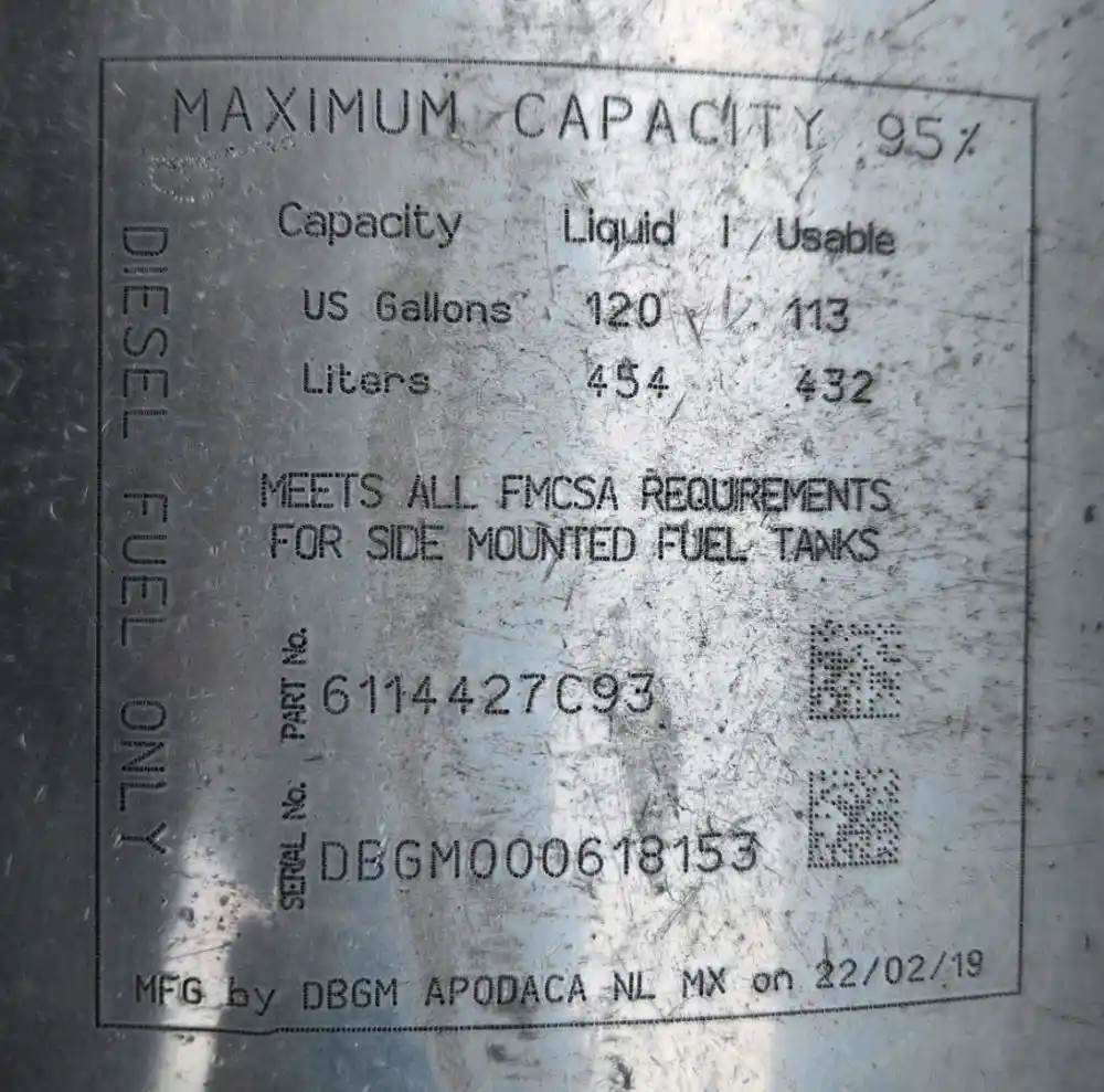 (Used) 2020 International HX520, FUEL TANK- Part Number: 6114427C93, Serial Number: DBGM000618153, Side: Driver Left Side, Capacity: 120 Gallons, Material: Aluminum, Shape: Round, Dimensions: L=65 ½", D=24", It's Dented, Damage Reference images for condition, For more information about this item, give us a call. We ship Worldwide! (CRG HEAVY TRUCK PARTS) 929 W PULASKI HWY ELKTON, MD 21921, Capacity: 120 Gallons, Dimensions: L=65 ½", D=24", Material: Aluminum, Fuel Tank Shape: Round