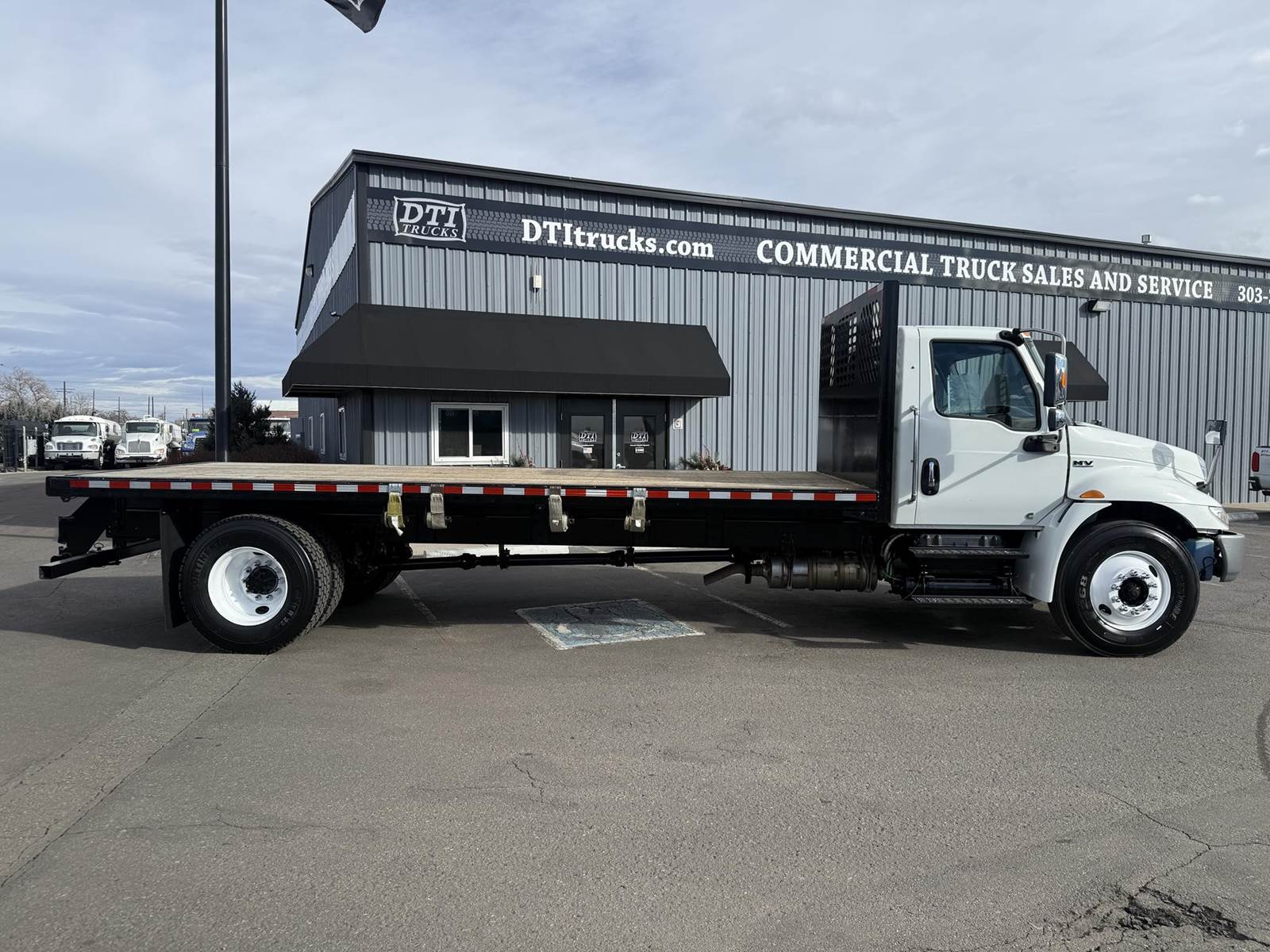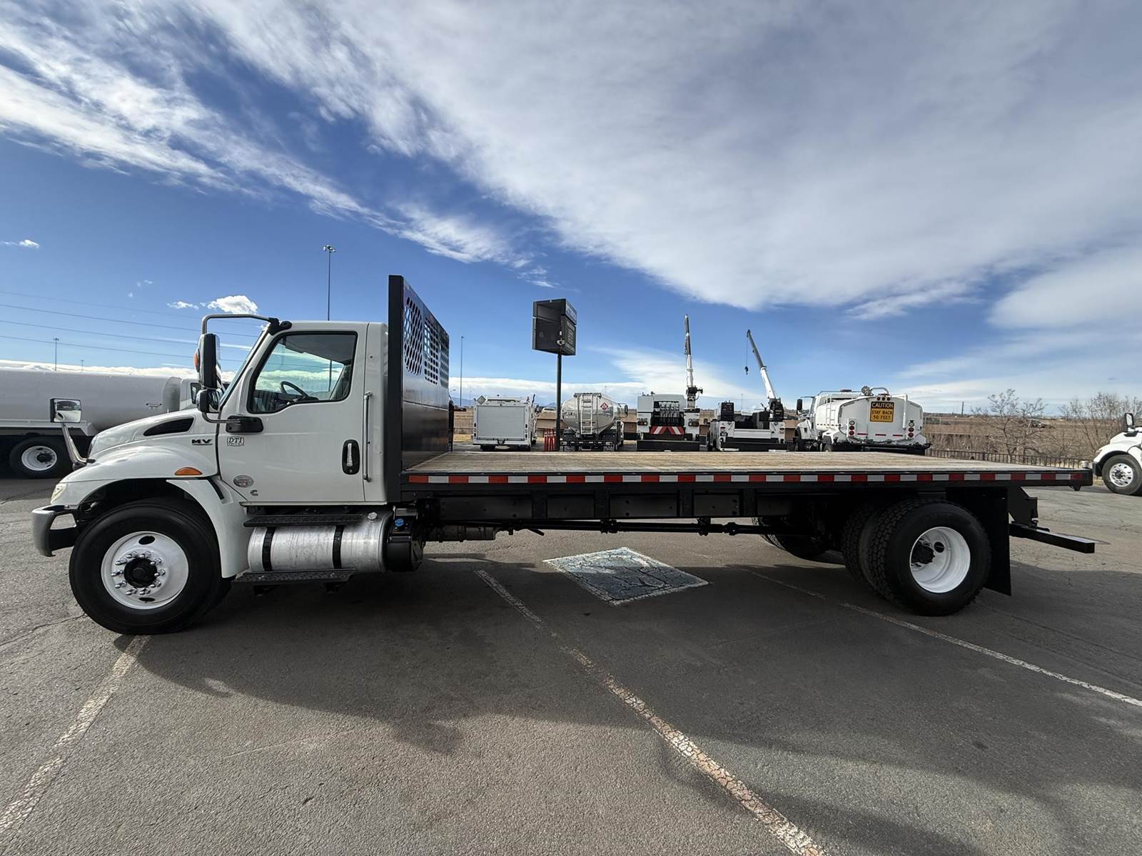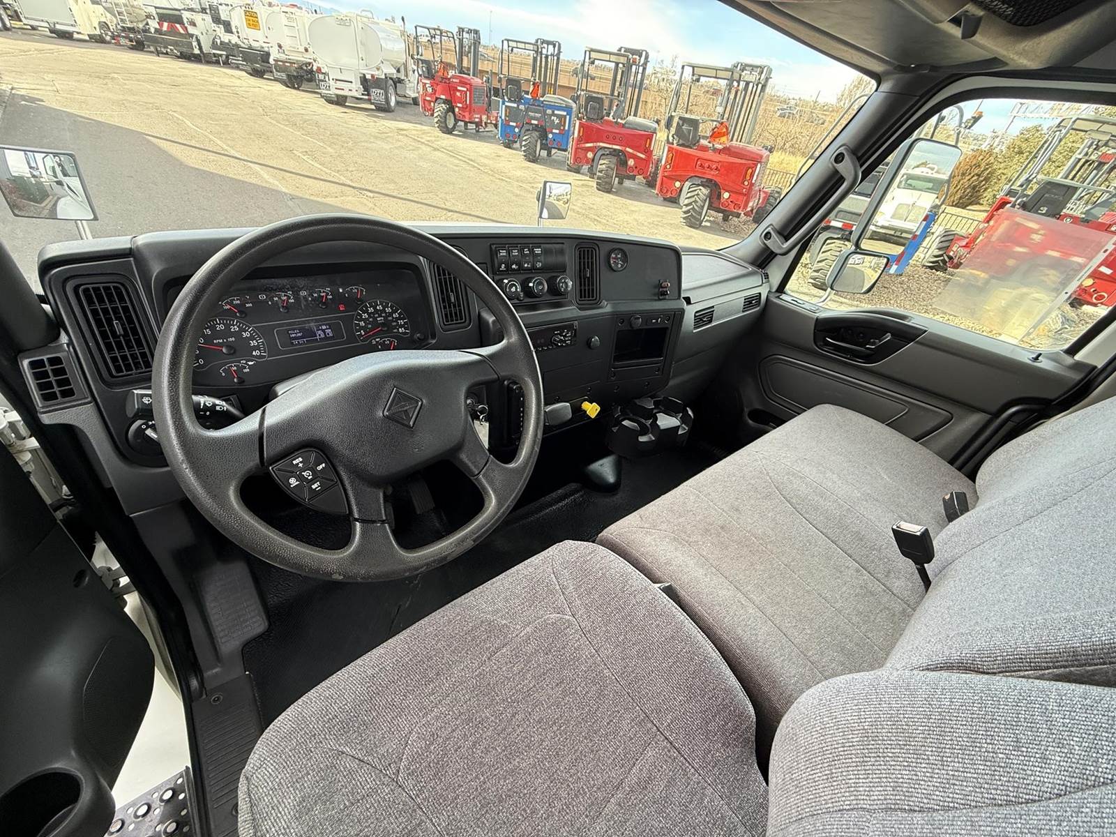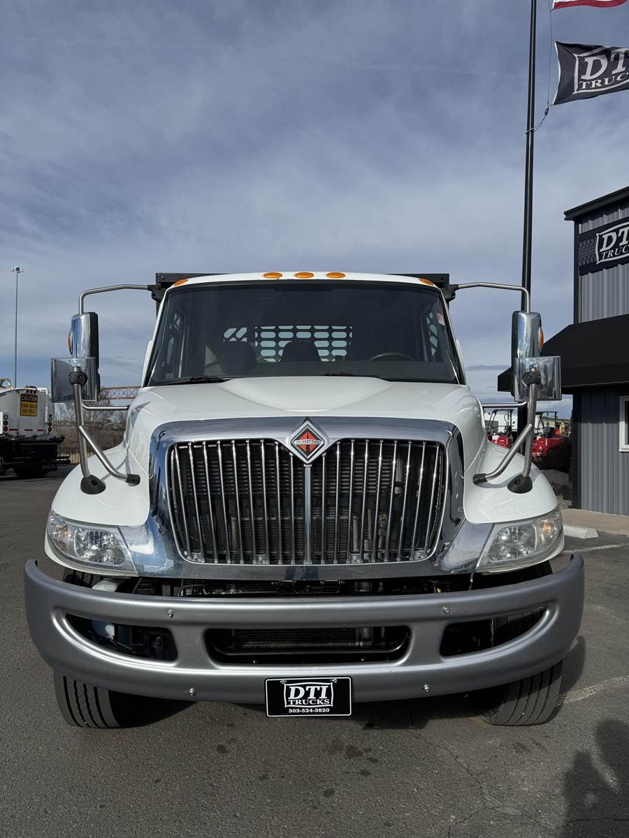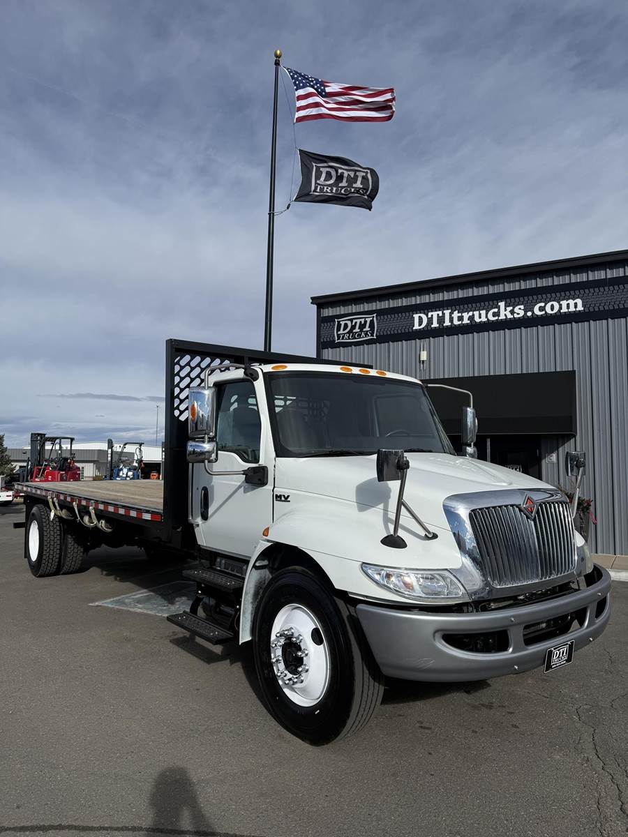 2020 International MV607 Single Axle Flatbed Truck, 6.7L Cummins Turbo Diesel Engine, 200 HP, Allison 5 Speed Automatic Transmission, 109,267 Miles & 5,242 Engine Hours, 25,999 LB GVWR (10K Steer Axle, 21K Drive Axle), NO CDL REQUIRED, 258” Wheel Base, 192” CTA, Air Ride Suspension With Dump Valve, 4.88 Axle Ratio, Air Brakes, 11R22.5 Tires All Mounted On Steel Wheels, 70 Gallon Aluminum Diesel Fuel Tank, Block Heater, CARB Compliant, Air Conditioning, Tilt Steering Wheel, Cruise Control, Bluetooth Radio, Power Windows & Locks, Power & Heated Mirrors, Air Ride Driver Seat, Bench Passenger Seat, 20’ Wood Deck Flatbed, 96” Wide, (4) Sliding Winches, (1) Fixed Winch, Donkey Forklift Mount. This International Flatbed Truck Is Available At DTI Trucks In Denver, CO. Stock #18009D. Call Or Text Brent For More Information (303) > 598 > 1923
