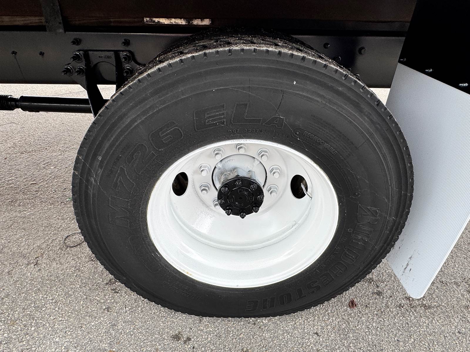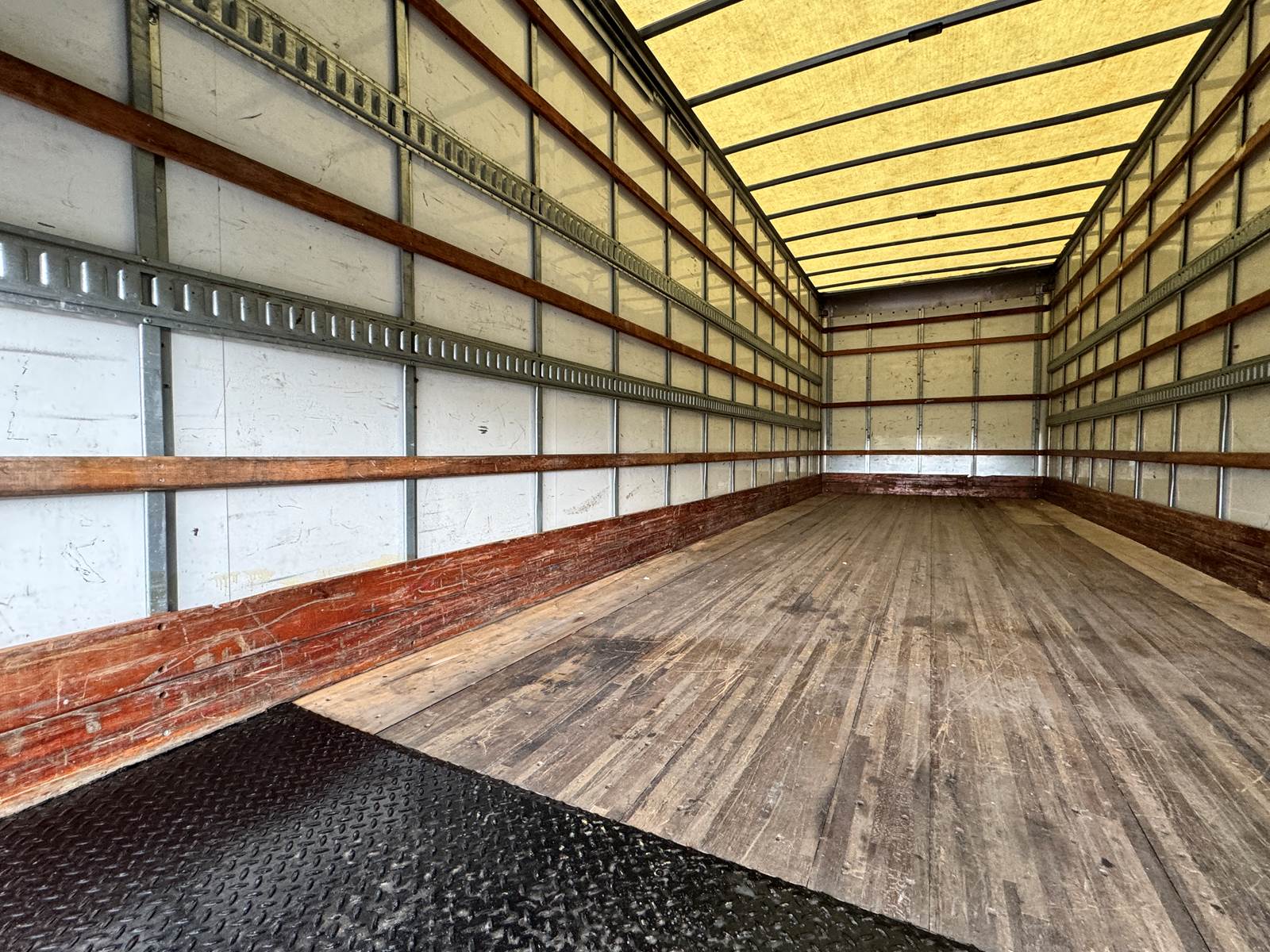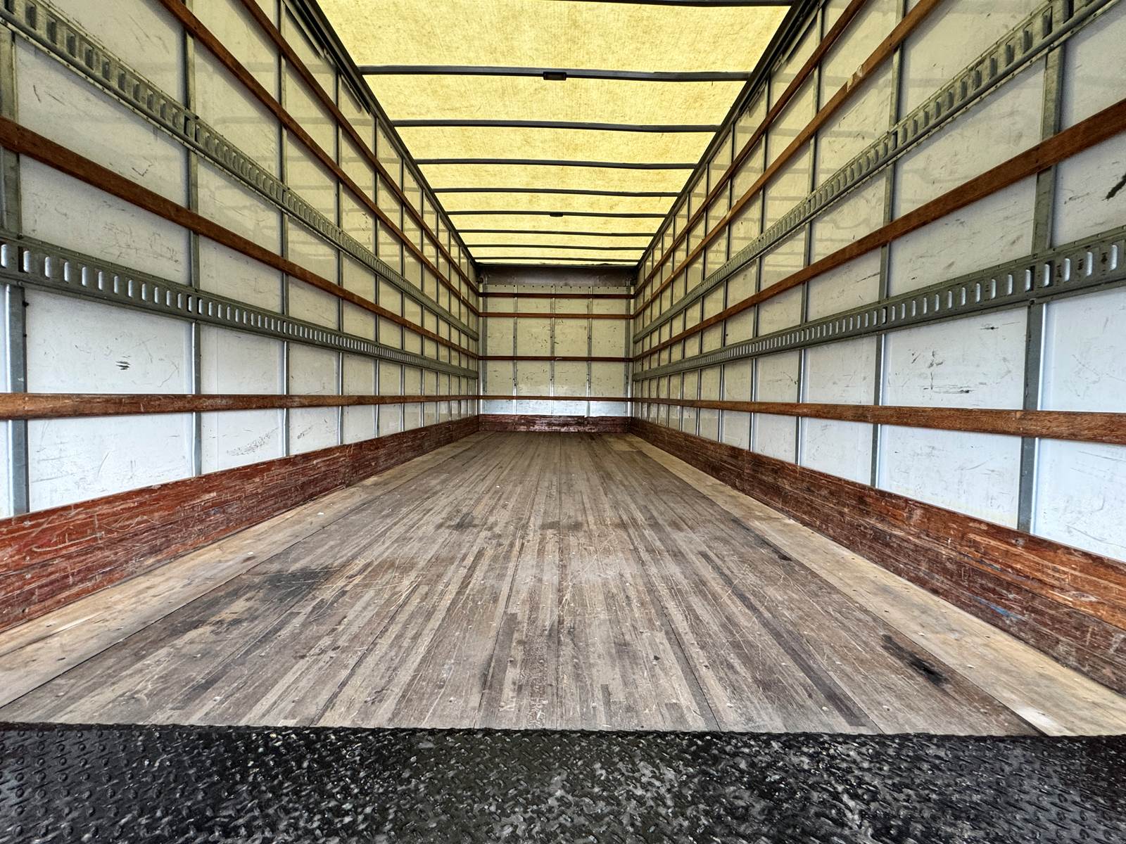 The truck is fitted with a 26-foot aluminum body by A.M. Ahire Manufacturing & Service Corp., featuring a translucent roof for added visibility, plywood paneled interior walls, and two rows of E-tracks for flexible cargo management. A roll-up rear door allows efficient access, while the Maxon 3,000 lb aluminum tuckaway liftgate makes loading and unloading heavy freight simple and secure.