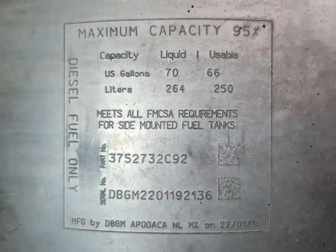 (Used) 2020 International MV607, FUEL TANK- Part Number: 3752732C92, Serial Number: DBGM2201192136, Side: Passenger Right Side, Capacity: 50 Gallons, Material: Aluminum, Shape: D, Dimensions: L=37.5", H=18.5", W=25", Reference images for condition, For more information about this item, give us a call. We ship Worldwide! (CRG HEAVY TRUCK PARTS) 929 W PULASKI HWY ELKTON, MD 21921, Capacity: 70 Gallons, Dimensions: L=37.5", H=18.5", W=25", Material: Aluminum, Fuel Tank Shape: D-Shape