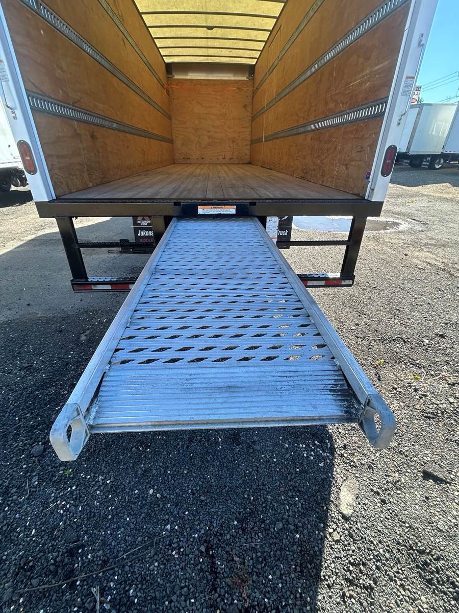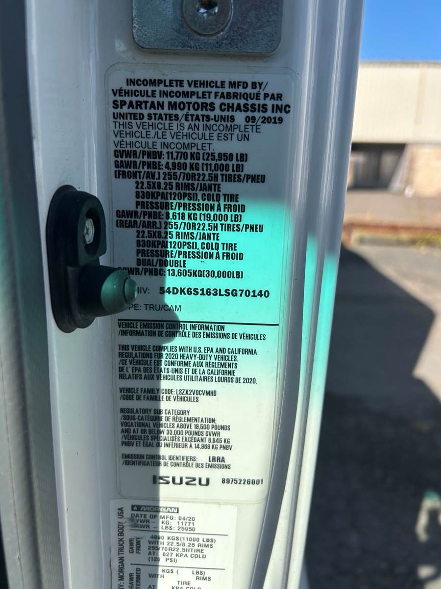 The 2020 Isuzu FTR 26' Box Truck is a durable, diesel-powered hauler built for medium-duty delivery tasks. Powered by an Isuzu 4HK1-TC 5.2L turbocharged diesel engine, it delivers 215 horsepower and 520 lb-ft of torque, paired with an Allison 2550 RDS 6-speed automatic transmission with double overdrive for smooth, fuel-efficient performance. With a 25,950 lbs. gross vehicle weight rating (GVWR), this Class 6 truck features a spacious 26-foot box, ideal for logistics, moving services, or freight transport. Its low-cab-forward design ensures excellent visibility and a tight turning radius, perfect for navigating urban routes or tight loading zones. The cab seats up to three and offers air conditioning, power windows, and an ergonomic layout for long shifts. Reliable and efficient, this 2020 Isuzu FTR is a top choice for businesses needing a sturdy hauler.