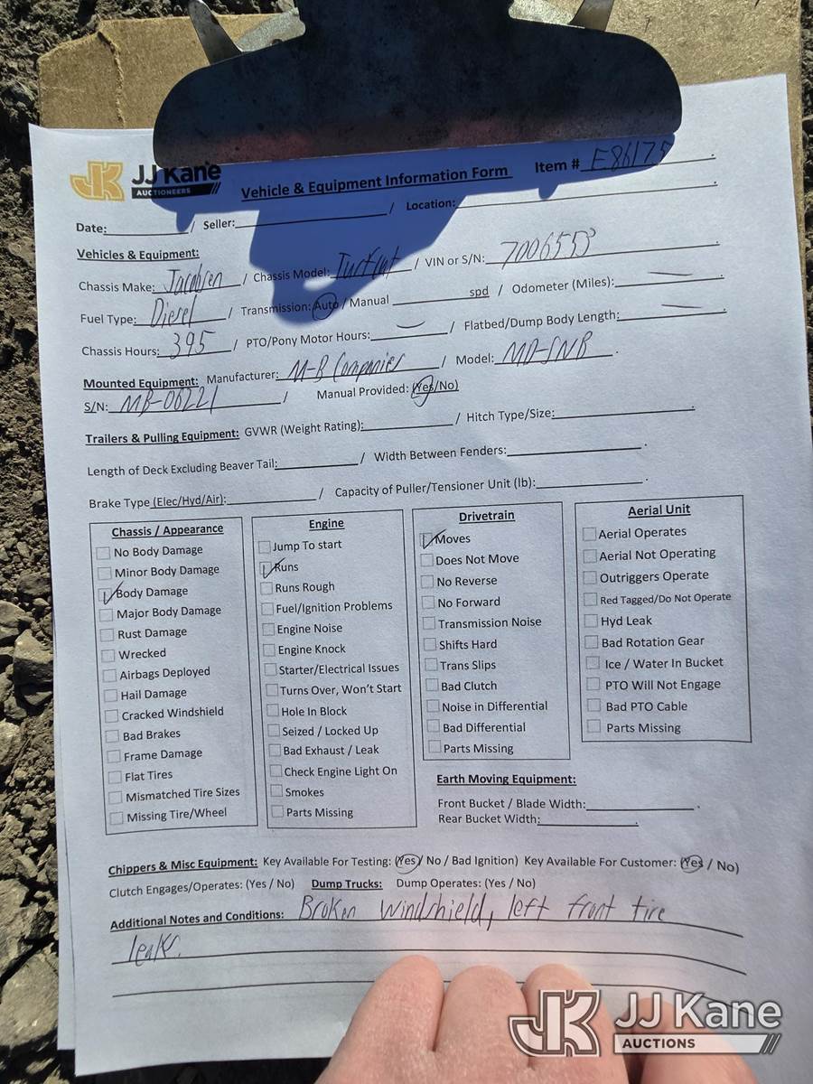 2020 Jacobsen Turf Cat Zero Turn Riding Mower, s/n 7006553, Kubota Hydrostatic, diesel, with 52in front mounted-rear discharge mower, snowblower-on pallet & EROPS, (Runs & Moves)(Missing Front Windshield, Left Front Tire Leaks Air) (Reads 395 hours) NOTE: This unit is being sold AS IS/WHERE IS via Timed Auction and is located in Oshkosh, WI. Inspection & preview days for this unit are by appointment only; please contact us at contact@jjkane.com or 84-Go-JJKane for more details. (Buyer is responsible for removal. Assistance by consignor or JJ Kane Auctioneers is not assured.)