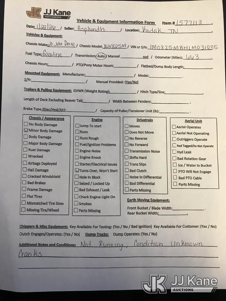 2020 John Deere XUV825M S4 4x4 Crew Cab ATV,UTV, Side by Side, s/n 1M0825MBHLM031035, gas, Auto, (No Title) (Not Running, Condition Unknown) (Seller States: front differential, needs clutch, etc) (Reads 663 hours) NOTE: This unit is being sold AS IS/WHERE IS via Timed Auction and is located in Kodak, TN. Inspection & preview days for this unit are by appointment only; please contact us at contact@jjkane.com or 84-Go-JJKane for more details. (Buyer is responsible for removal. Assistance by consignor or JJ Kane Auctions is not assured.)