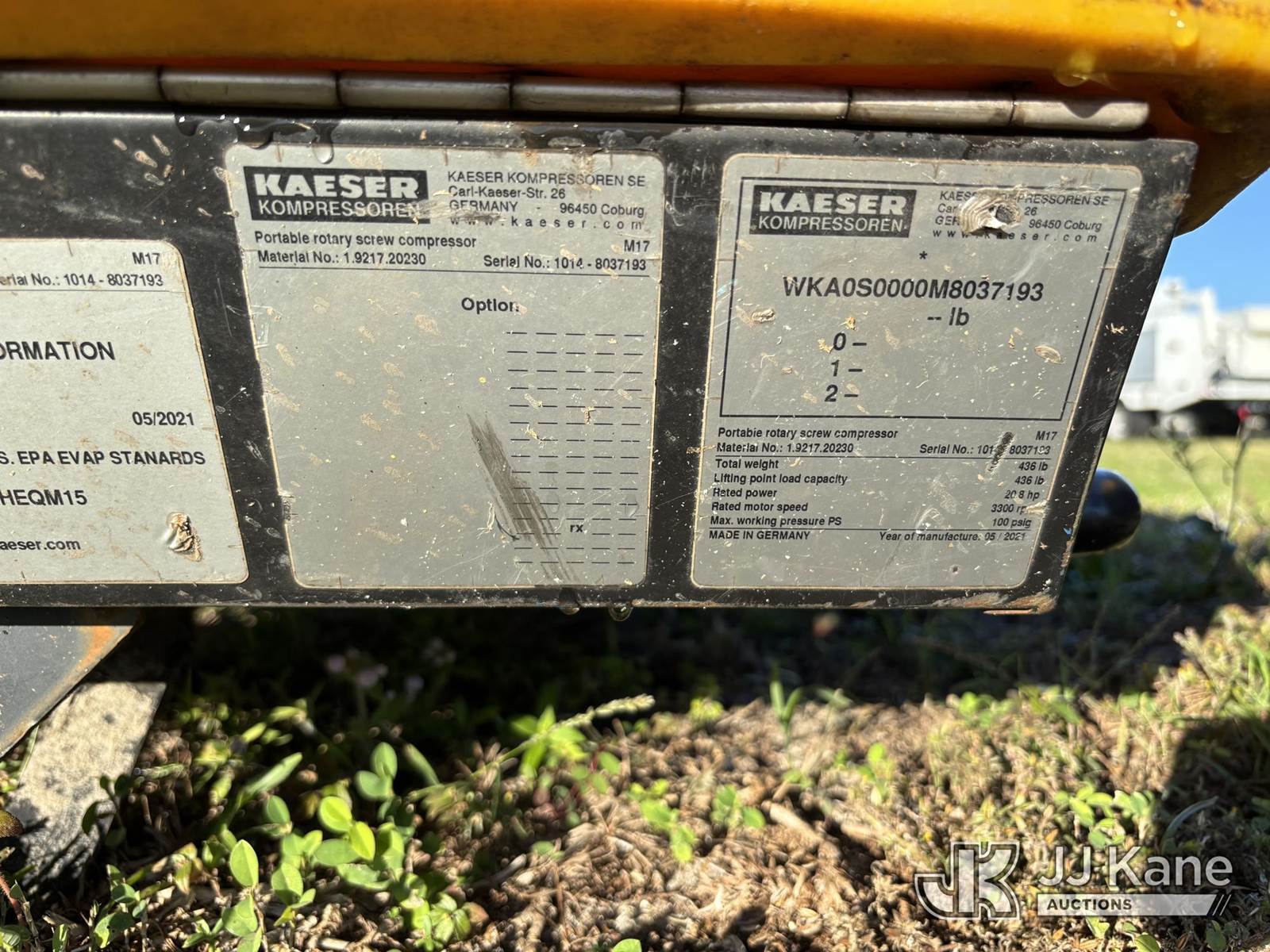 2020 Kaeser M17 Air Compressor, s/n 10148037193, Honda gas, (Runs) (Missing Wheels, Used, Body Damage) (Reads 22 hours) NOTE: This unit is being sold AS IS/WHERE IS via Timed Auction and is located in Westlake, FL. Inspection & preview days for this unit are the 2 business days prior to the first day of items closing for this auction, item is located at 4003 Seminole Pratt Whitney Rd Westlake, FL 33470 and hours of operations are 8a-4p. For pre-sale questions, please contact: Matt Johnson @ (205) 847-9106. (Buyer is responsible for removal. Assistance by consignor or JJ Kane Auctions is not assured.)