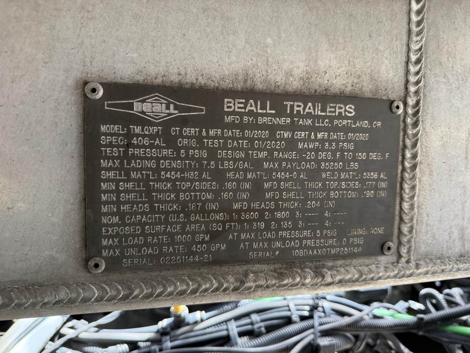 (Mfg. 01/20), Serial# 02251144-21, Model- TMLQXPT, DOT406AL, 5400 Gallon, 2-Compartment (3600,1800), Double Bulkhead, Air Operated Internals, 4" API 'Y' Bottom Load Heads w/ Brake Interlock, Roto Tags & Sight Glasses, Work Light @ Load Heads, Vapor Recovery w/ Brake Interlock, Civacon ROMII Overfill Monitor, Optic Socket, Offside Gravity Drops w/ Roto Tags & Sight Glasses, Offside Vapor Recovery, (2) L/H Stacked Hose Tubes, (2) R/H Stacked Hose Tubes, R/H Stick Tube, (2) Cross Body Hose Tubes, Aluminum Ladder @ Rear of Tank......