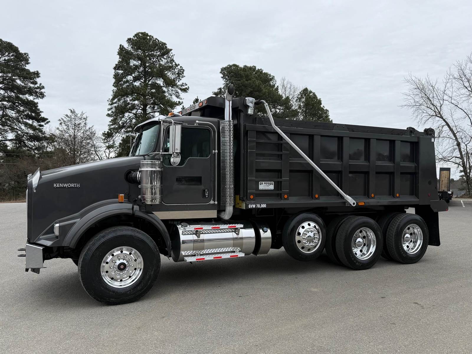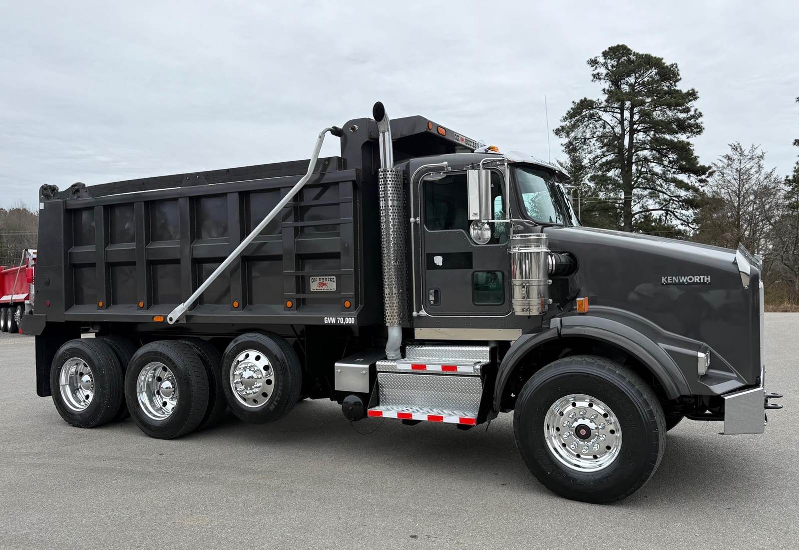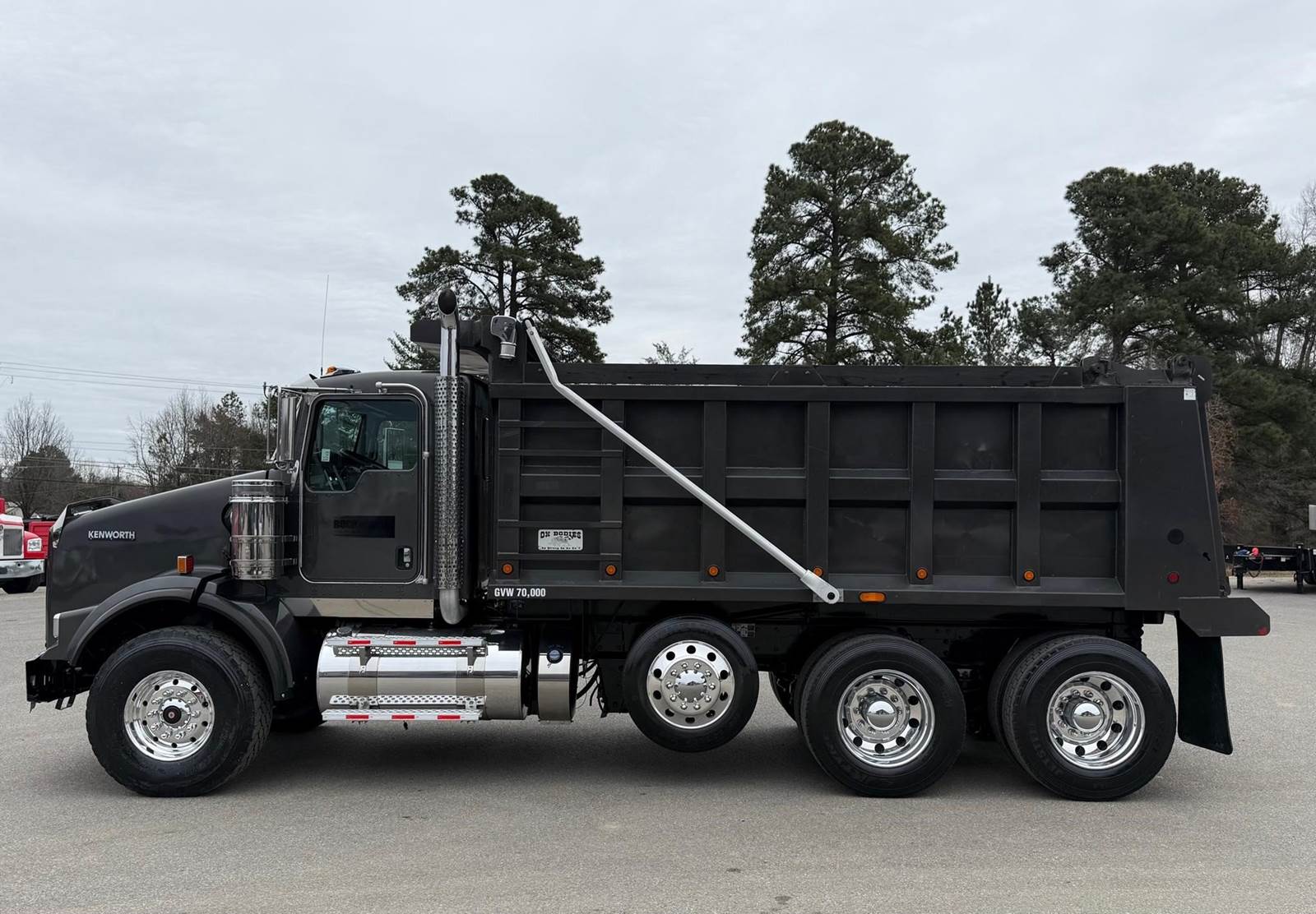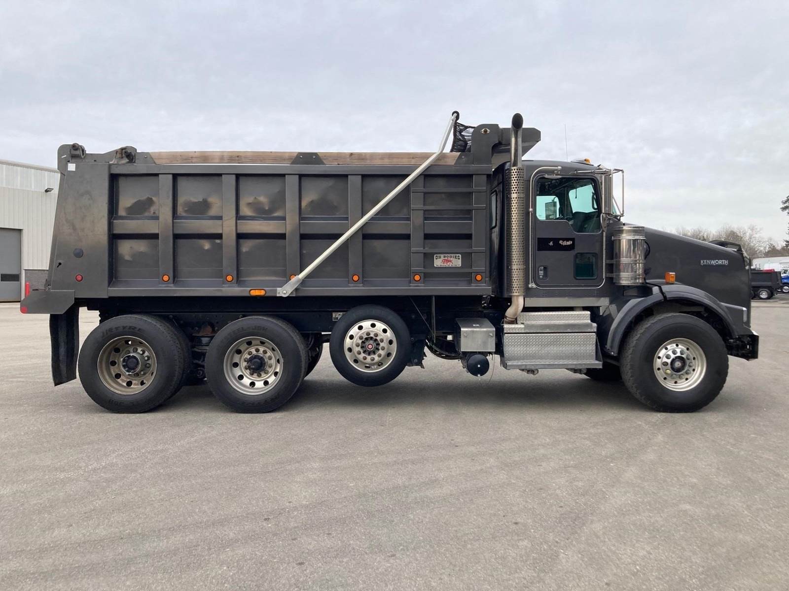 Triaxle, 16' Ox Steel Dump w/54" Sides, High Lift Gate, X15 Cummins 450 HP, 8LL, 4.10 Ratio, 3 Stage Engine Brake, Chalmers, Double Frame, 20K FA, 46K RA, 12,350 Steerable L/A, 212" WB, 19'11" Bridge, Dual P/S Boxes, Dual Exhaust Dual Stainless Breathers, Diff Lock, Electric Tarp, Air/High Lift Tailgate, P/S, A/C, AM/FM CD Bluetooth, Heated Mirrors, Cruise, Tilt/Tele Wheel, Power Locks, Mirrors, and Passenger Window, Dual High Back Seats, 110 Gallon Aluminum Fuel Tank, 425/65R22.5 Steer Tires on Aluminum Wheels, 11R24.5 Drive Tires on Aluminum Wheels Outside, Chrome Bumper