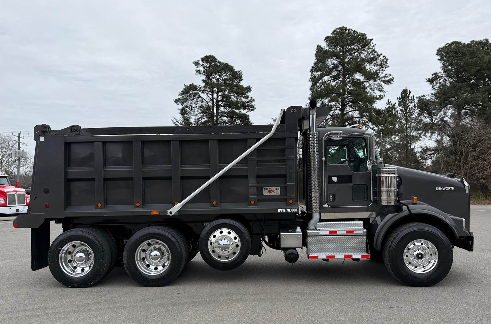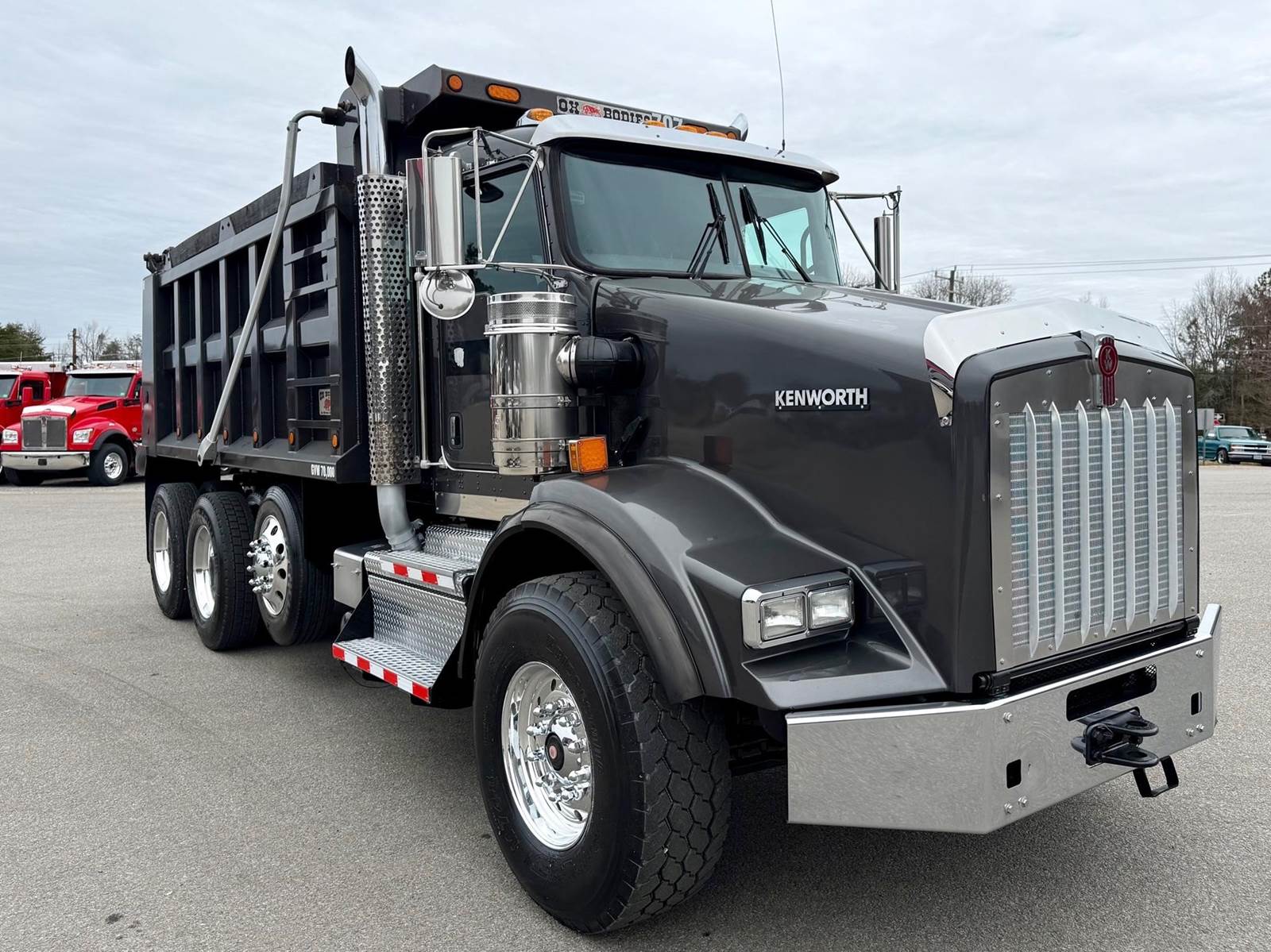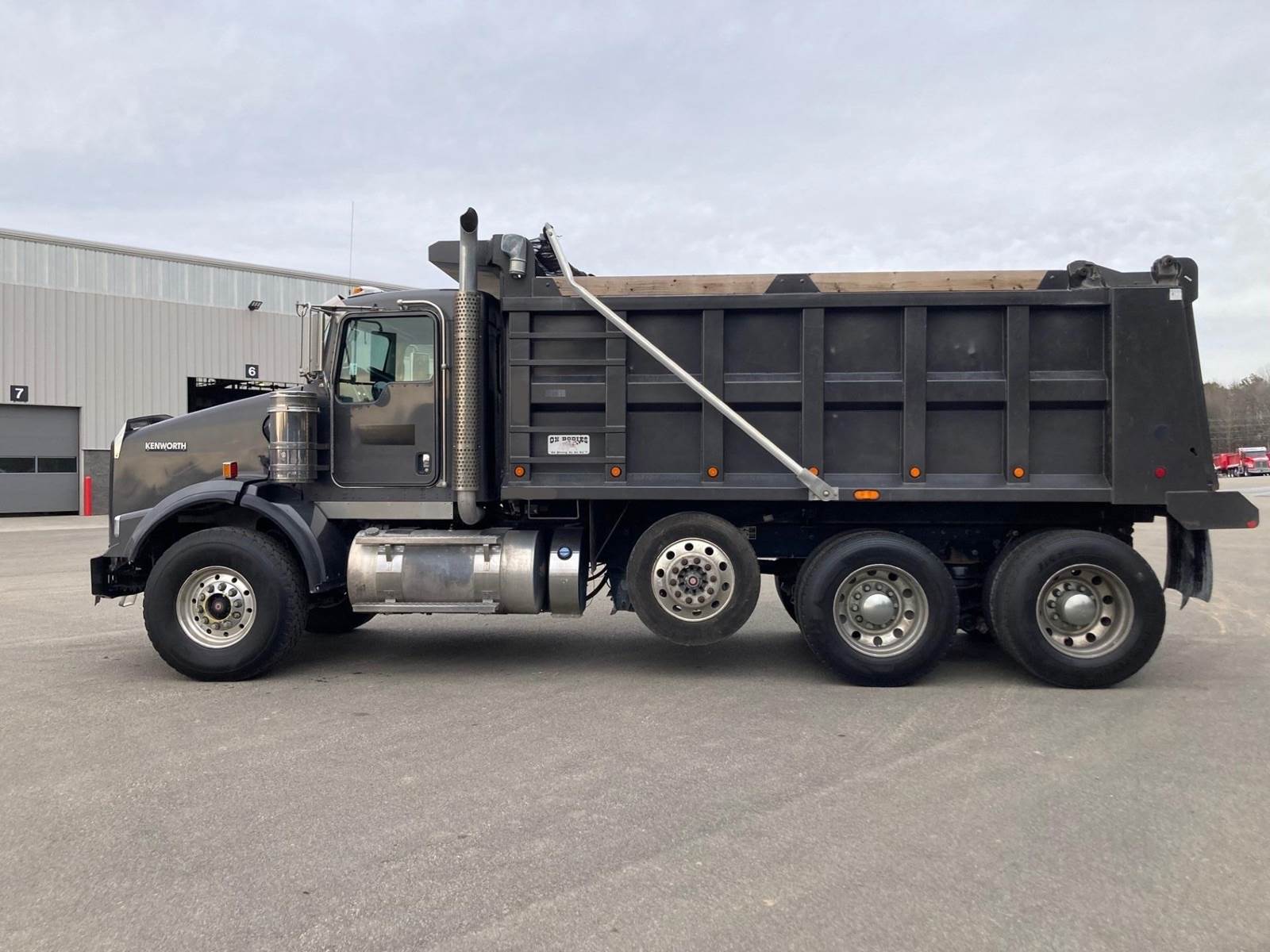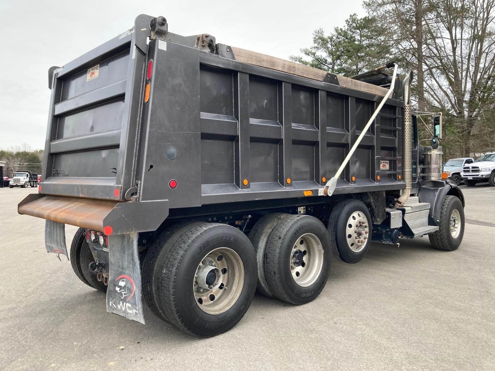 Triaxle, 16' Ox Steel Dump w/54" Sides, High Lift Gate, X15 Cummins 450 HP, 8LL, 4.10 Ratio, 3 Stage Engine Brake, Chalmers, Double Frame, 20K FA, 46K RA, 12,350 Steerable L/A, 212" WB, 19'11" Bridge, Dual P/S Boxes, Dual Exhaust Dual Stainless Breathers, Diff Lock, Electric Tarp, Air/High Lift Tailgate, P/S, A/C, AM/FM CD Bluetooth, Heated Mirrors, Cruise, Tilt/Tele Wheel, Power Locks, Mirrors, and Passenger Window, Dual High Back Seats, 110 Gallon Aluminum Fuel Tank, 425/65R22.5 Steer Tires on Aluminum Wheels, 11R24.5 Drive Tires on Aluminum Wheels Outside, Chrome Bumper