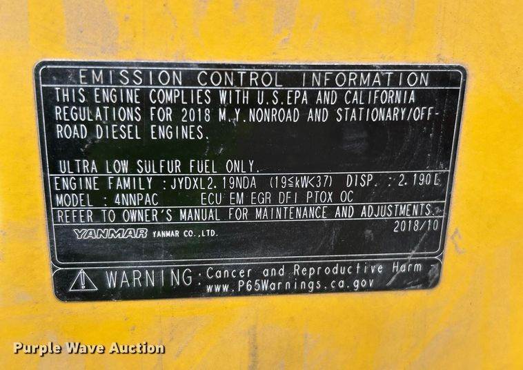 2019 New Holland E37C mini excavator, Hours: 437 on meter, Serial: NSUE37CCNZLN57597, Engine, Yanmar 4HNSAE1, Displacement: 1.6L,...