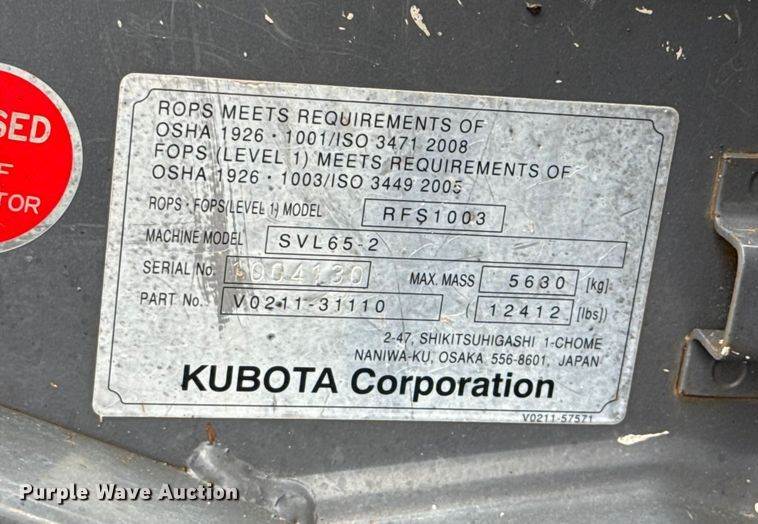 2020 Kubota SVL65-2 tracked skid steer loader