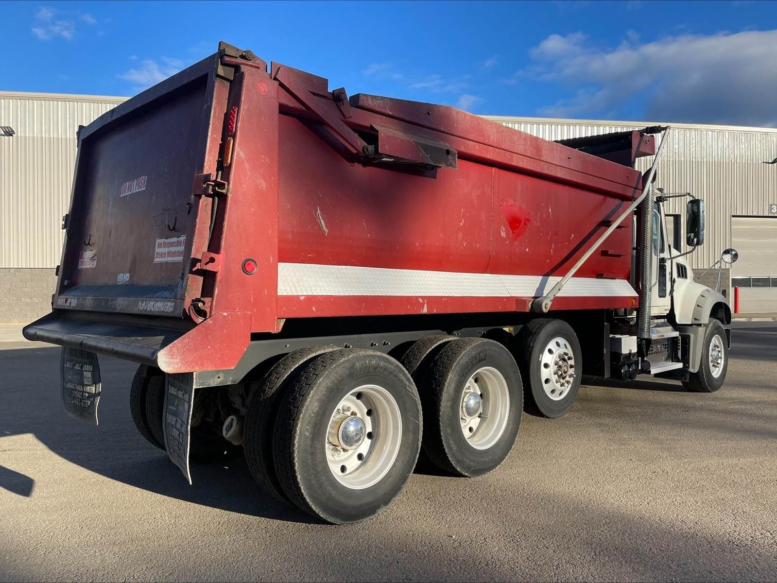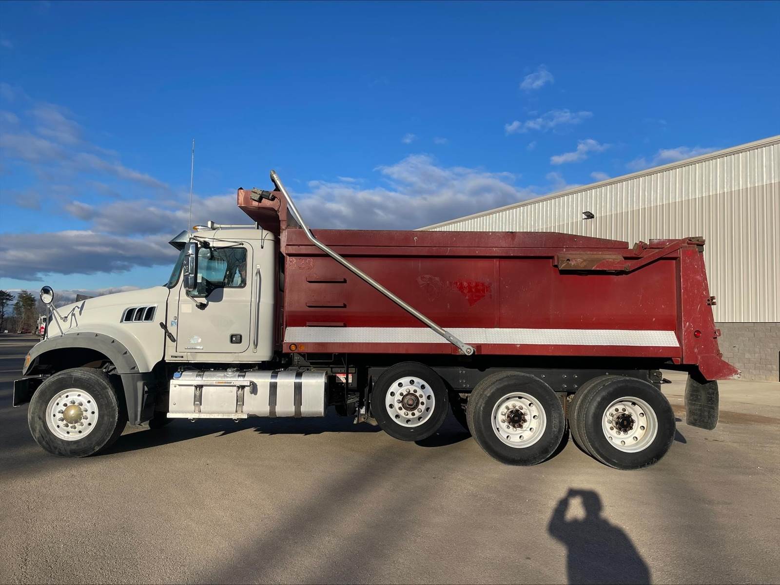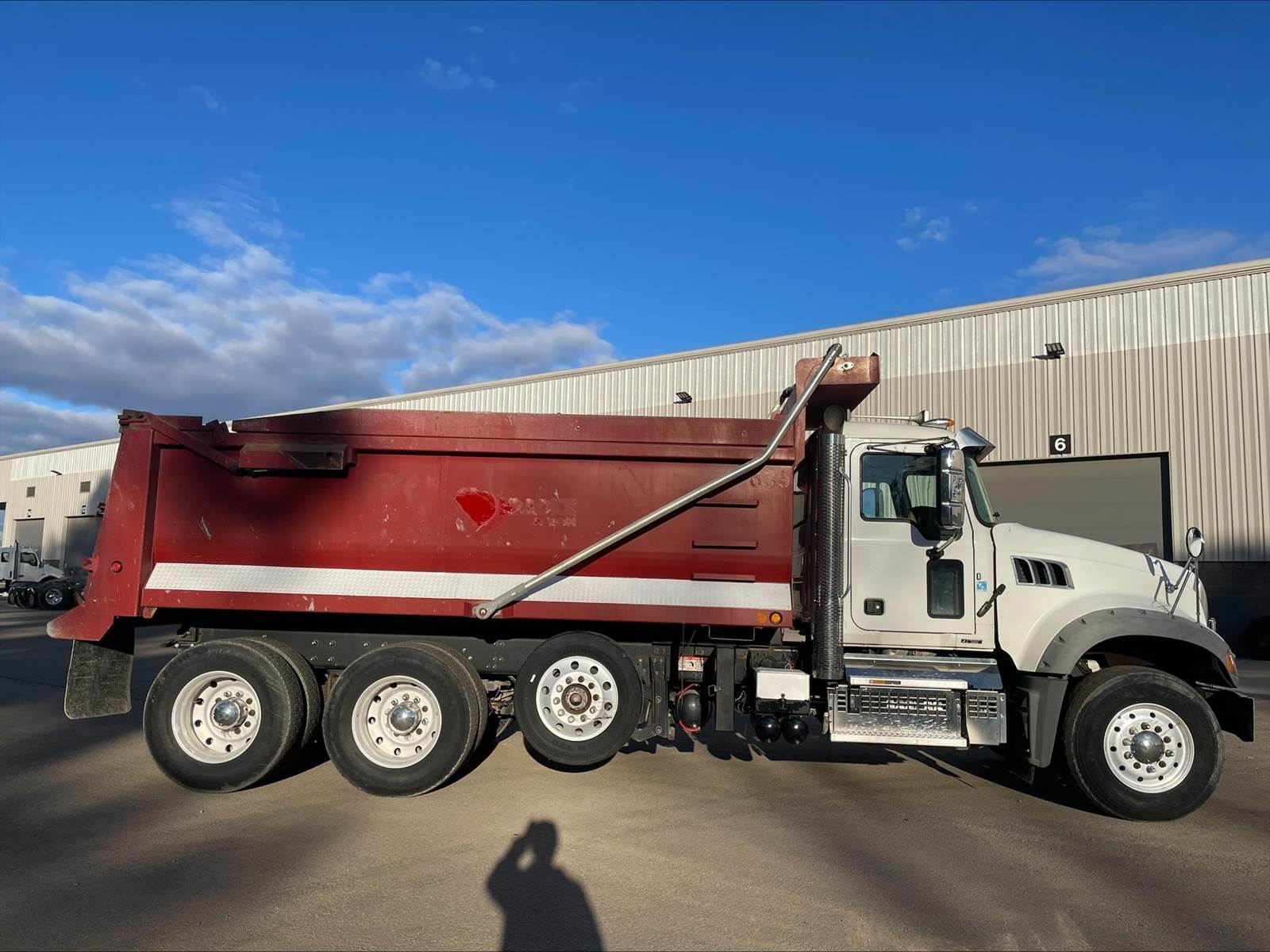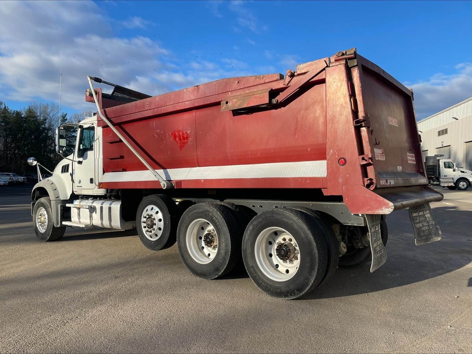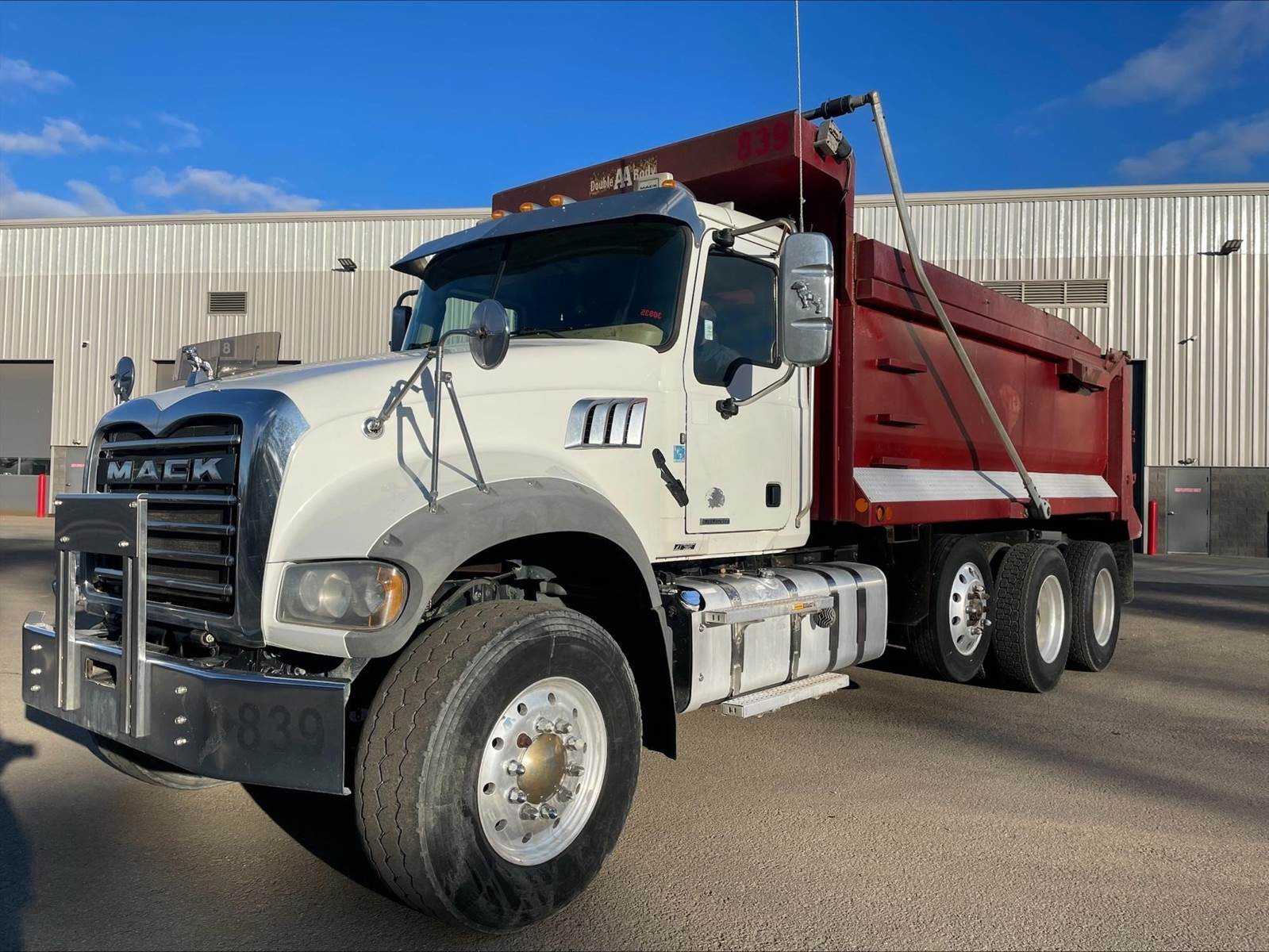 Triaxle, 17' Double A Steel Dump w/50" Sides, High Lift Gate, MP8 Mack 455 HP, Allison Automatic, 3.98 Ratio, 3 Stage Engine Brake, Camelback, Double Frame, 20K FA, 46K RA, Steerable L/A, 230" WB, 21'4" Bridge, Diff Lock, Wheel Lock, Electric Tarp, Air/High Lift Tailgate, Bed Vibrator, P/S, A/C, AM/FM CD Bluetooth, Heated Mirrors, Cruise, Tilt/Tele Wheel, Power Windows, Locks, and Mirrors, High Back Seats, 125 Gallon Aluminum Fuel Tank, 385/65R22.5 Steer Tires on Aluminum Wheels, 11R24.5 Drive Tires on All Aluminum Wheels, Chrome Bumper