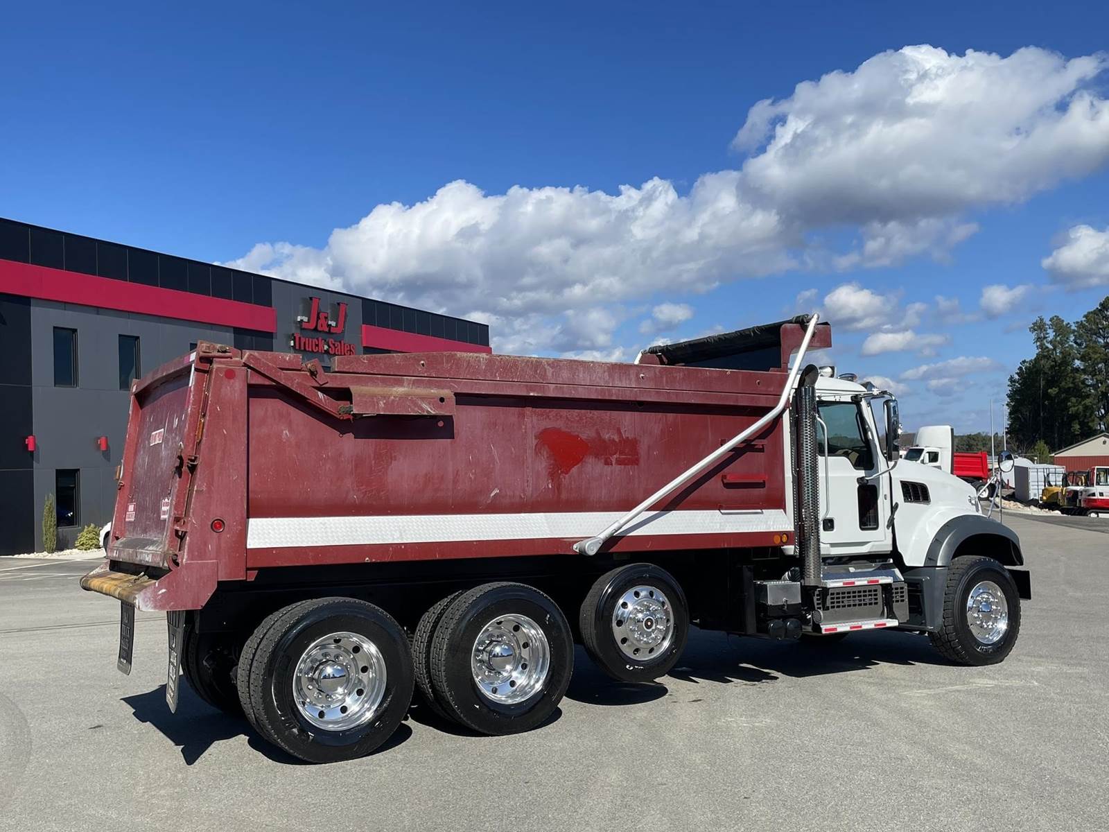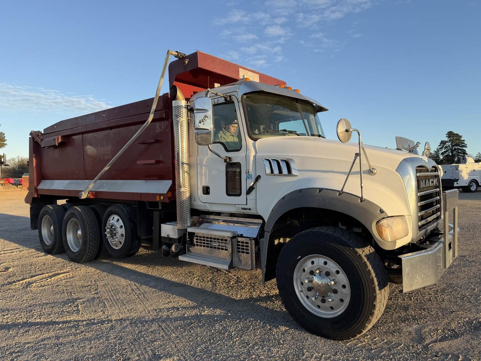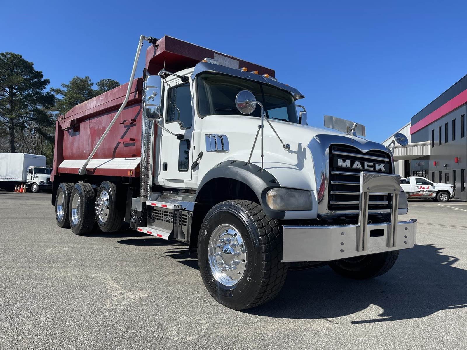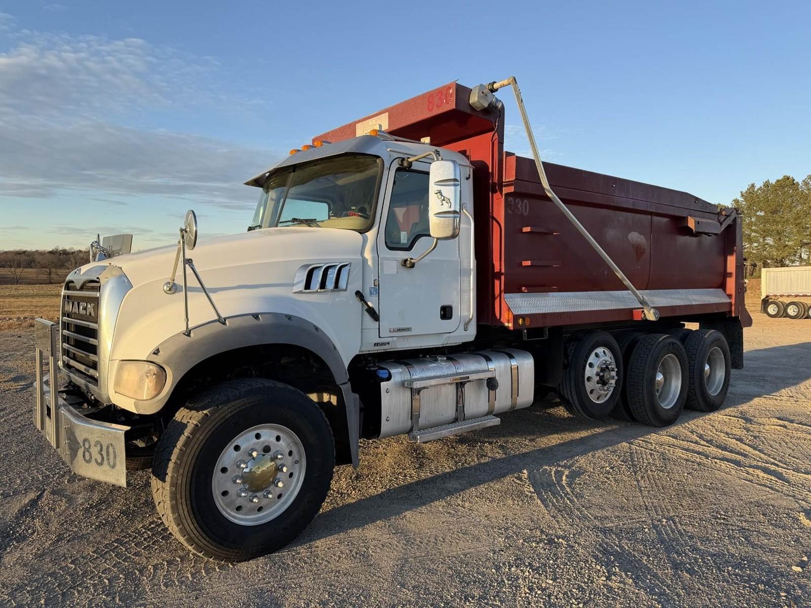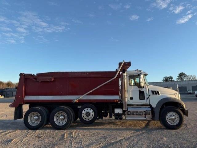 Triaxle, 17' Double A Steel Dump w/50" Sides, High Lift Gate, MP8 Mack 455 HP, Allison Automatic, 3.98 Ratio, 3 Stage Engine Brake, Camelback, Double Frame, 20K FA, 46K RA, Steerable L/A, 230" WB, 21'4" Bridge, Diff Lock, Wheel Lock, Electric Tarp, Air/High Lift Tailgate, Bed Vibrator, P/S, A/C, AM/FM CD Bluetooth, Heated Mirrors, Cruise, Tilt/Tele Wheel, Power Windows, Locks, and Mirrors, High Back Seats, 125 Gallon Aluminum Fuel Tank, 385/65R22.5 Steer Tires on Aluminum Wheels, 11R24.5 Drive Tires on All Aluminum Wheels, Chrome Bumper