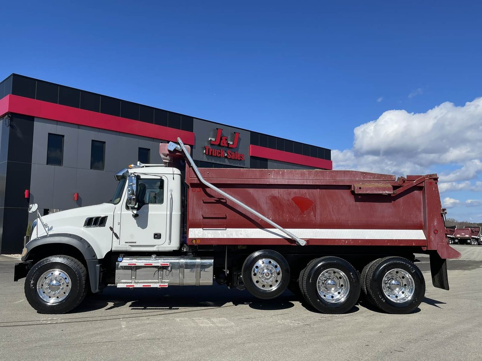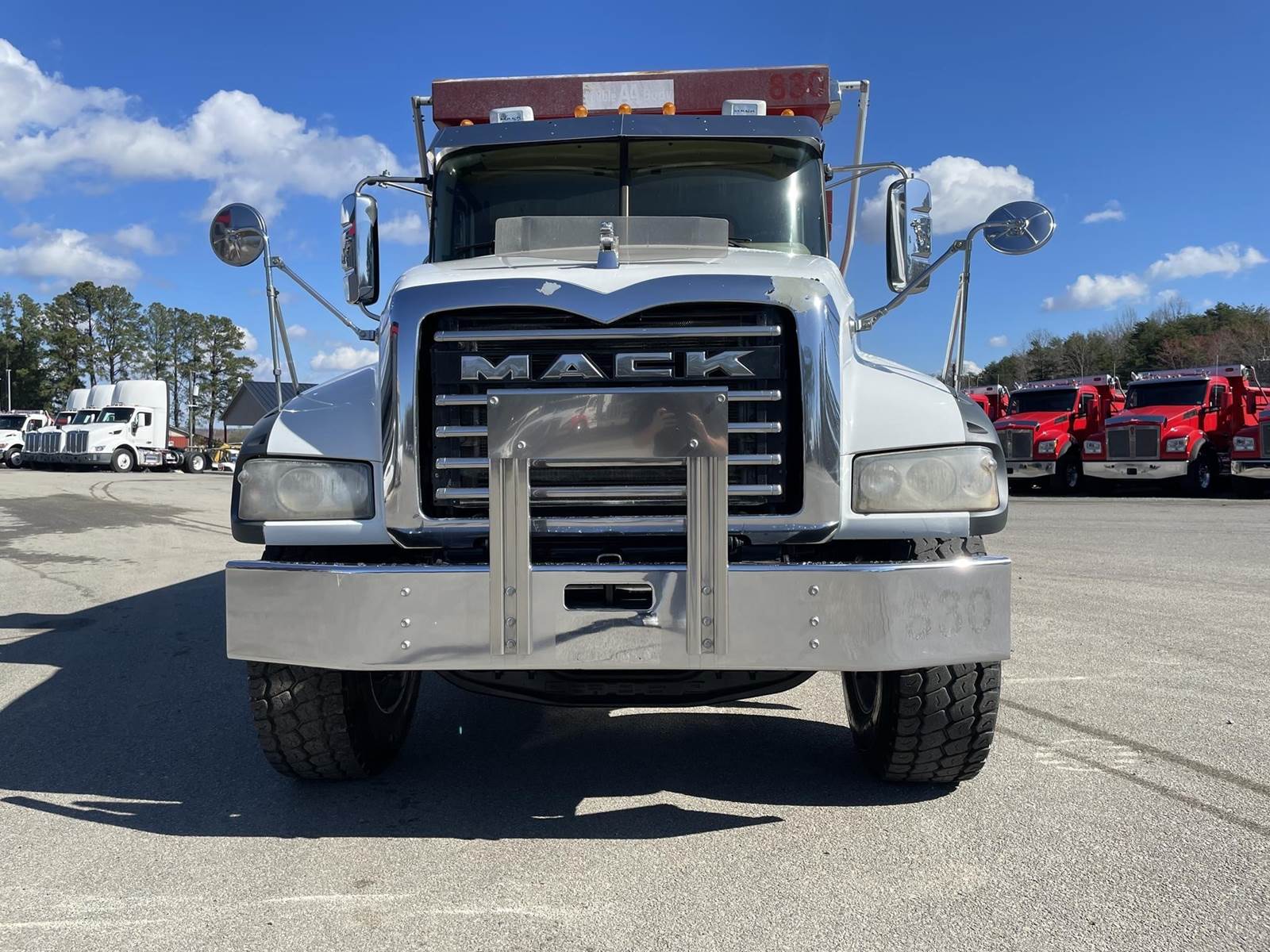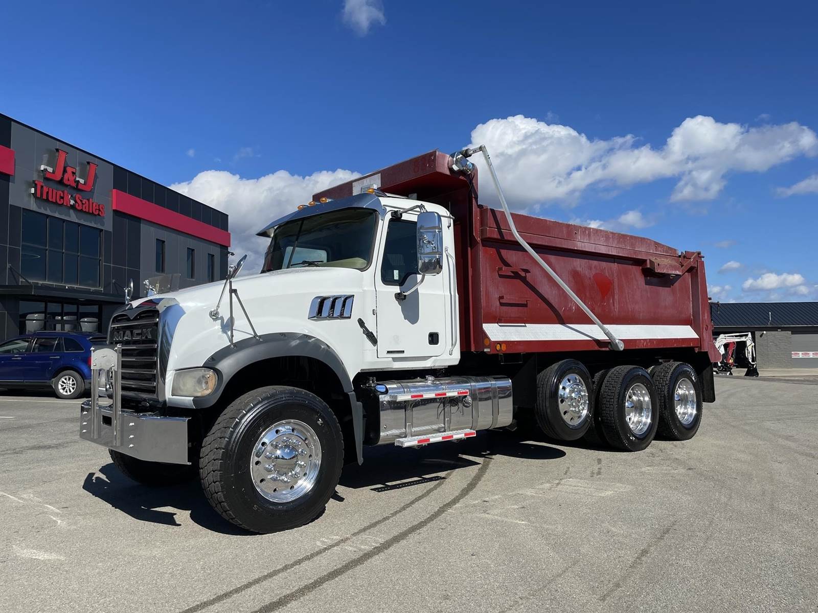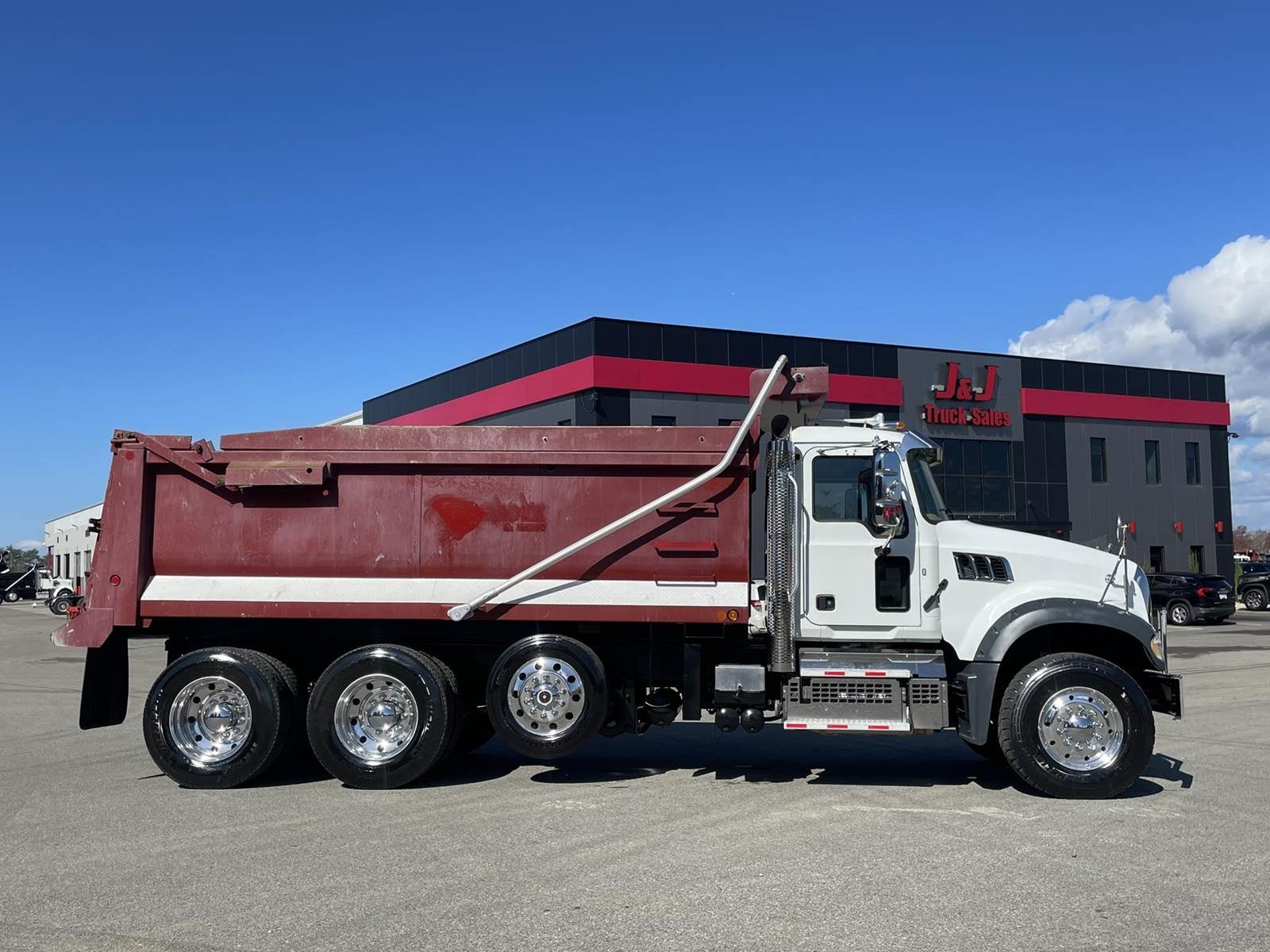 Triaxle, 17' Double A Steel Dump w/50" Sides, High Lift Gate, MP8 Mack 455 HP, Allison Automatic, 3.98 Ratio, 3 Stage Engine Brake, Camelback, Double Frame, 20K FA, 46K RA, Steerable L/A, 230" WB, 21'4" Bridge, Diff Lock, Wheel Lock, Electric Tarp, Air/High Lift Tailgate, Bed Vibrator, P/S, A/C, AM/FM CD Bluetooth, Heated Mirrors, Cruise, Tilt/Tele Wheel, Power Windows, Locks, and Mirrors, High Back Seats, 125 Gallon Aluminum Fuel Tank, 385/65R22.5 Steer Tires on Aluminum Wheels, 11R24.5 Drive Tires on All Aluminum Wheels, Chrome Bumper