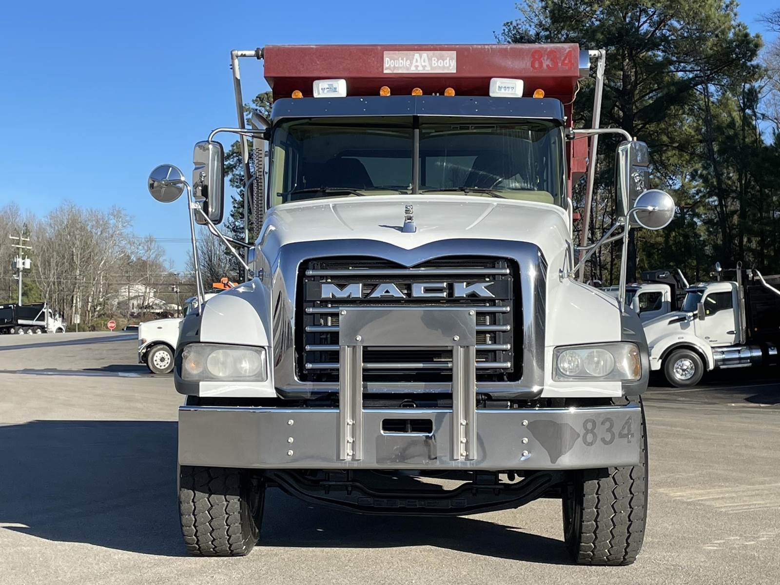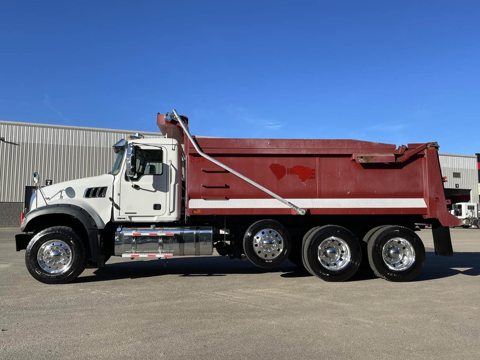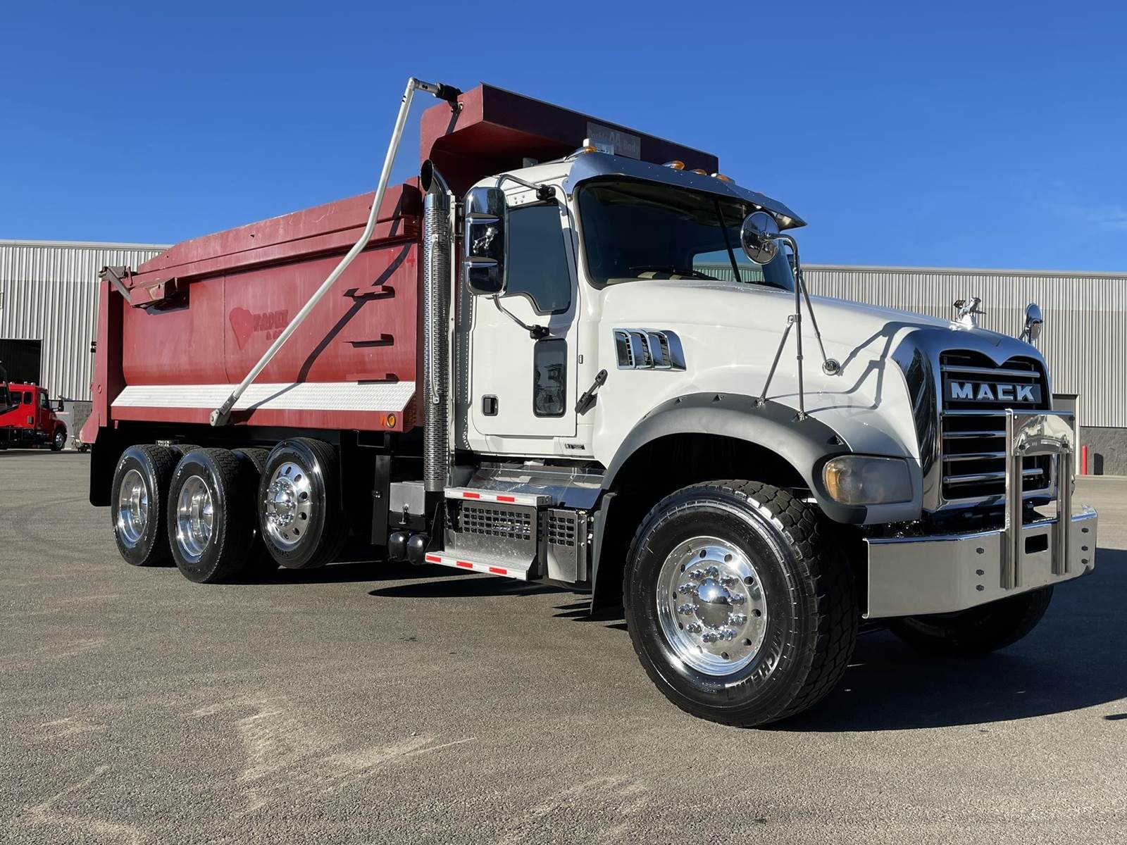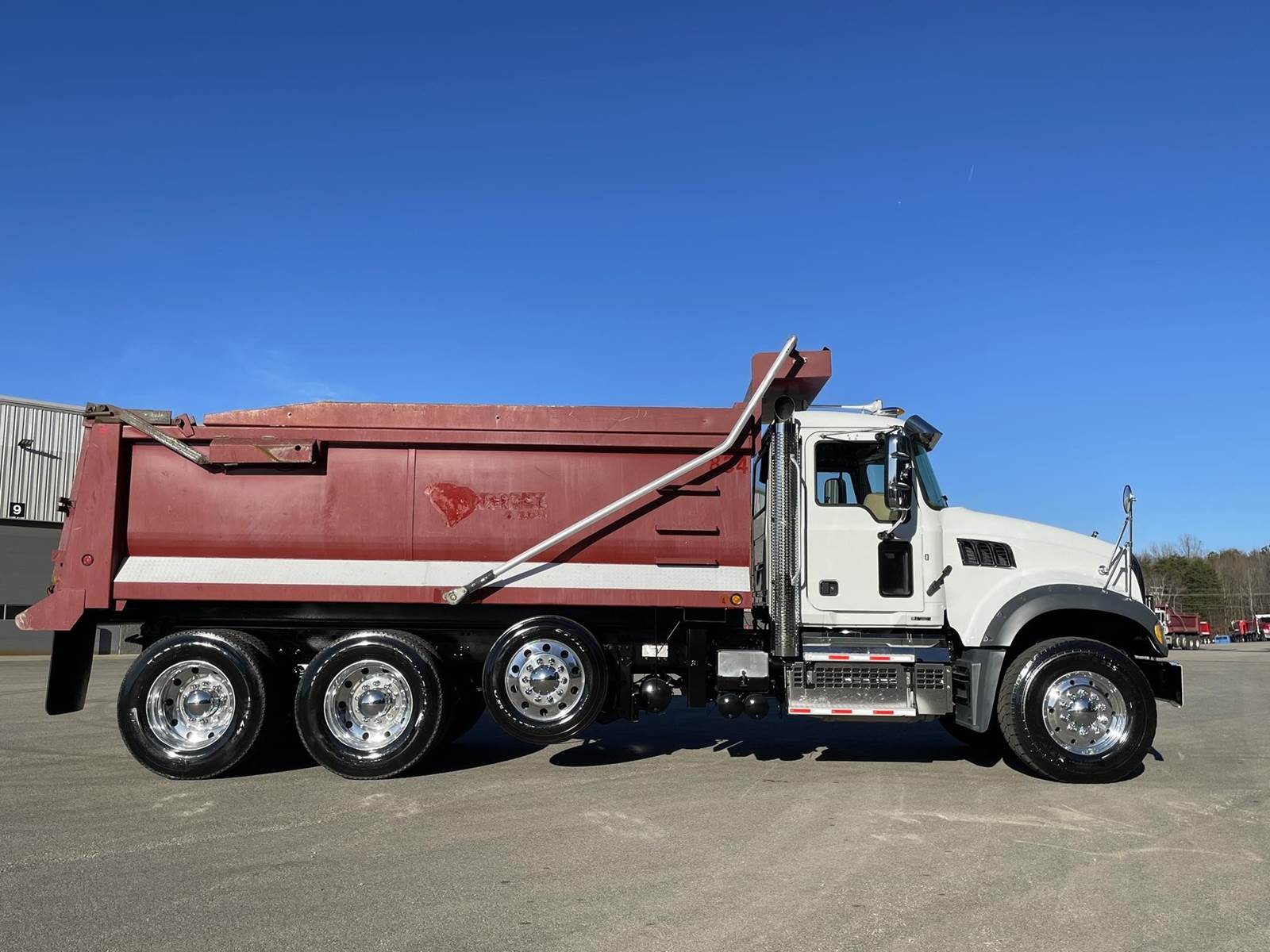 Triaxle, 17' Double A Steel Dump w/50" Sides, High Lift Gate, MP8 Mack 455 HP, Allison Automatic, 3.98 Ratio, 3 Stage Engine Brake, Camelback, Double Frame, 20K FA, 46K RA, Steerable L/A, 230" WB, 21'4" Bridge, Diff Lock, Wheel Lock, Electric Tarp, Air/High Lift Tailgate, Bed Vibrator, P/S, A/C, AM/FM CD Bluetooth, Heated Mirrors, Cruise, Tilt/Tele Wheel, Power Windows, Locks, and Mirrors, High Back Seats, 125 Gallon Aluminum Fuel Tank, 385/65R22.5 Steer Tires on Aluminum Wheels, 11R24.5 Drive Tires on All Aluminum Wheels, Chrome Bumper
