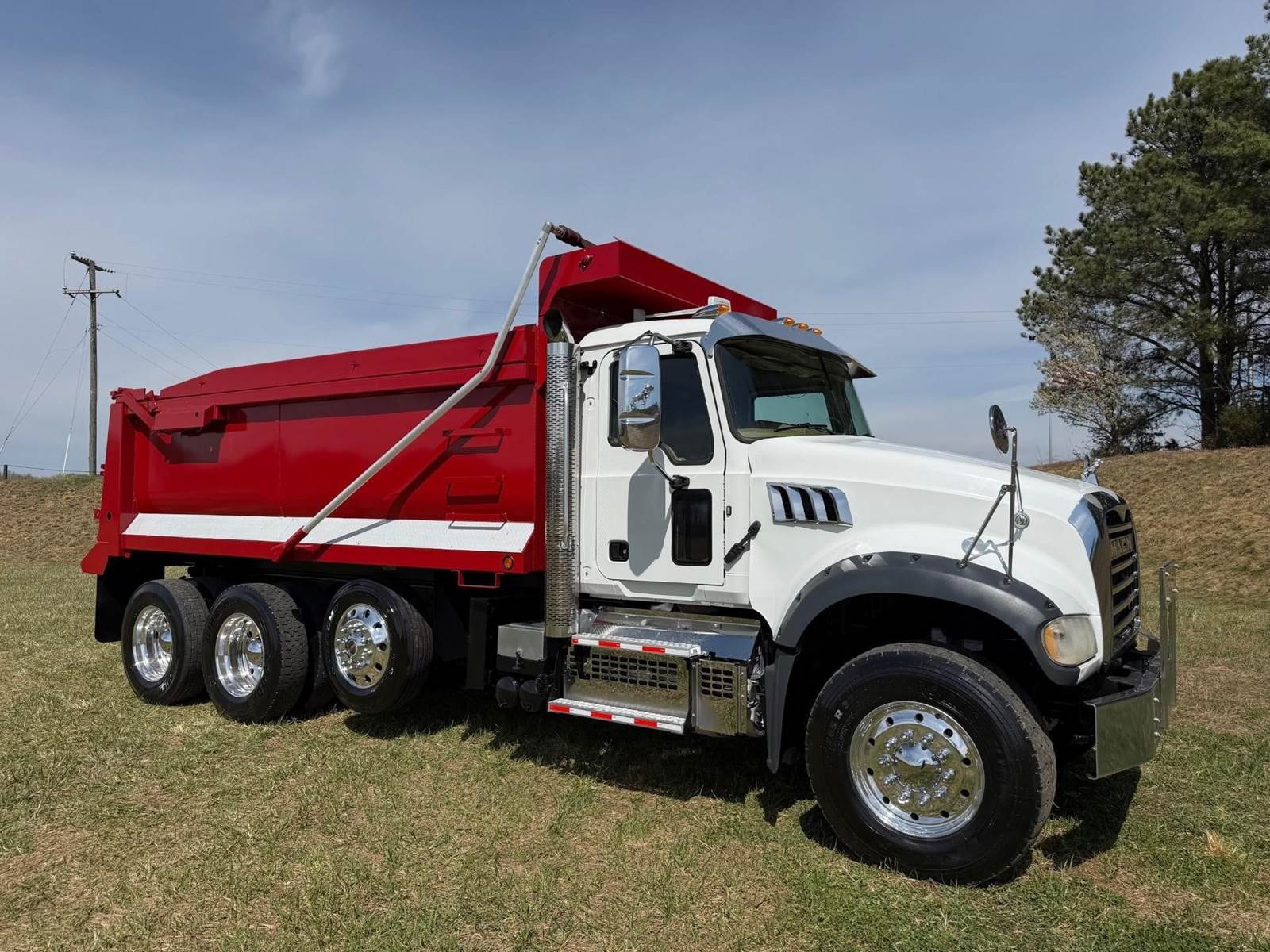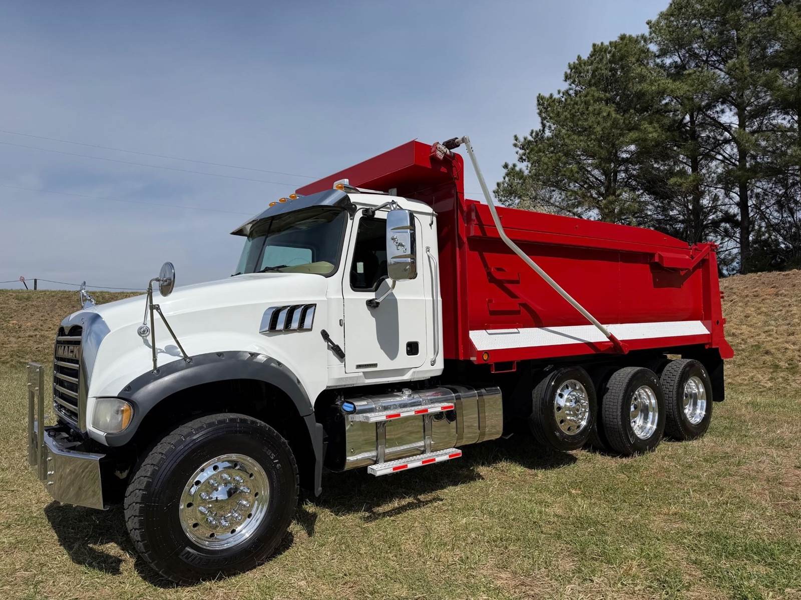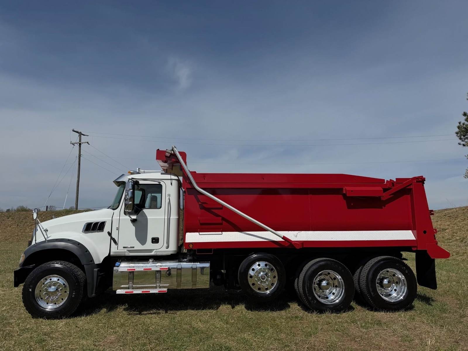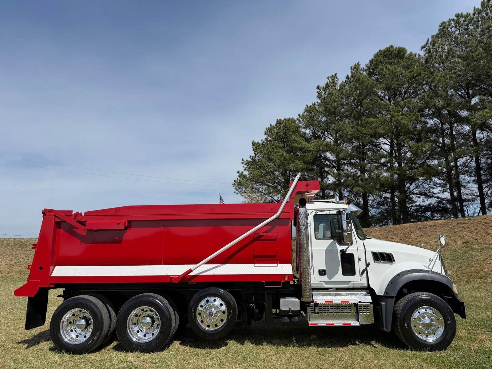 Triaxle, 17' Double A Steel Dump w/50" Sides, High Lift Gate, MP8 Mack 455 HP, Allison Automatic, 3.98 Ratio, 3 Stage Engine Brake, Camelback, Double Frame, 20K FA, 46K RA, Steerable L/A, 230" WB, 21'4" Bridge, Diff Lock, Wheel Lock, Electric Tarp, Air/High Lift Tailgate, Bed Vibrator, P/S, A/C, AM/FM CD Bluetooth, Heated Mirrors, Cruise, Tilt/Tele Wheel, Power Windows, Locks, and Mirrors, High Back Seats, 125 Gallon Aluminum Fuel Tank, 385/65R22.5 Steer Tires on Aluminum Wheels, 11R24.5 Drive Tires on All Aluminum Wheels, Chrome Bumper
