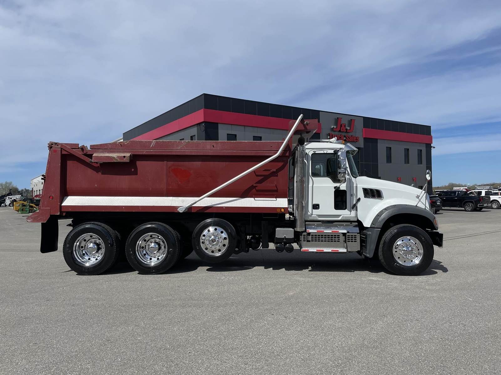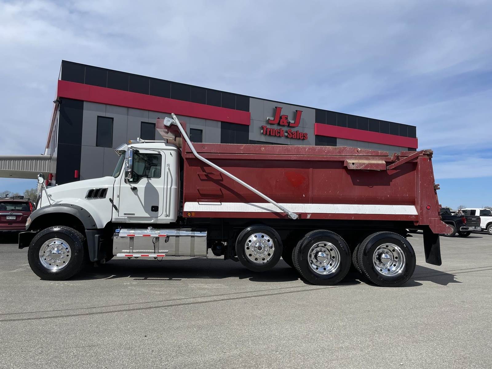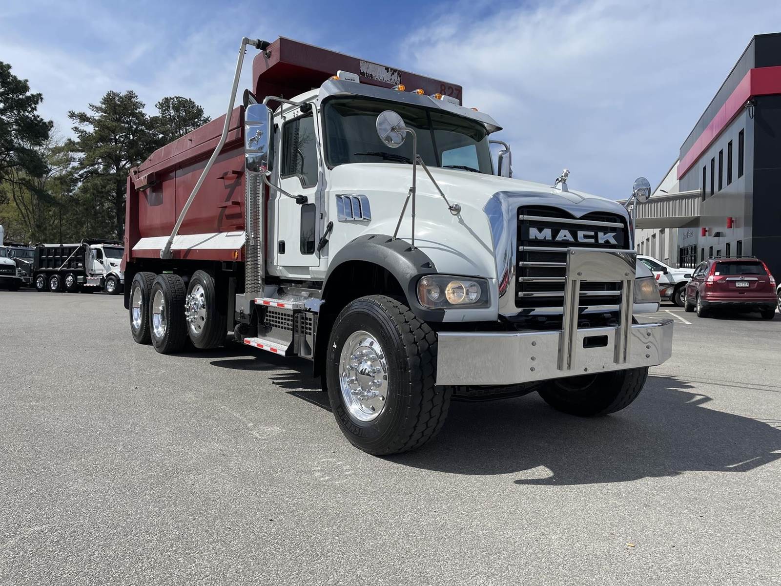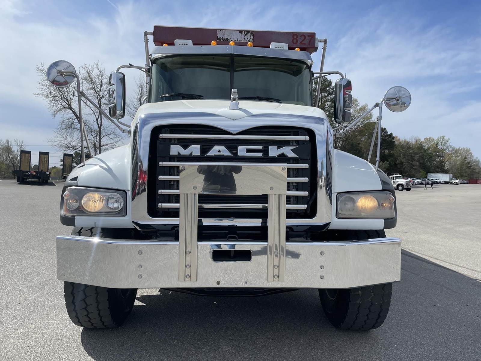 Triaxle, 17' Double A Steel Dump w/50" Sides, High Lift Gate, MP8 Mack 455 HP, Allison Automatic, 3.98 Ratio, 3 Stage Engine Brake, Camelback, Double Frame, 20K FA, 46K RA, Steerable L/A, 230" WB, 21'4" Bridge, Diff Lock, Wheel Lock, Electric Tarp, Air/High Lift Tailgate, Bed Vibrator, P/S, A/C, AM/FM CD Bluetooth, Heated Mirrors, Cruise, Tilt/Tele Wheel, Power Windows, Locks, and Mirrors, High Back Seats, 125 Gallon Aluminum Fuel Tank, 385/65R22.5 Steer Tires on Aluminum Wheels, 11R24.5 Drive Tires on All Aluminum Wheels, Chrome Bumper